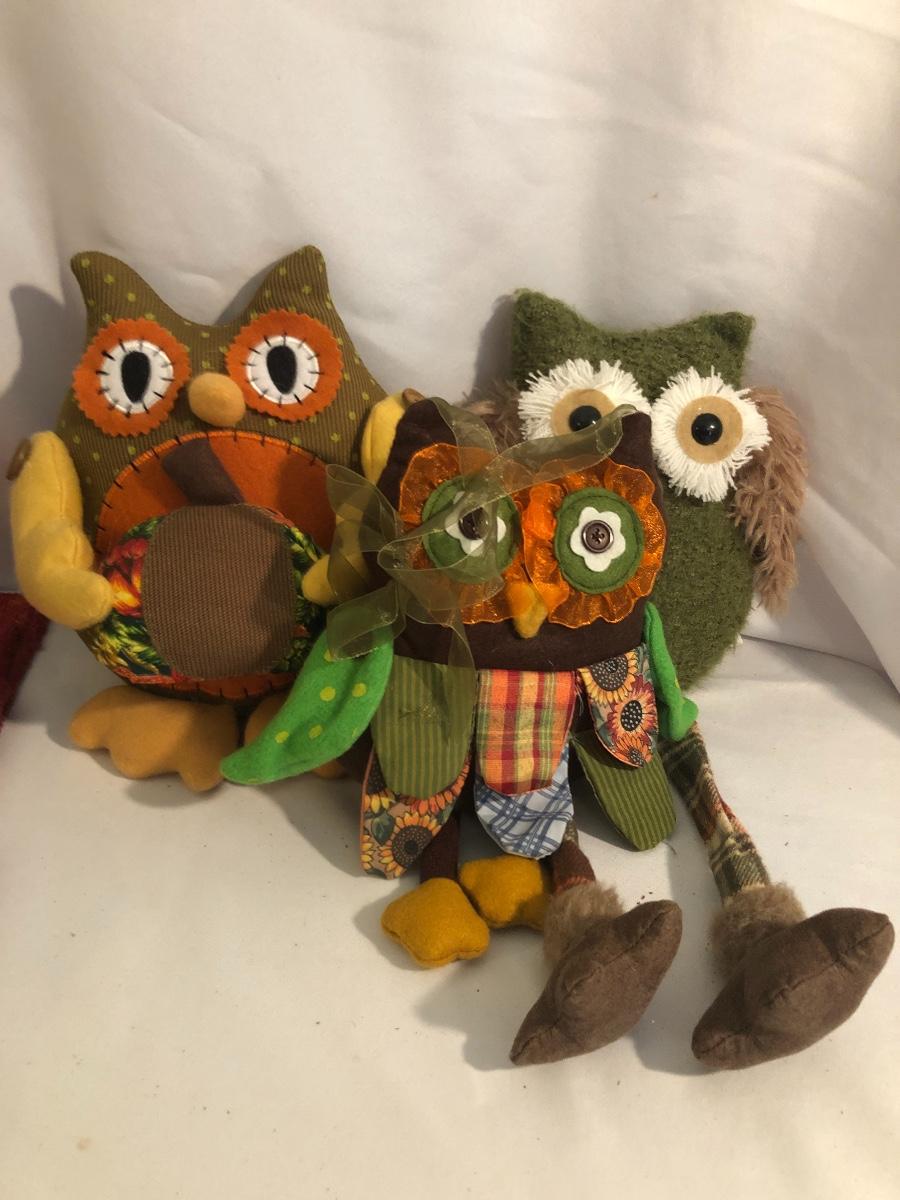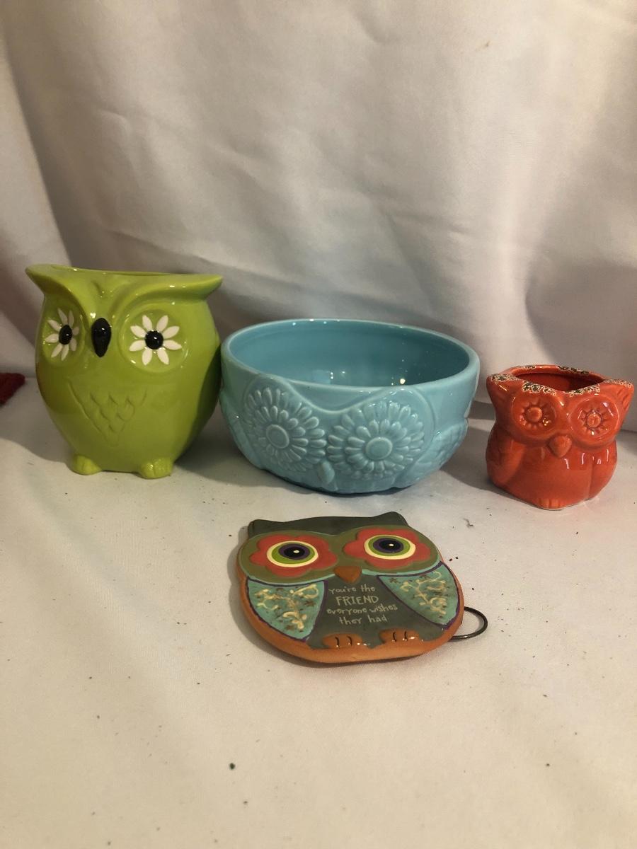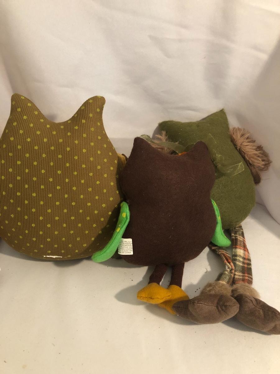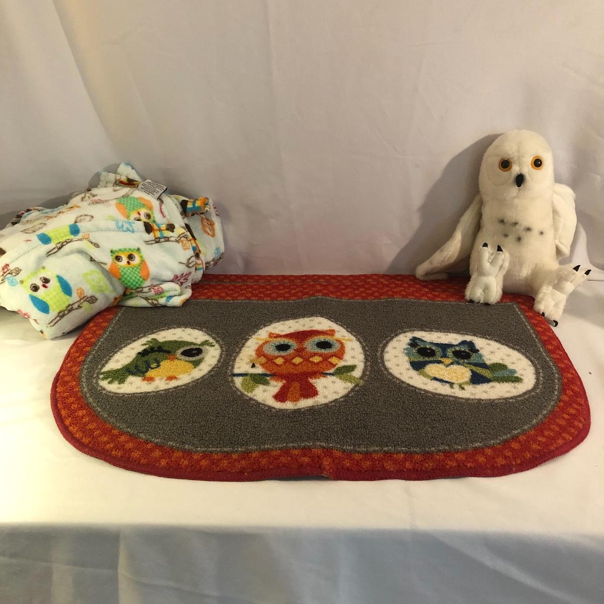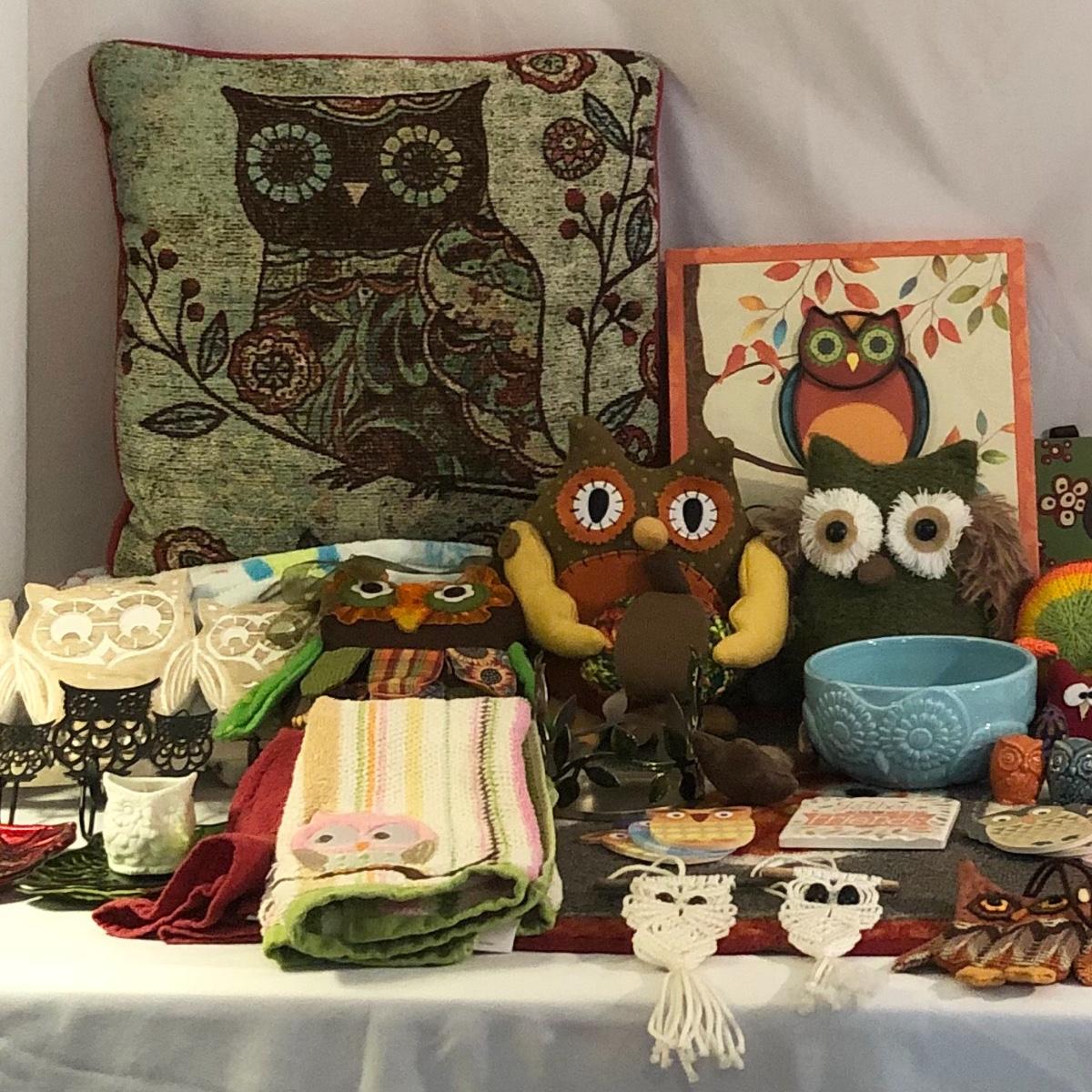 For those folks who give a hoot, is this large collection of whimsical owls. This lot includes three door mats, two pillows, heavy metal doorstop, three dish towels, hanger, bowl, artwork and more. It also includes an array of stuffed toy owls. Doorstop measures 3” x 10” x 13”.