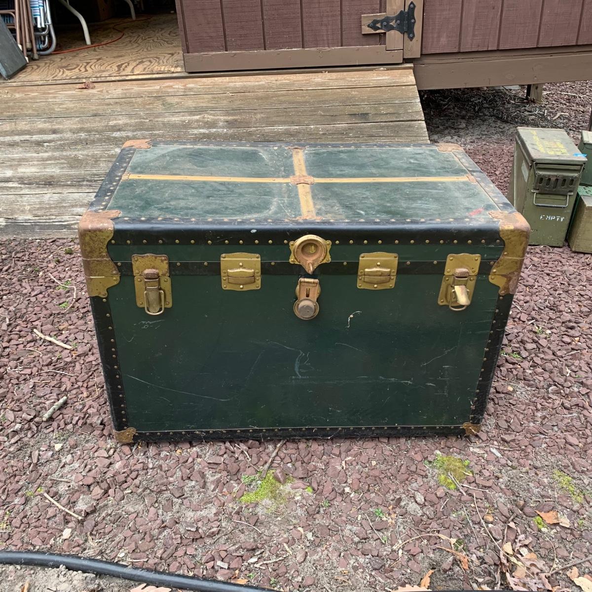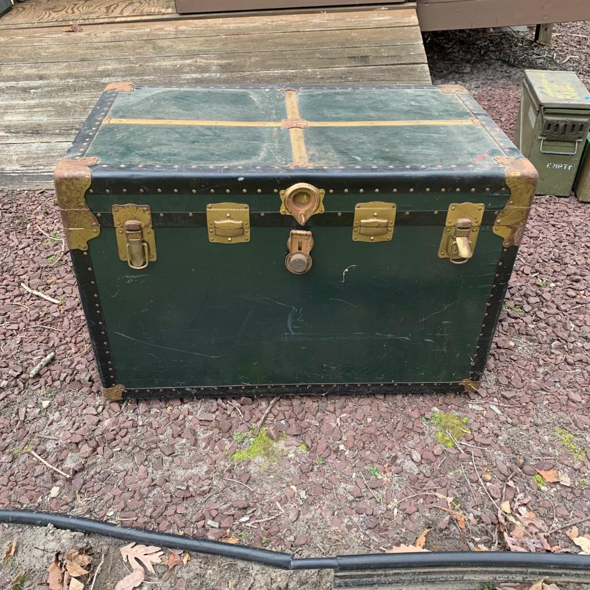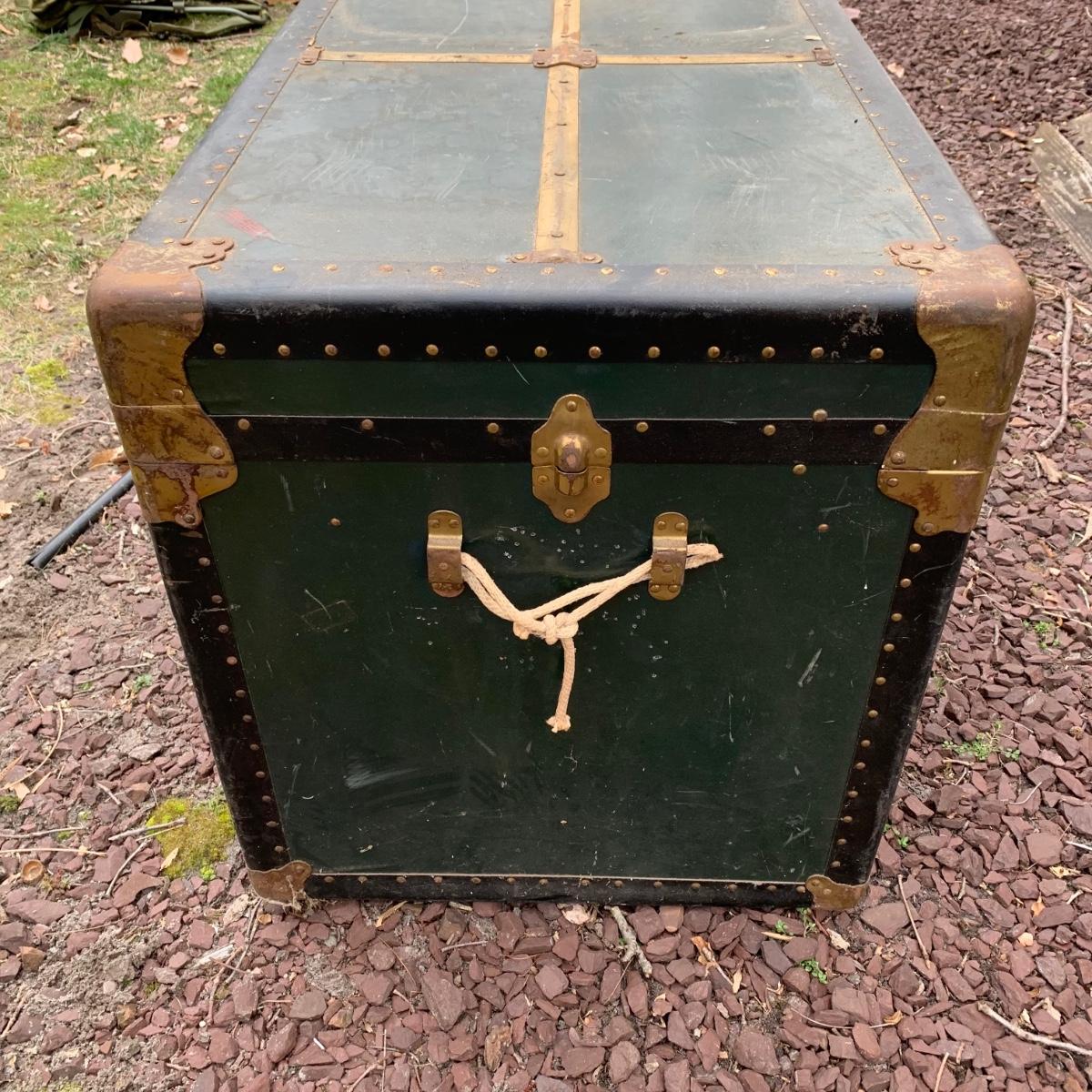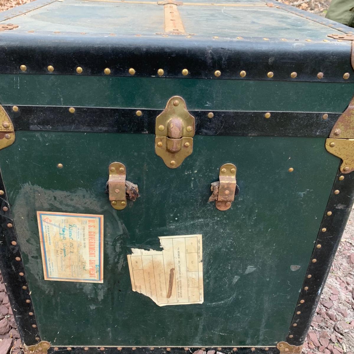 Lot 172R: US Government Shipping Trunk: Genuine Vulcanized Trunk Green w/Brass Accents