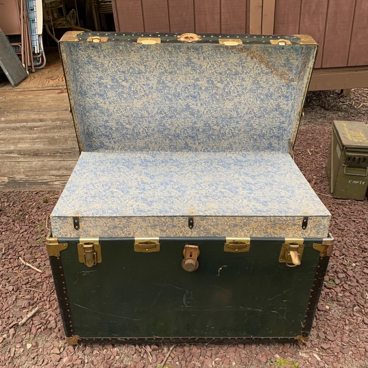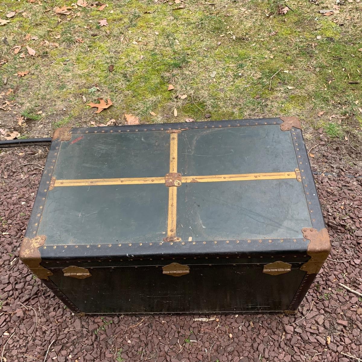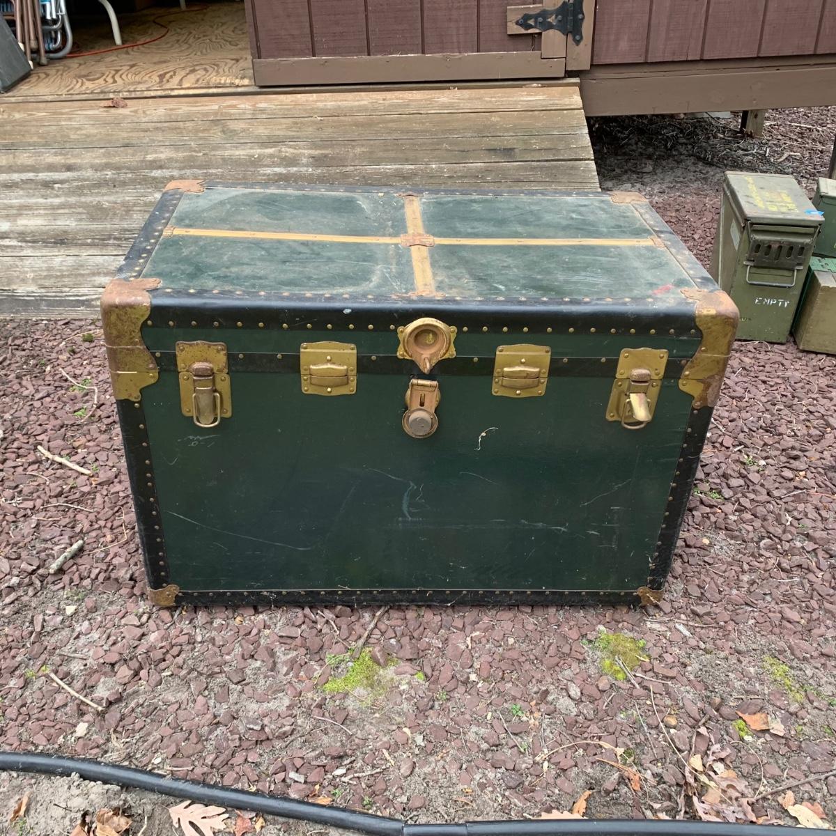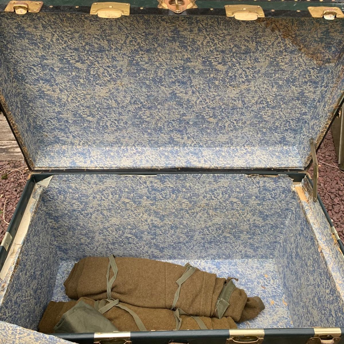 Lot 172R: US Government Shipping Trunk: Genuine Vulcanized Trunk Green w/Brass Accents