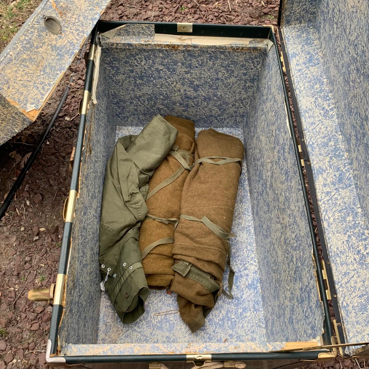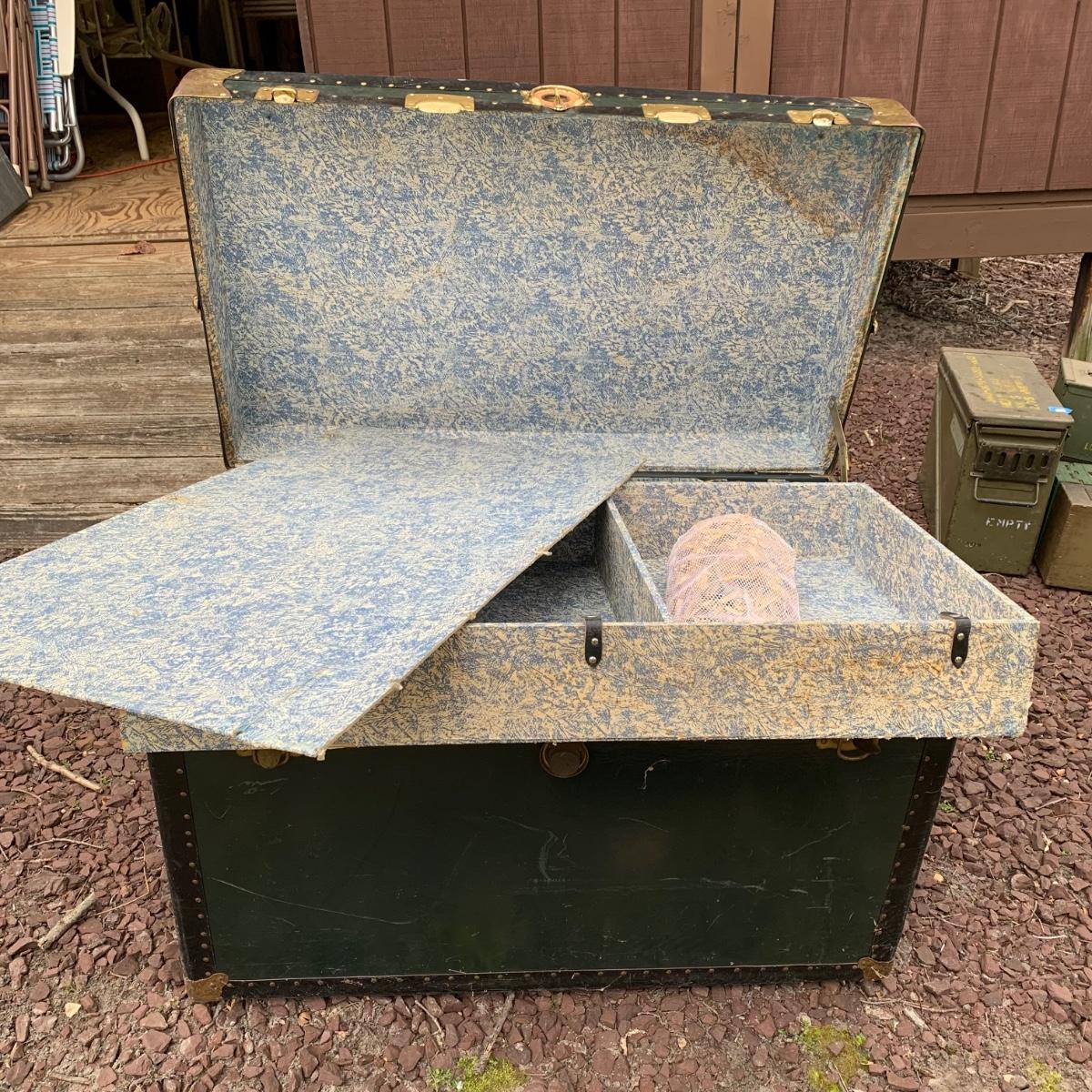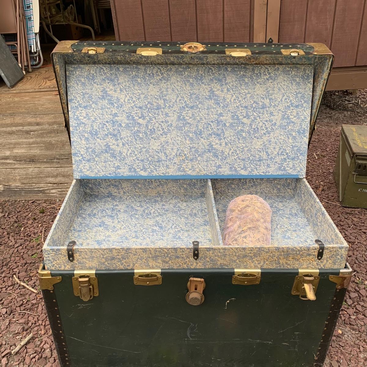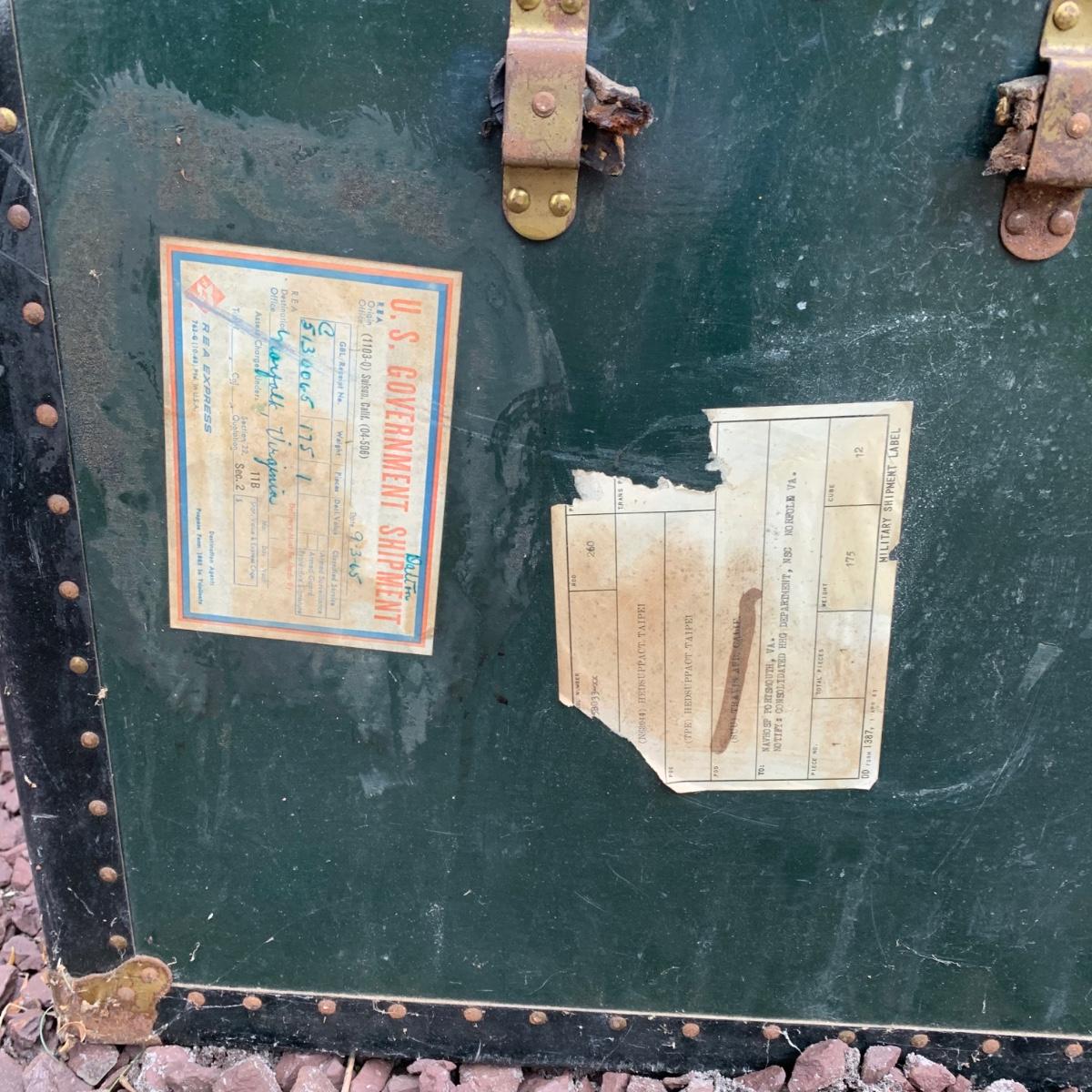 Lot 172R: US Government Shipping Trunk: Genuine Vulcanized Trunk Green w/Brass Accents