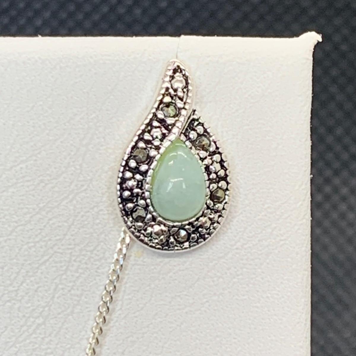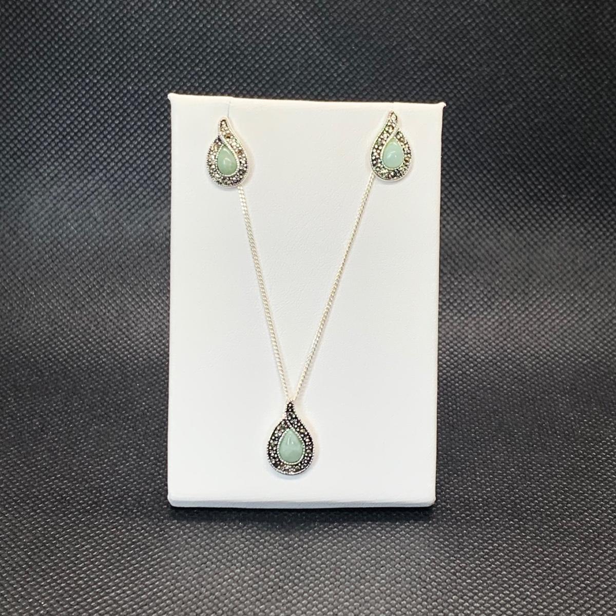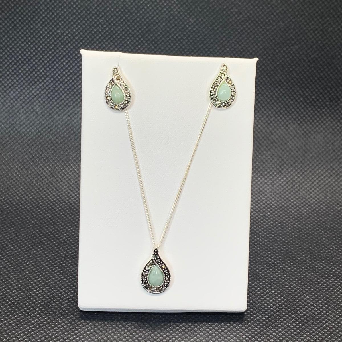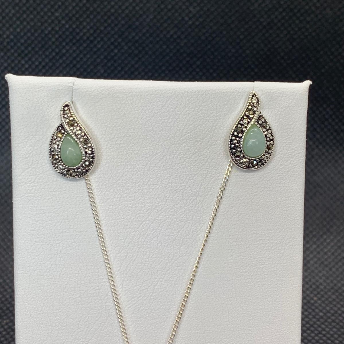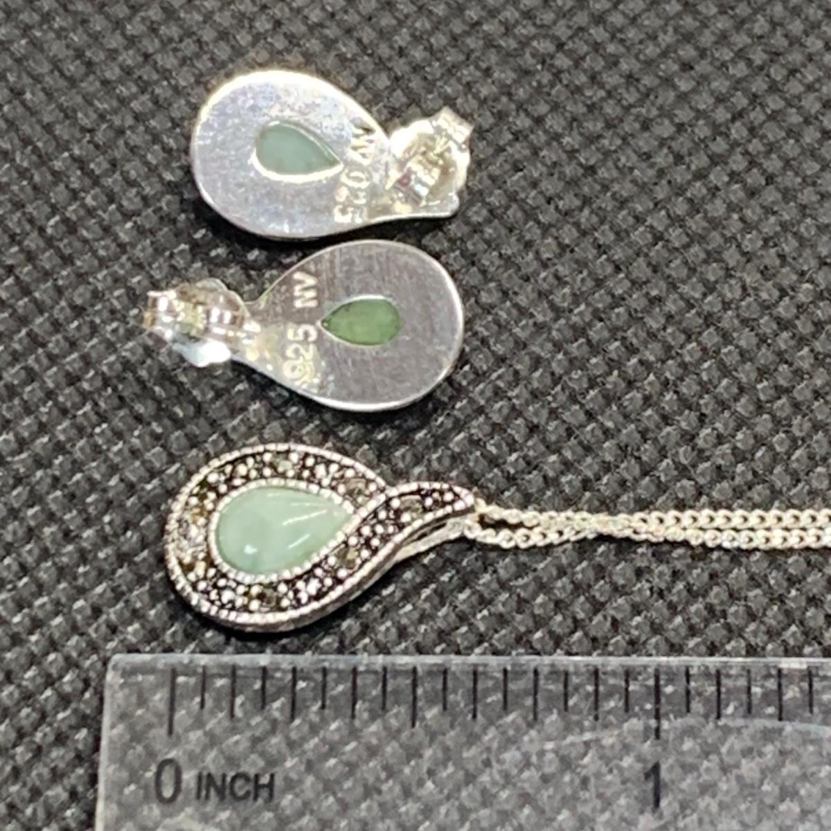 Lot 173: Nevada Sterling Silver, Jade & Marcasite Necklace 20" & Earring Set