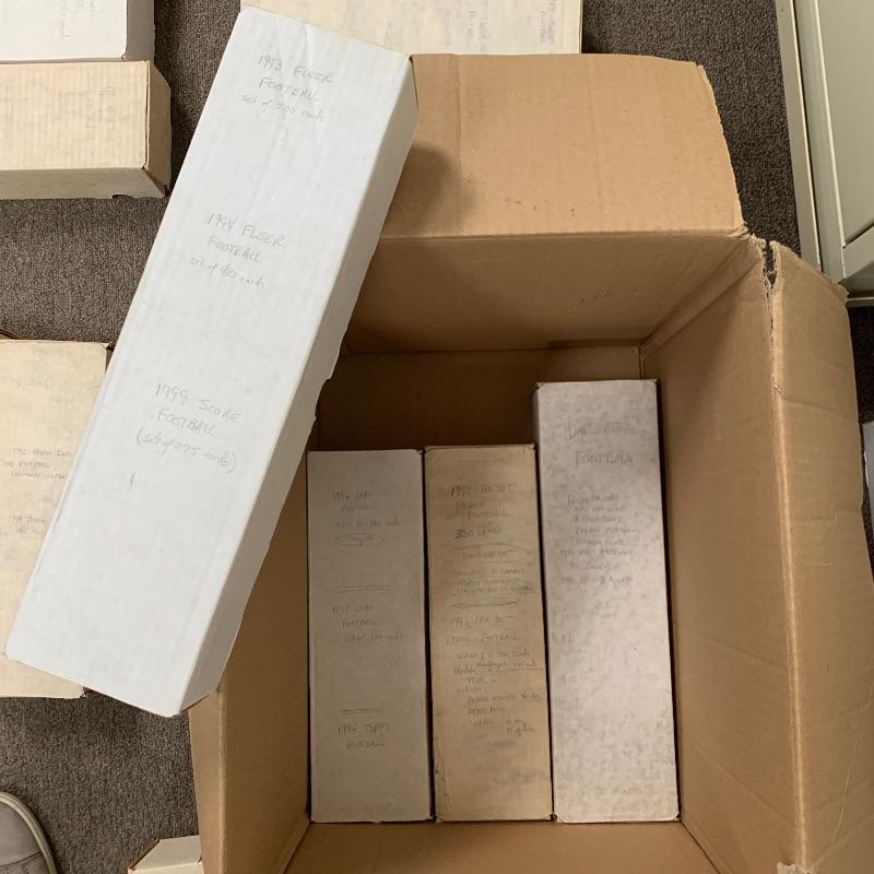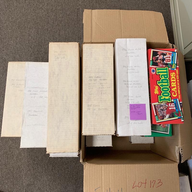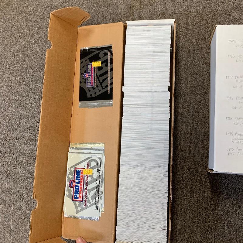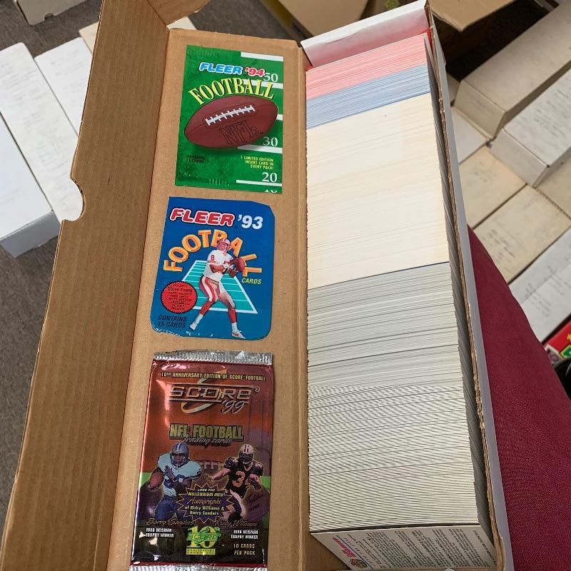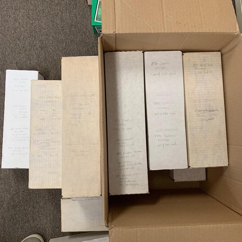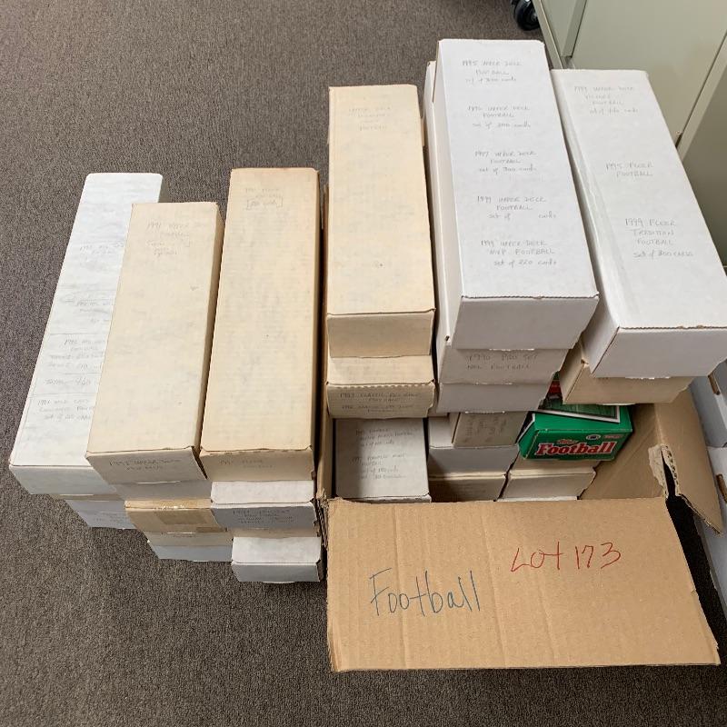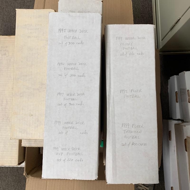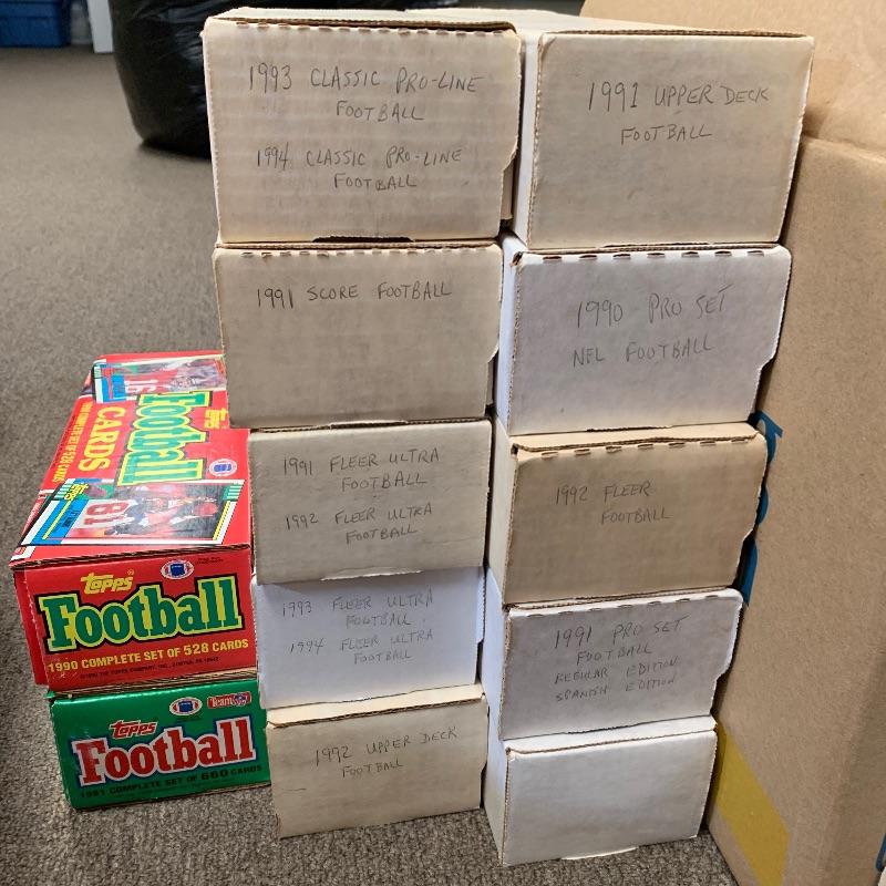 This large lot of thirty- four boxes or pro football trading cards has unverified sets of Topps, Fleer Ultra, Pro Set (Classic and Platinum), Upper Deck, Pinnacle, Score, and more from 1990-1999. Please not that sets have not been verified and it is assumed all nots on larger boxes are accurate on the contents. There are duplicates in this lot.