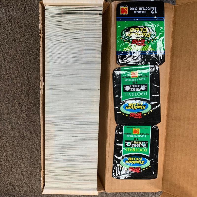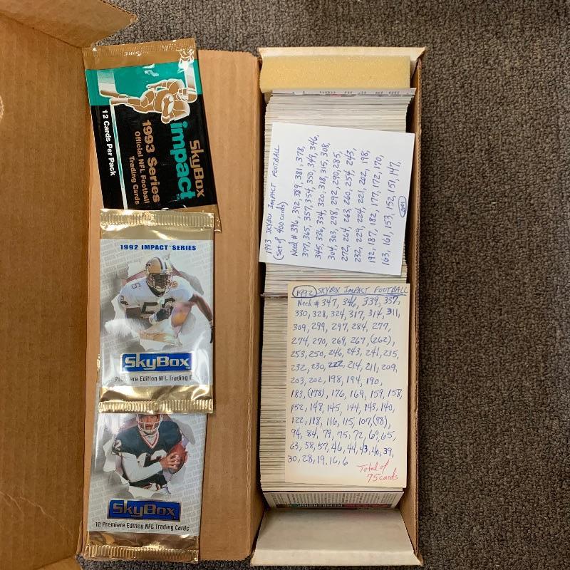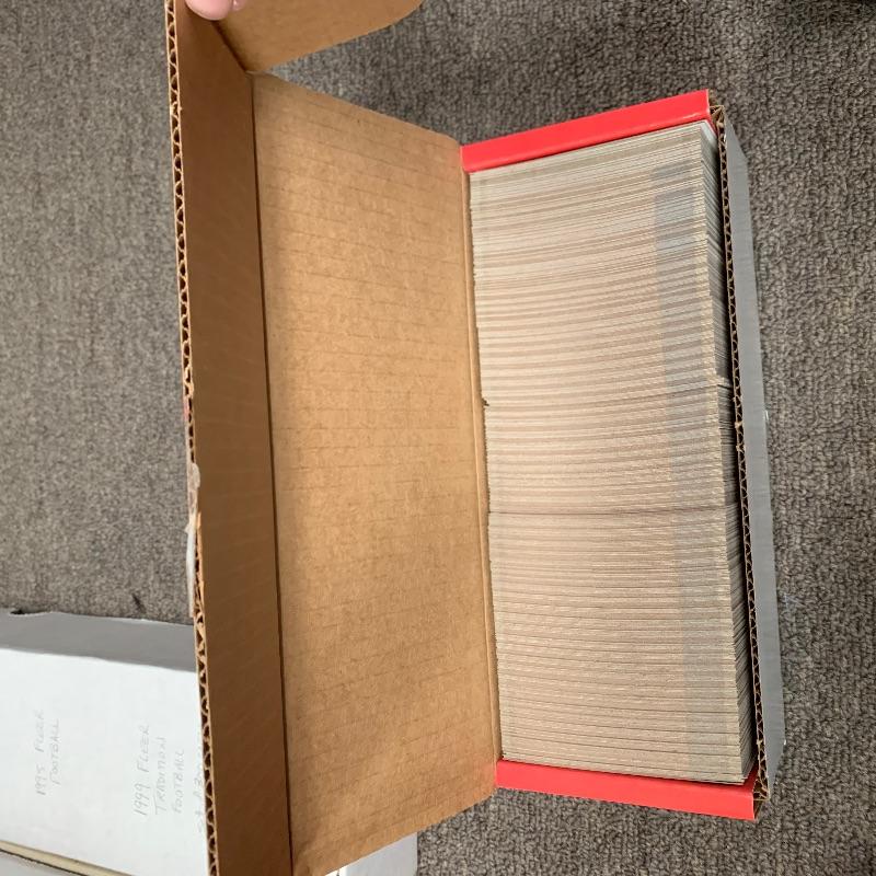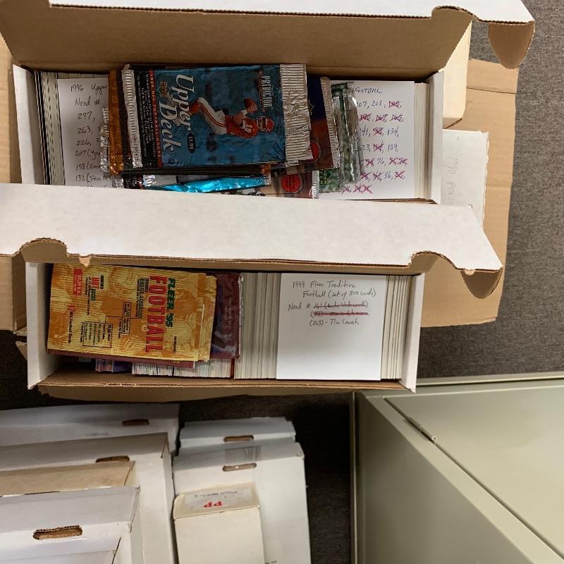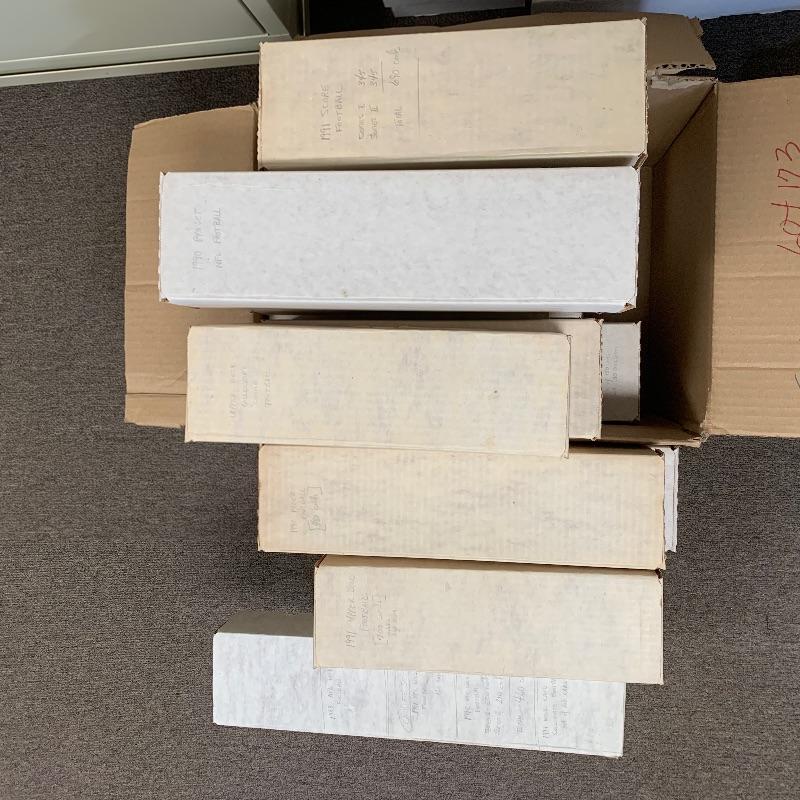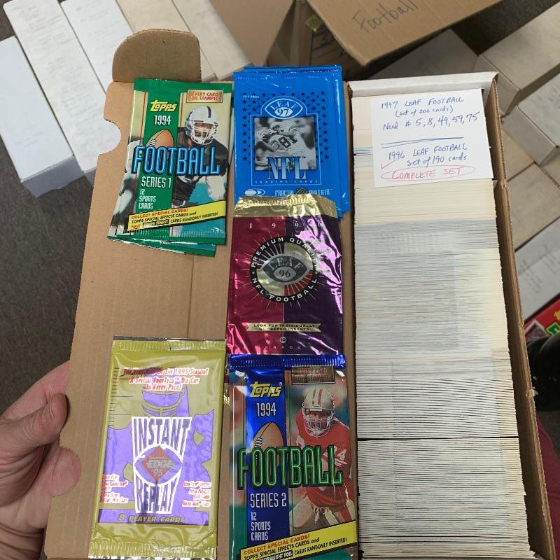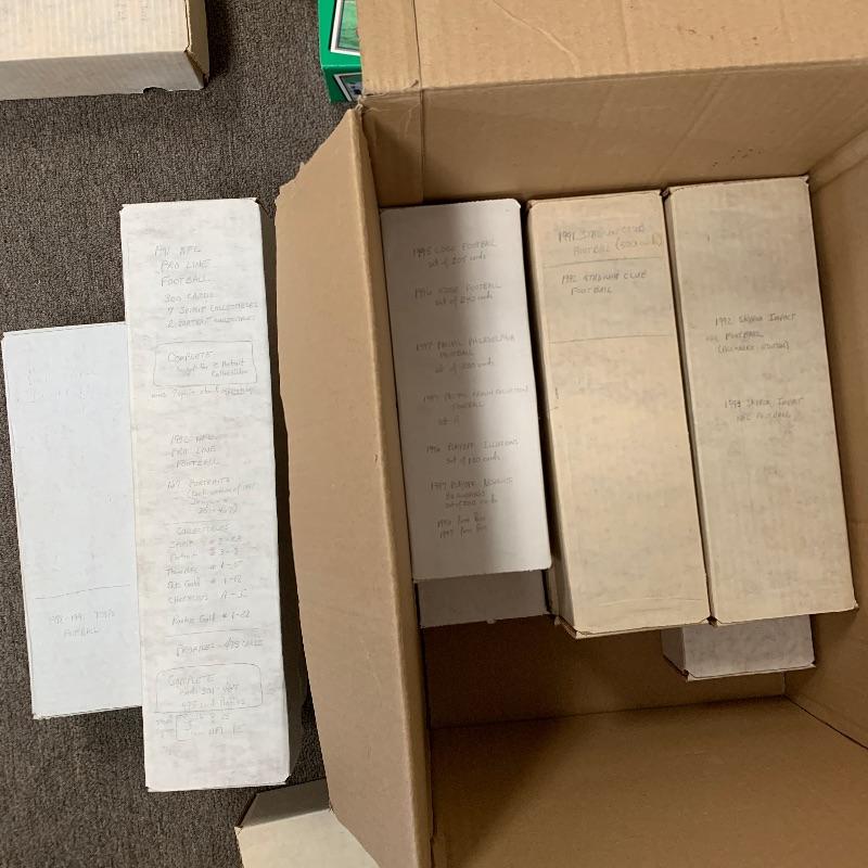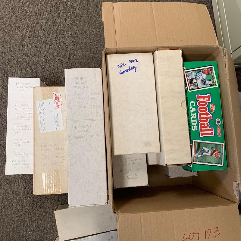 This large lot of thirty- four boxes or pro football trading cards has unverified sets of Topps, Fleer Ultra, Pro Set (Classic and Platinum), Upper Deck, Pinnacle, Score, and more from 1990-1999. Please not that sets have not been verified and it is assumed all nots on larger boxes are accurate on the contents. There are duplicates in this lot.