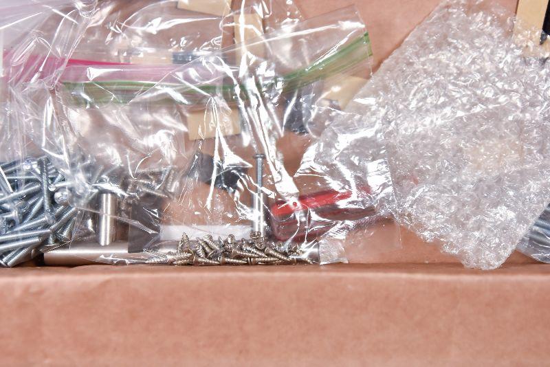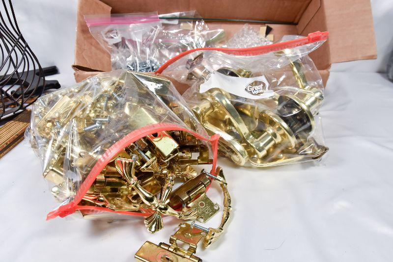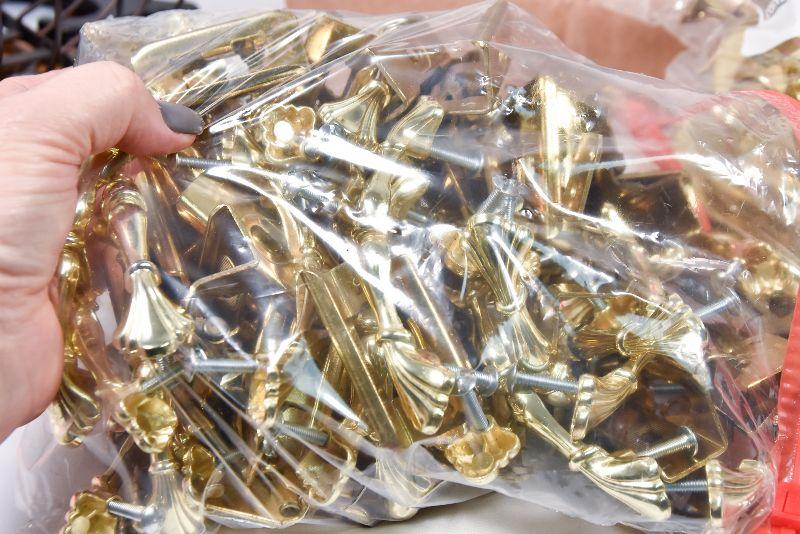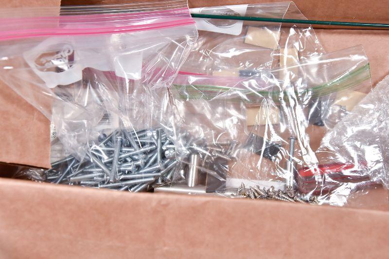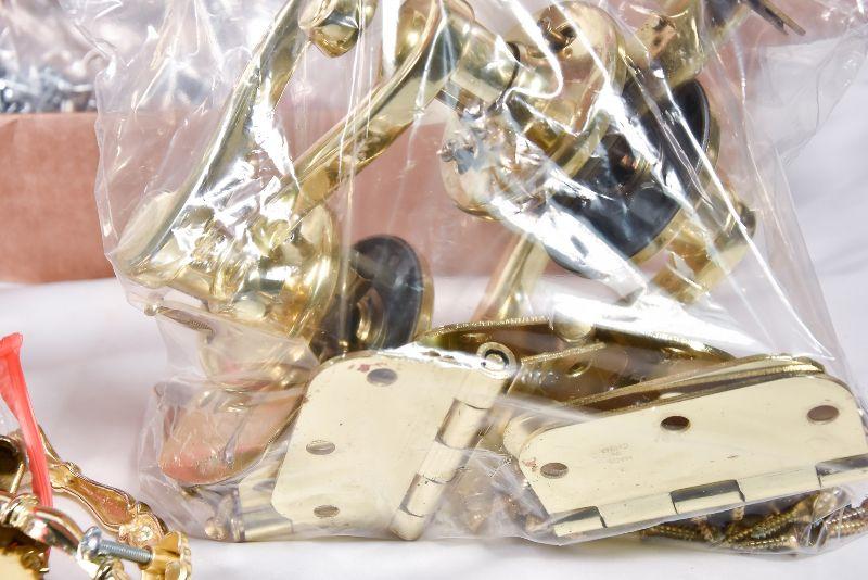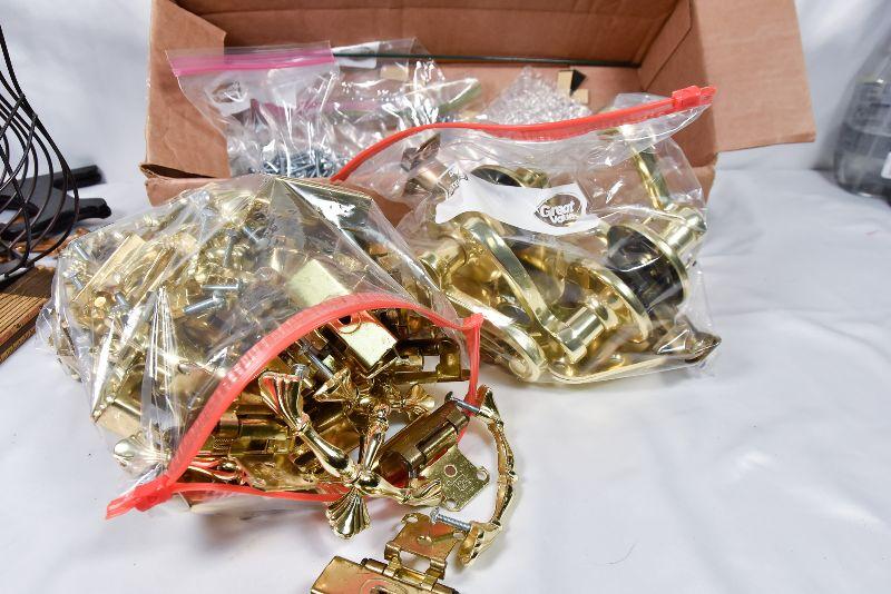 Box lot of Hinges, draw handles, door handles, screws, and more