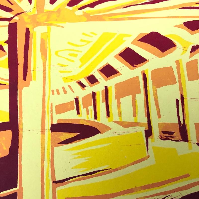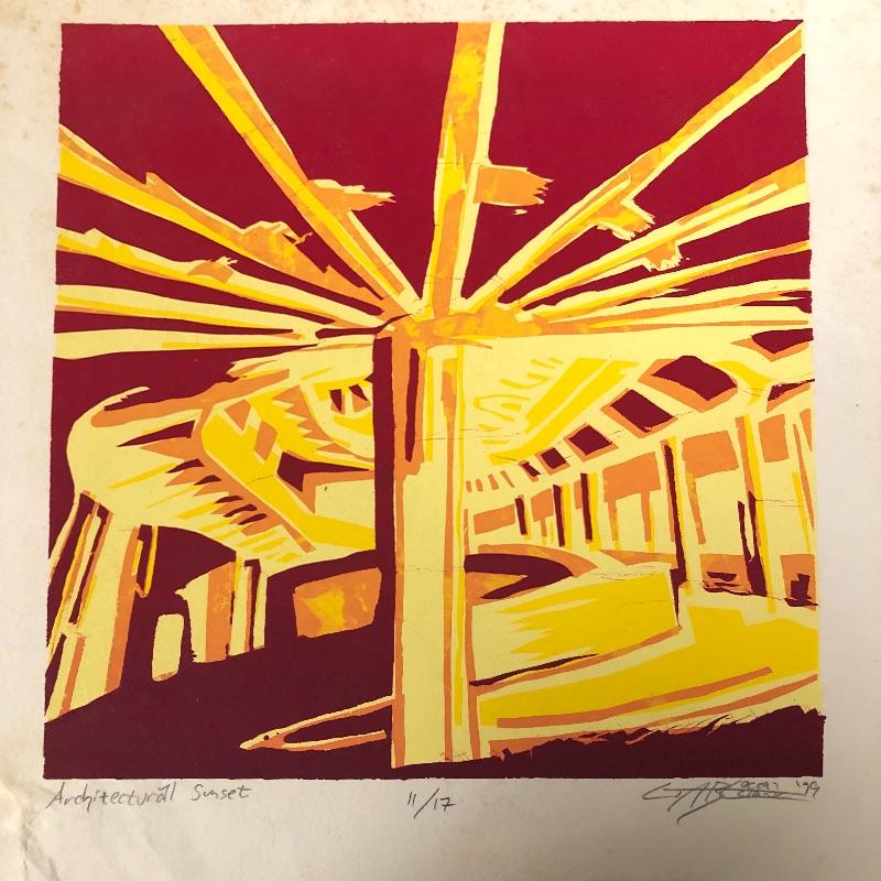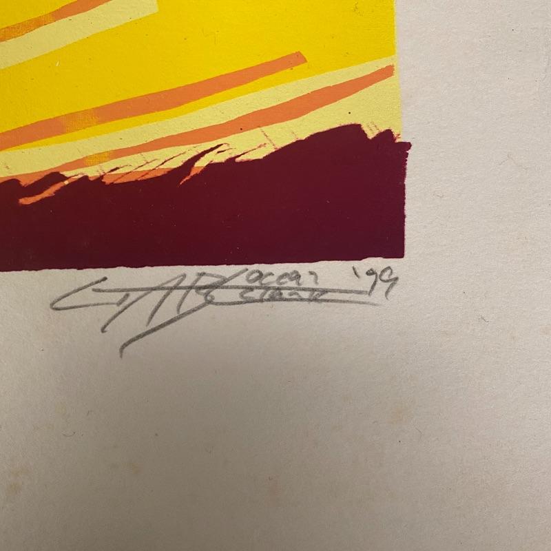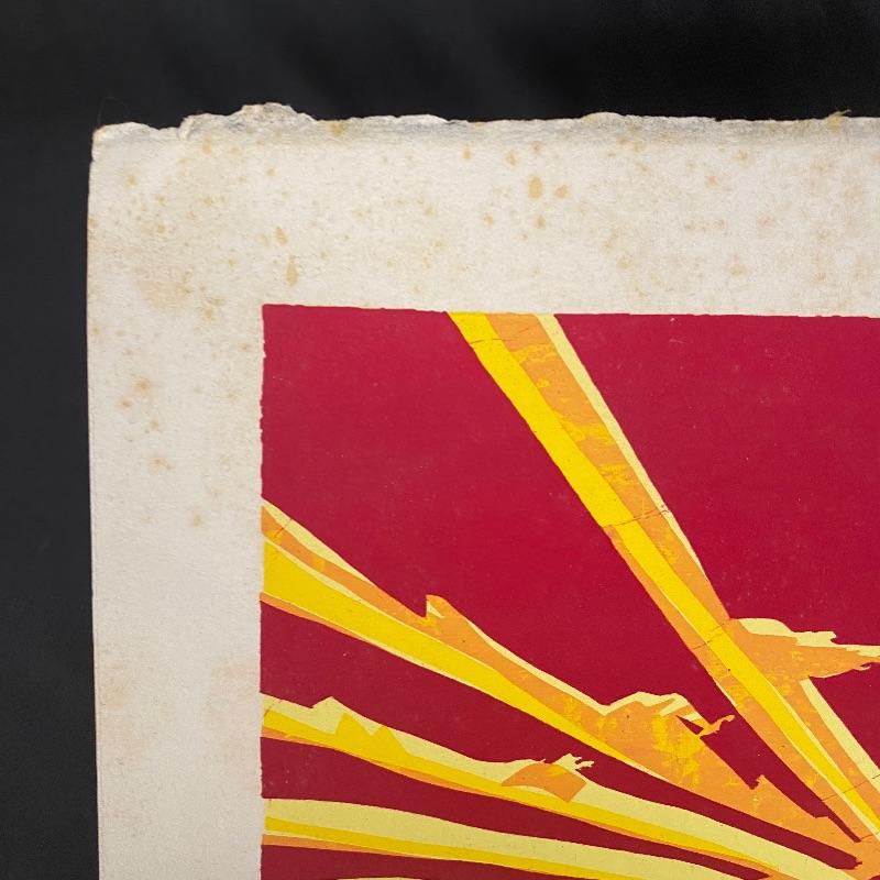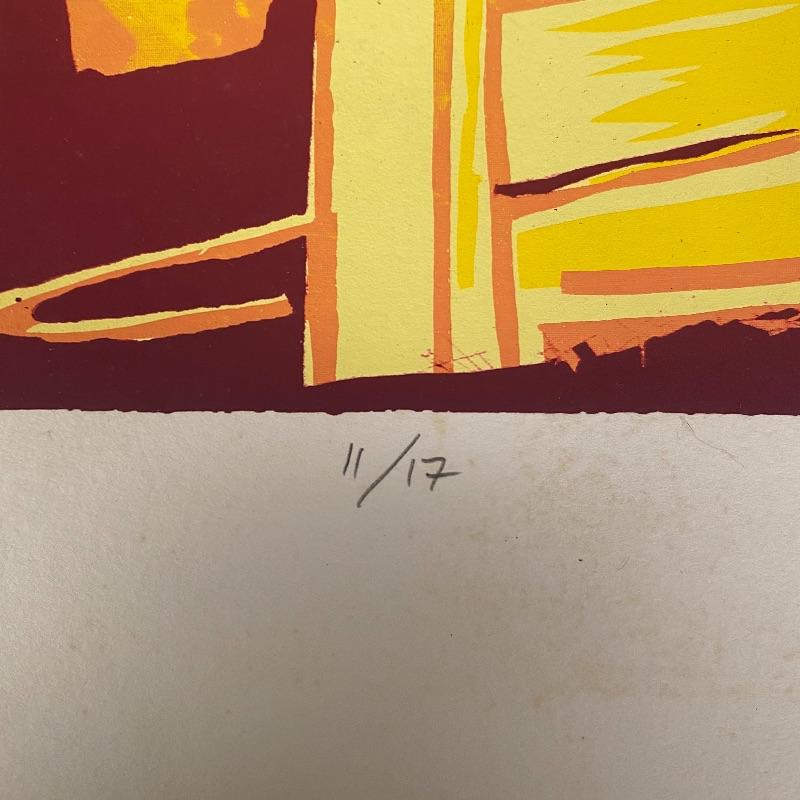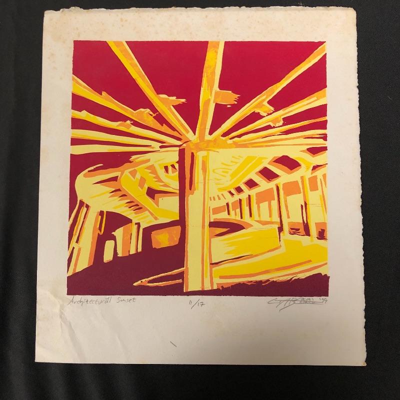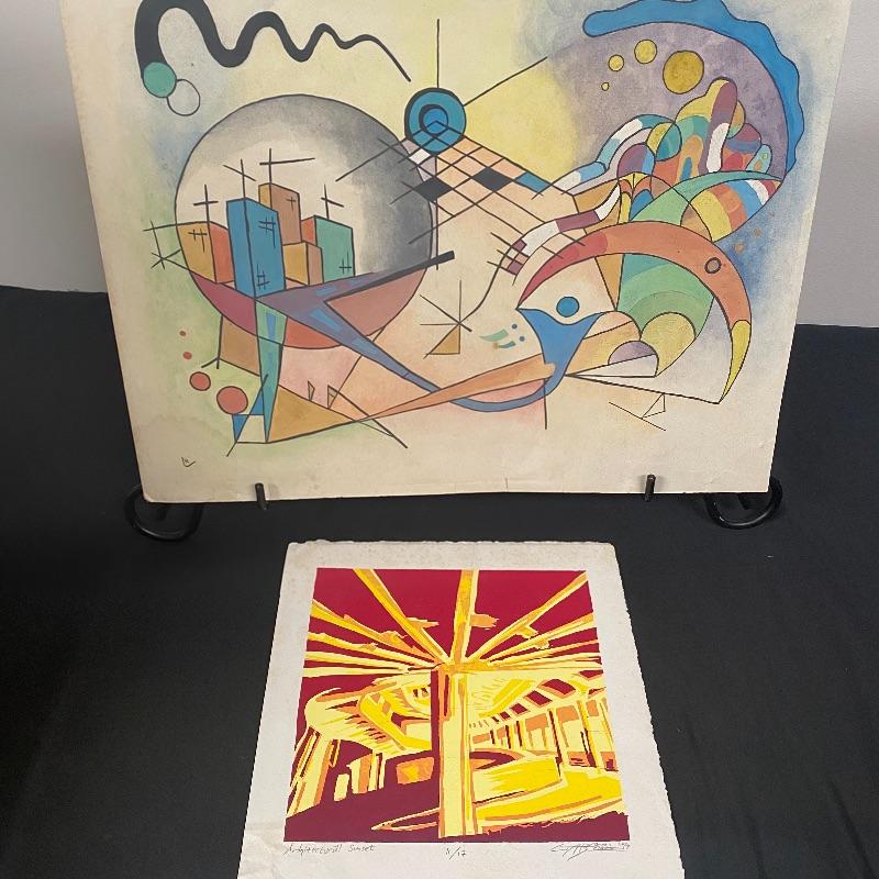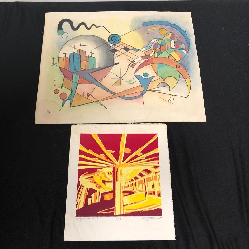 The first signed piece (18” x 14.5”) appears to be an abstract piece made with pastel paint colors. The second (10” x 11”) appears to be an abstract sunset, with vibrant reds and golden hues. This one is numbered and signed and appears to be painted on paper. See photos for artist names.