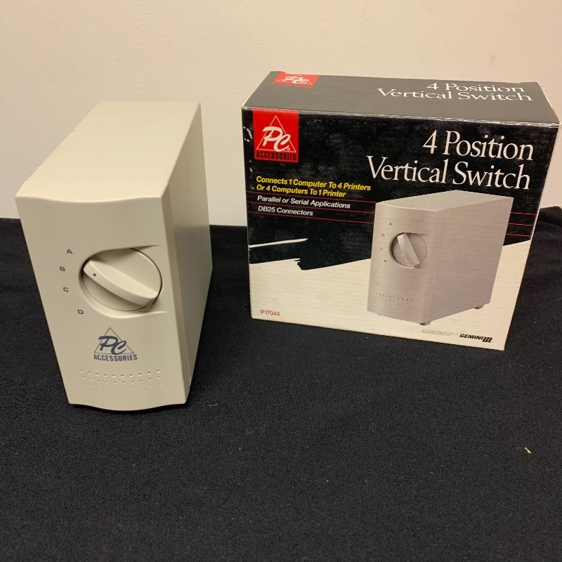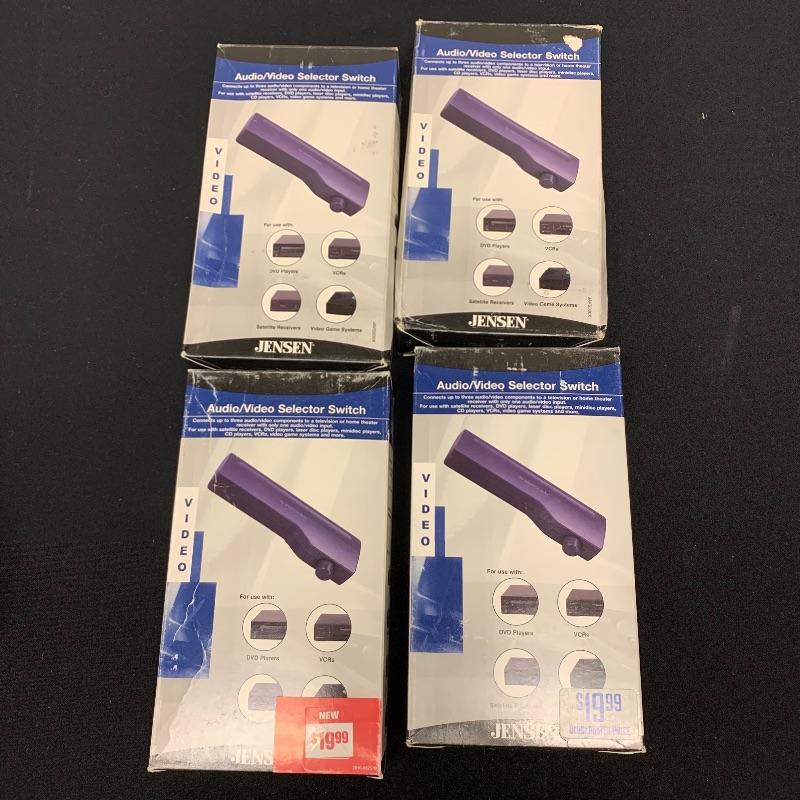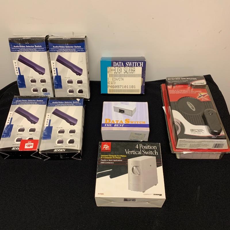 This lot includes one 4 position vertical Switch, 4 Jensen audio/video selector switches, two All Electronic data switches, and one universal S-video / av system selector. The universal video / ab system selector comes with a remote and cables.