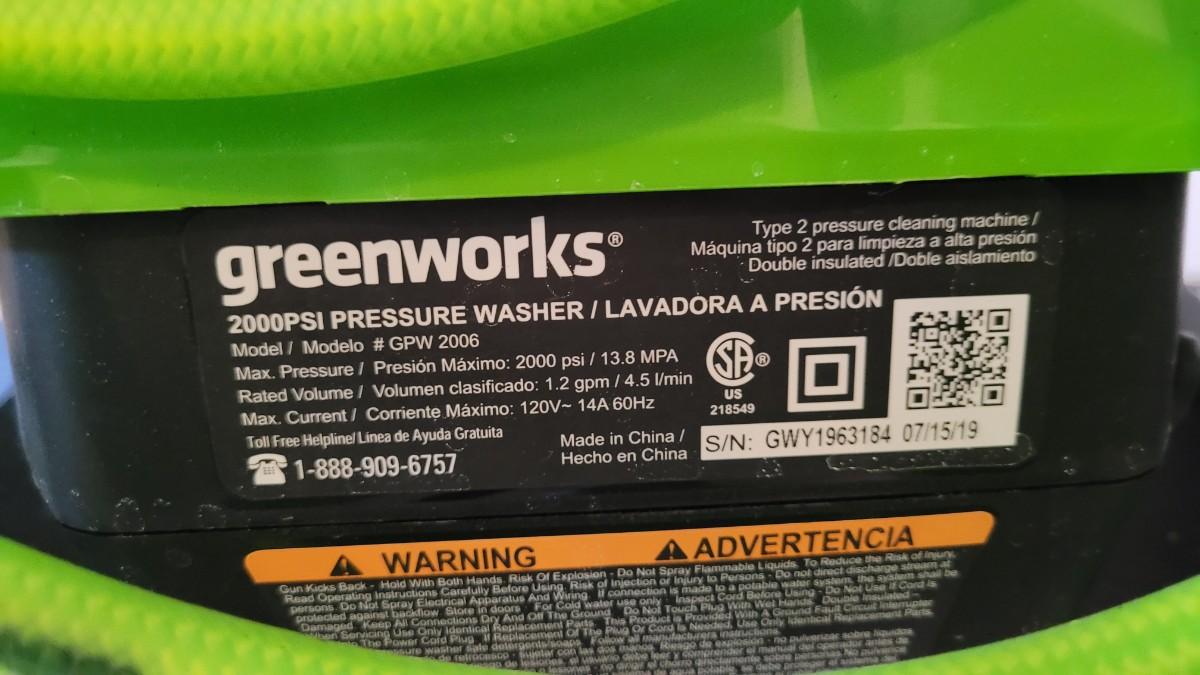 Lot 173: GREENWORKS 2000 PSI Type 2 Power Washer