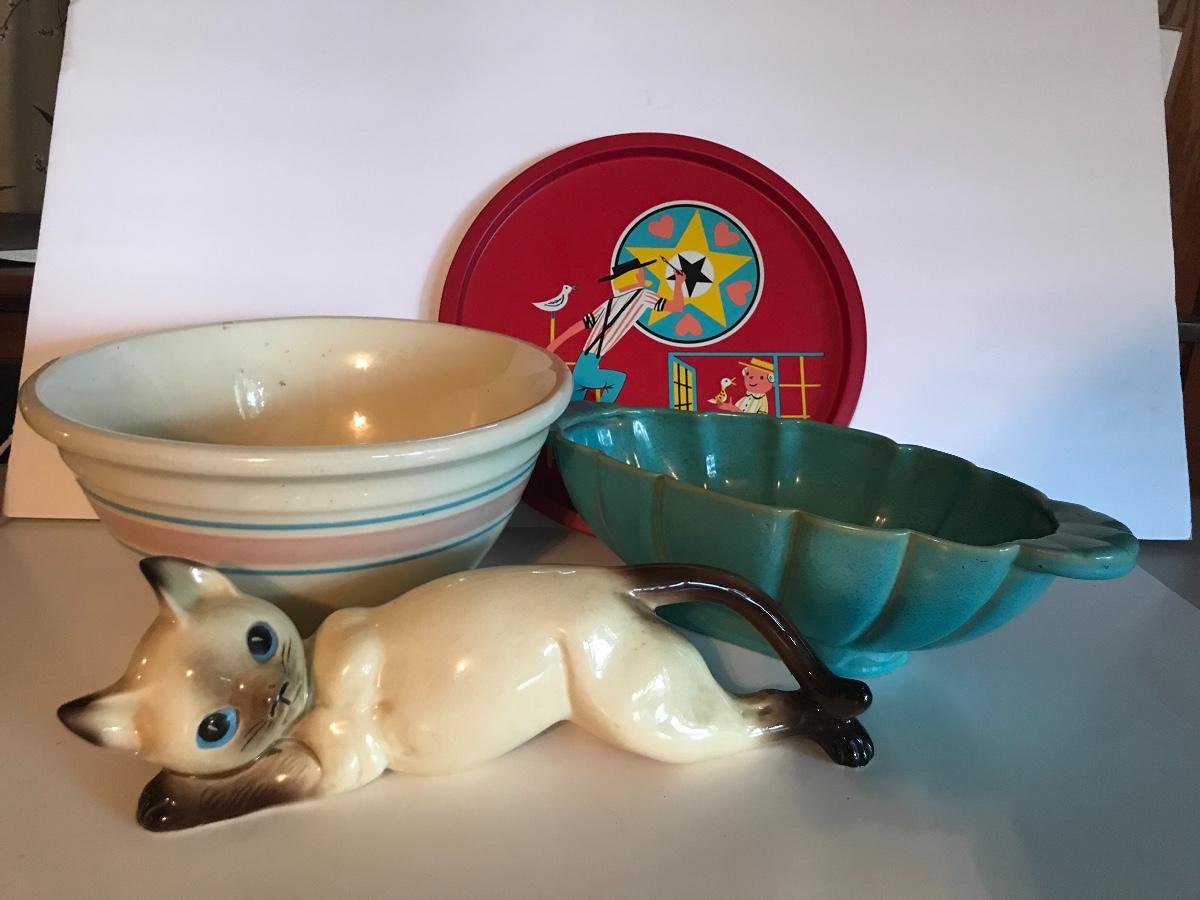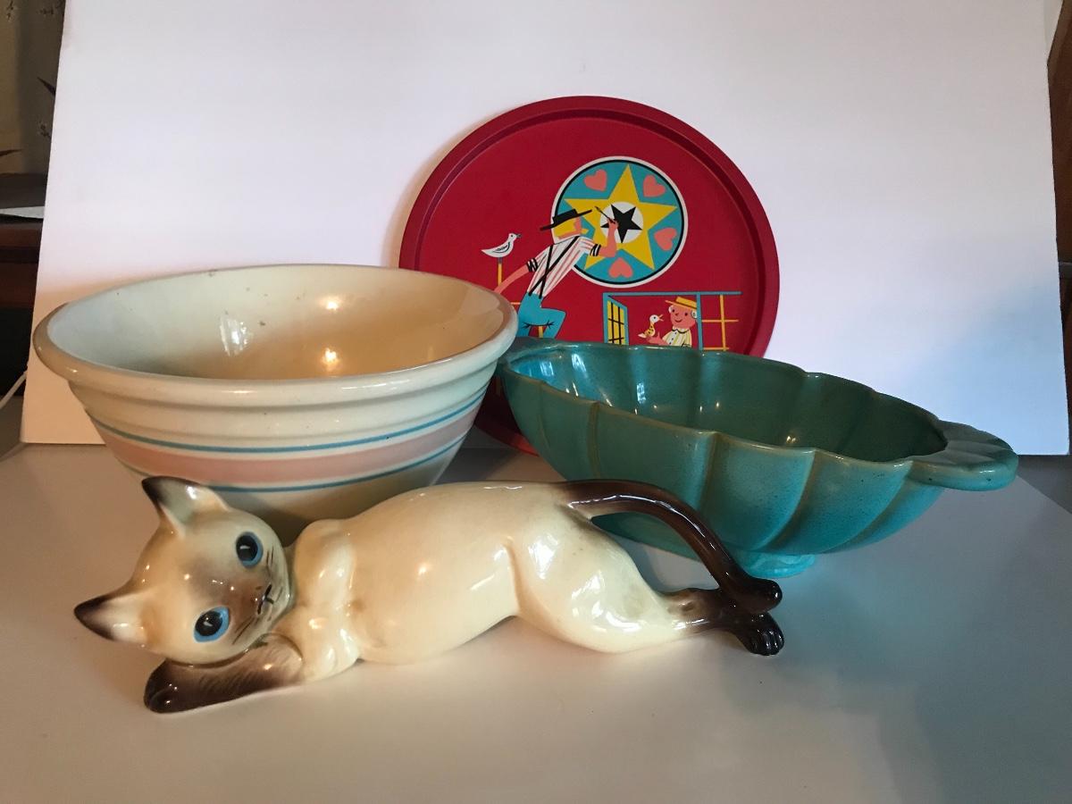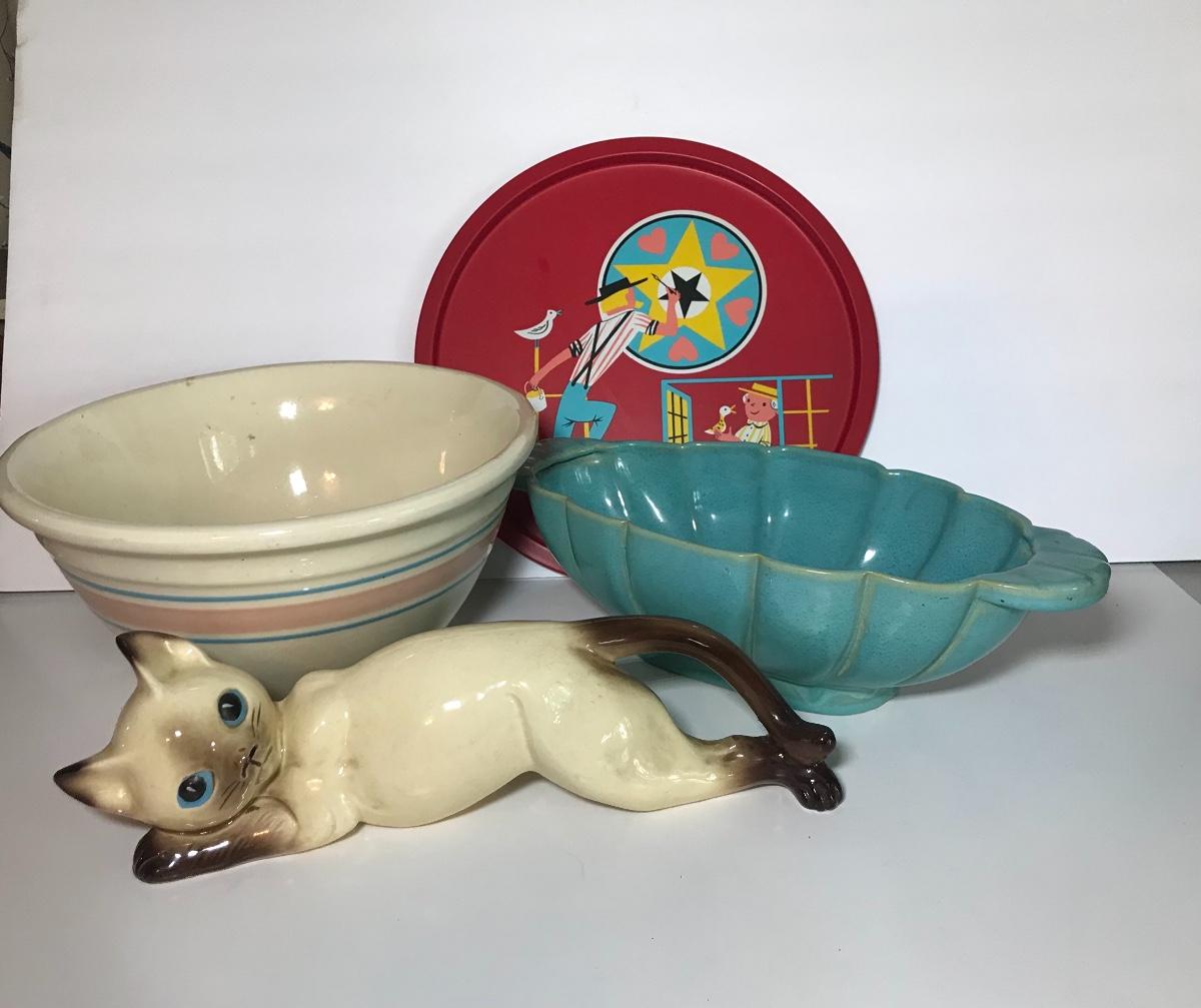 Great mixing bowl by McCoy, a ceramic cat, MCM red tray, and a planter by Galloway. The pictures show condition, measurements if taken, and what is included in the lot. Due to the large amount that we photograph and the time frame, we are not always able to take measurements. All items unless noted, are pre-owned and have been used. If you purchased furniture, you must bring help. We do not allow one person to carry large furniture out on their own. Bring help, tools and a truck for the safety of our client’s homes, and your personal safety. Company policy. Thank you.