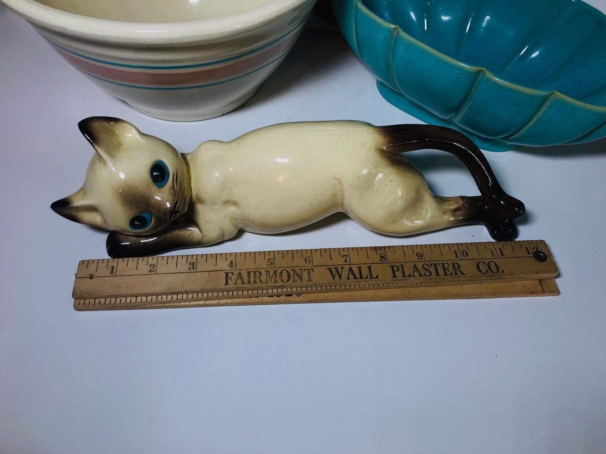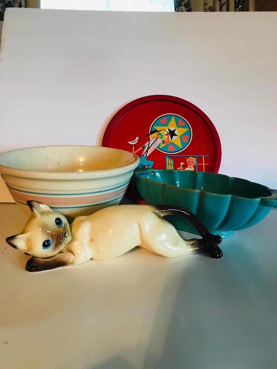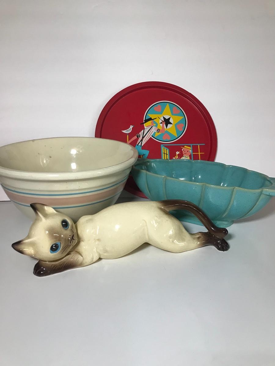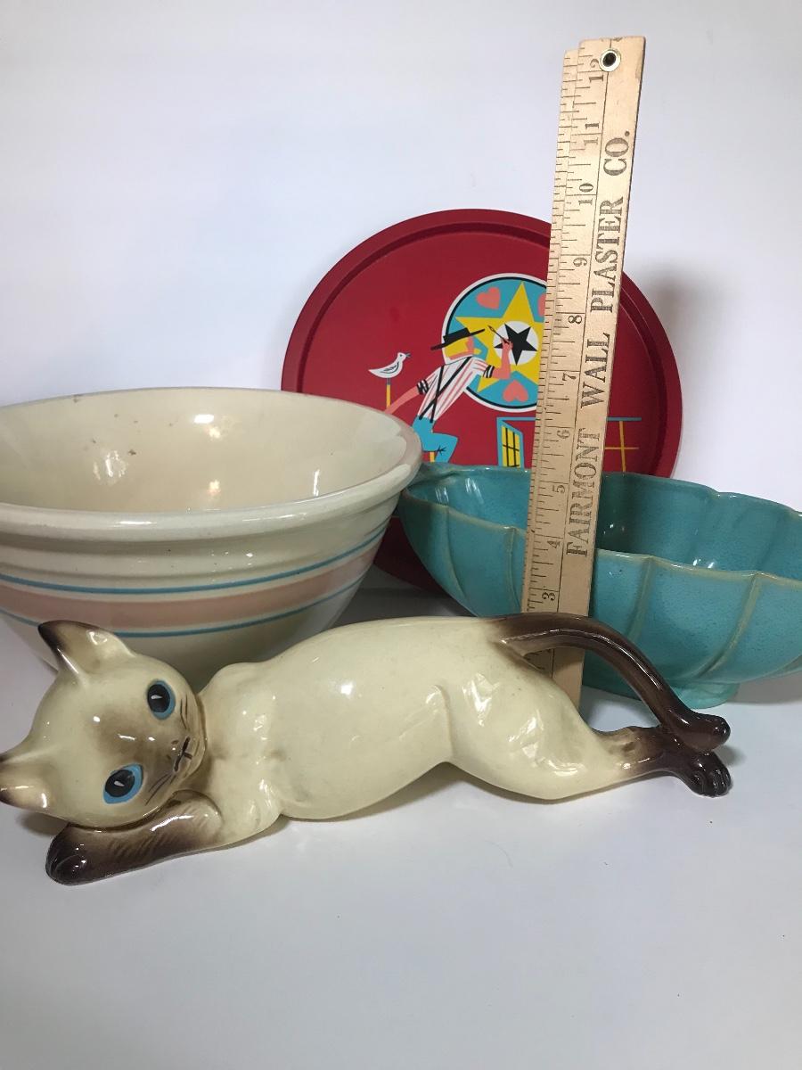 Great mixing bowl by McCoy, a ceramic cat, MCM red tray, and a planter by Galloway. The pictures show condition, measurements if taken, and what is included in the lot. Due to the large amount that we photograph and the time frame, we are not always able to take measurements. All items unless noted, are pre-owned and have been used. If you purchased furniture, you must bring help. We do not allow one person to carry large furniture out on their own. Bring help, tools and a truck for the safety of our client’s homes, and your personal safety. Company policy. Thank you.