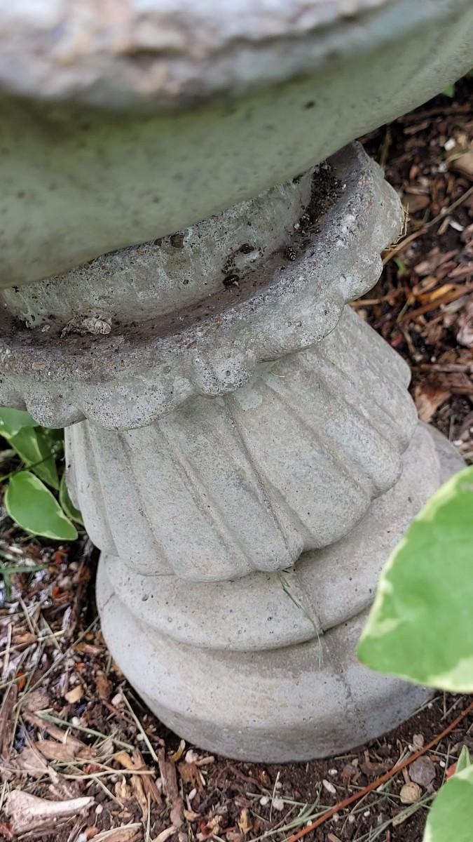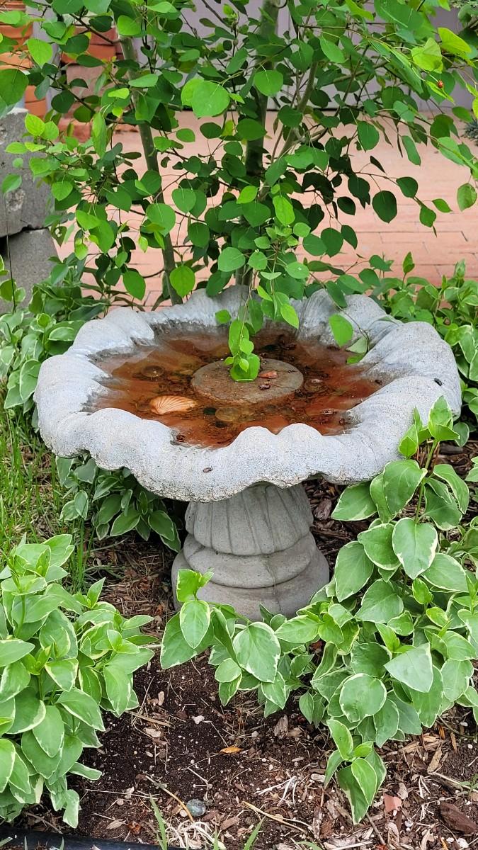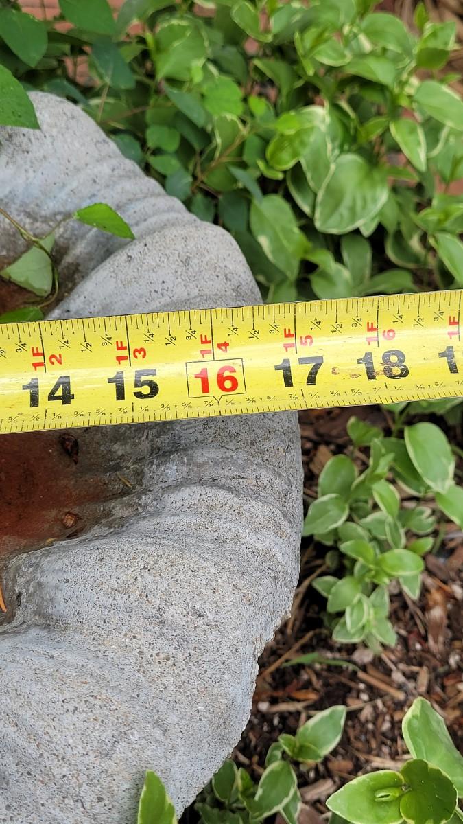 This birdbath comes a part intob2 pieces. This birdbath feature fits perfectly under bushes and amongst flowers. It is 12 inches tall.