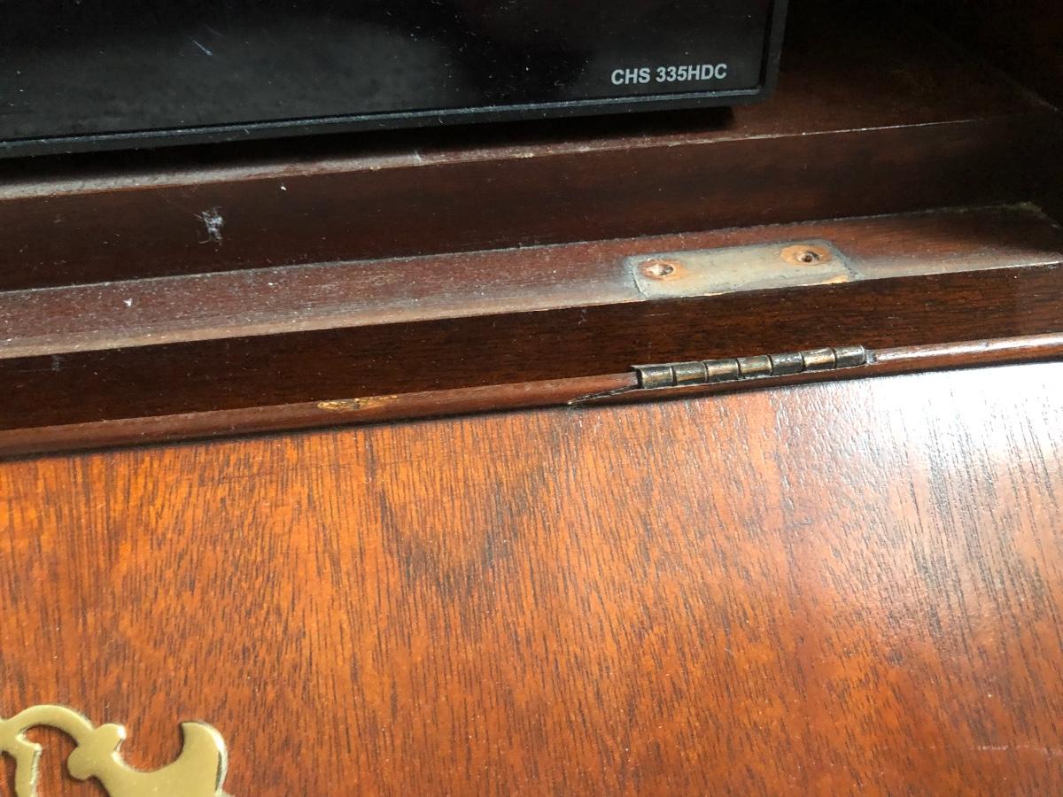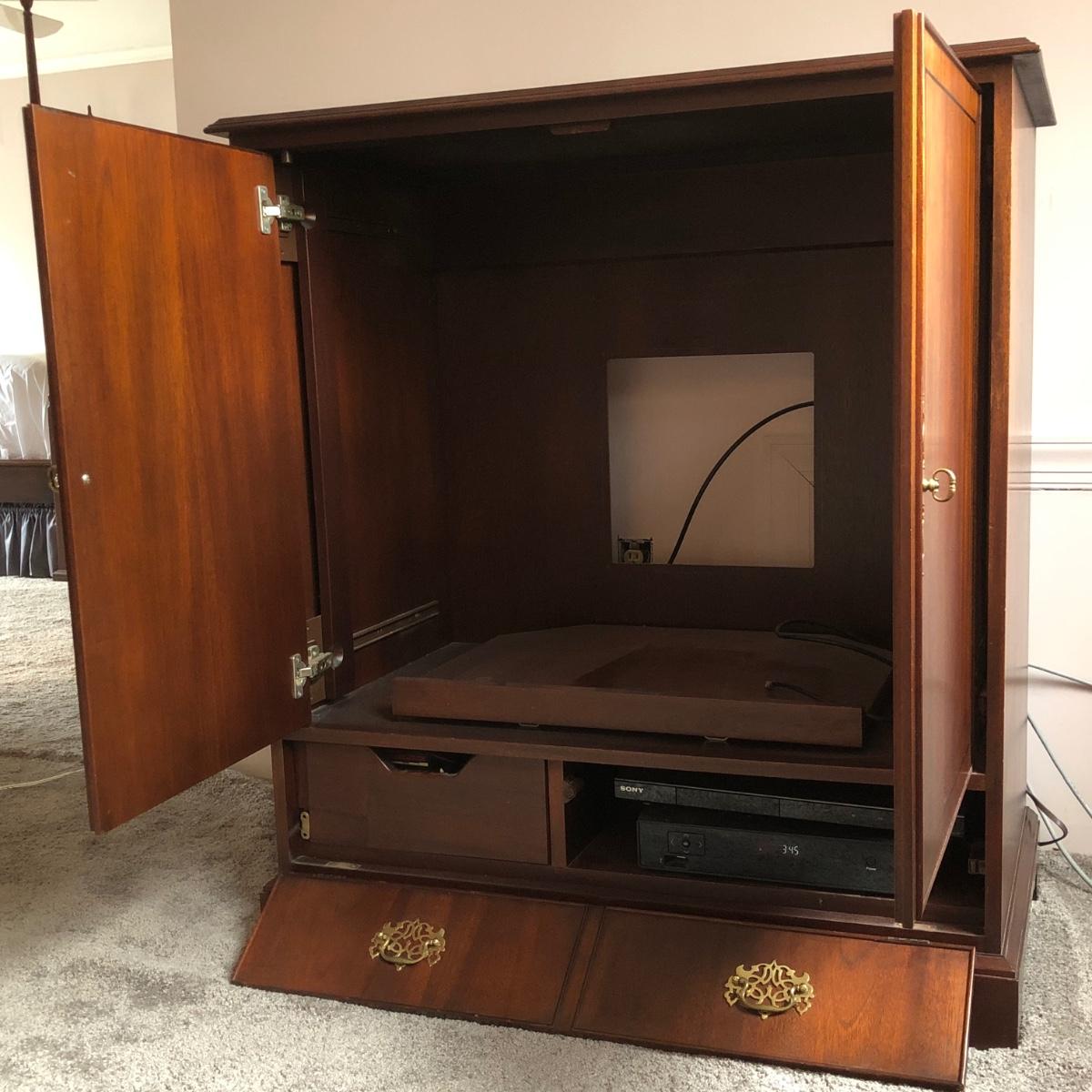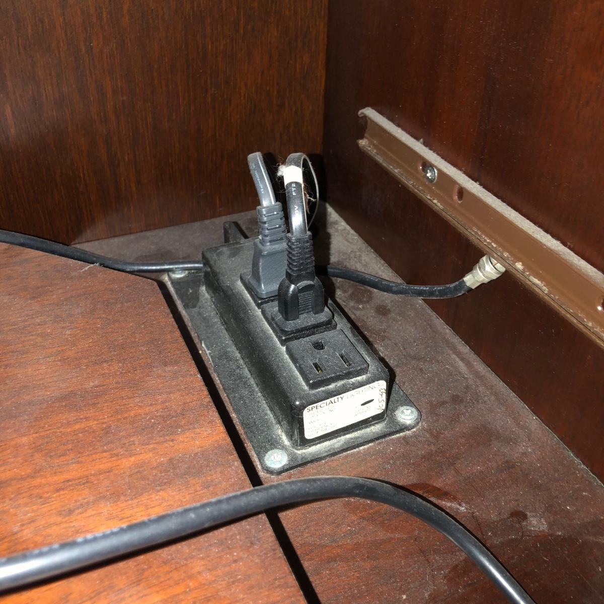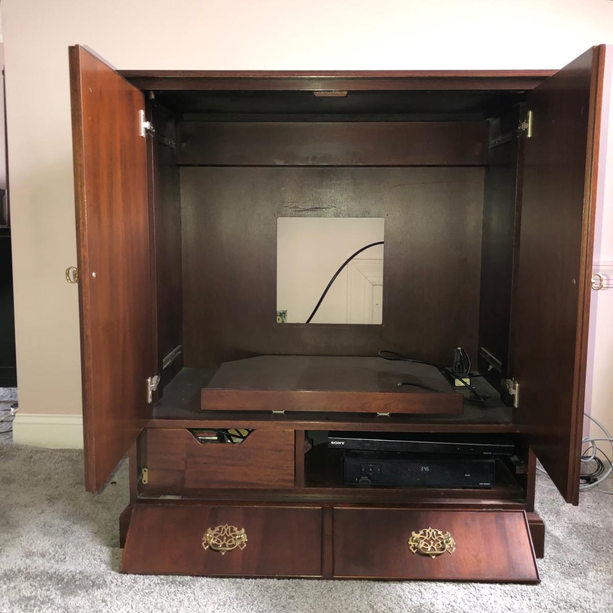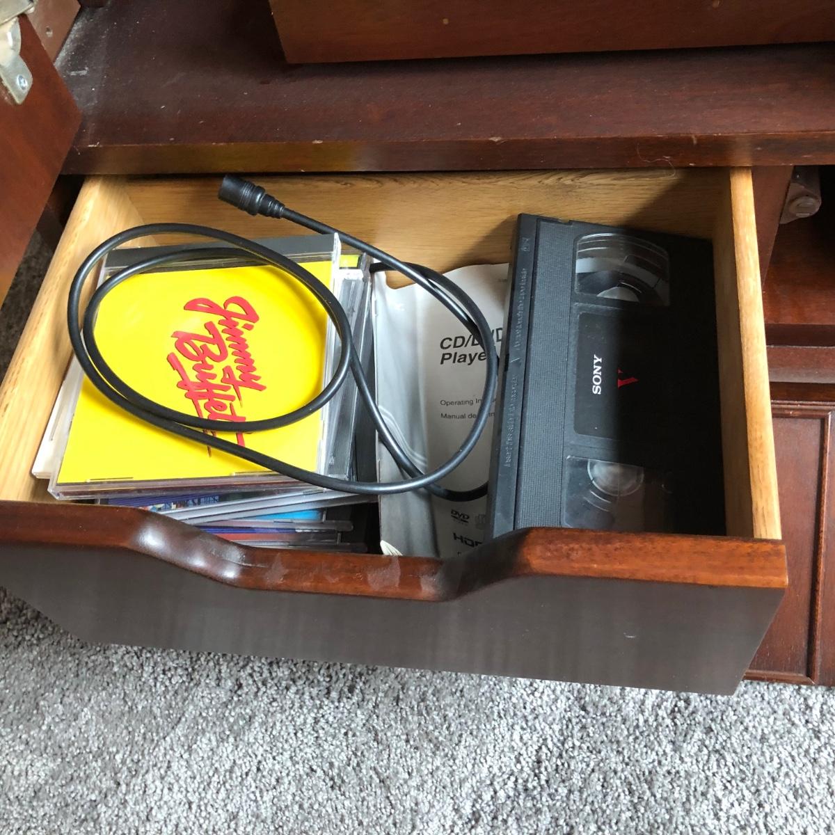 Does not include cable box. Does included CD/DVD player. The cabinet has an outlet inside of it. The bottom faux drawer is completely off and needs new hinges to be reattached. Includes contents of drawer (CDs). Cabinet is upstairs.