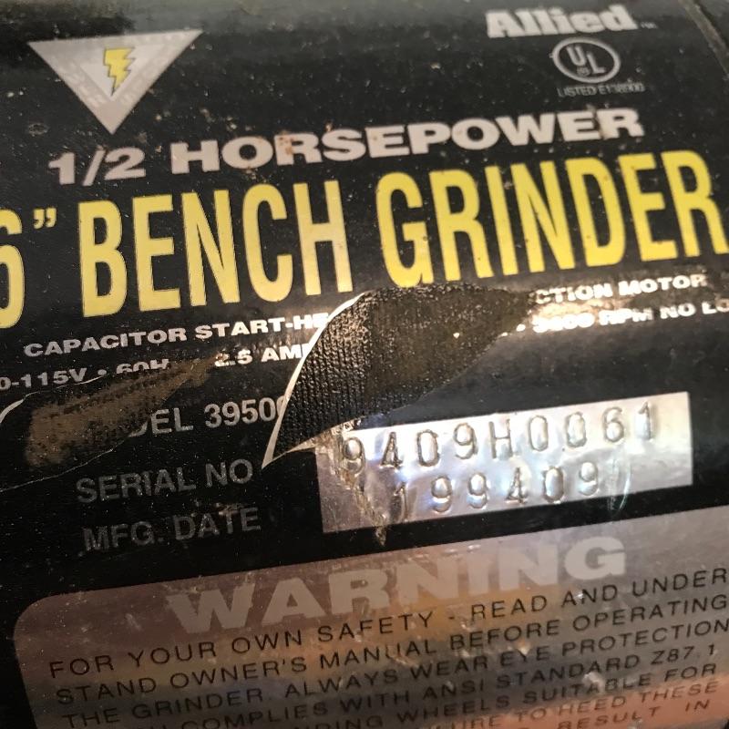 Allied 1/2 Horsepower 6” Bench Grinder. Power tool turns on when plugged in. Lot includes one brush and two wheels. See photos.