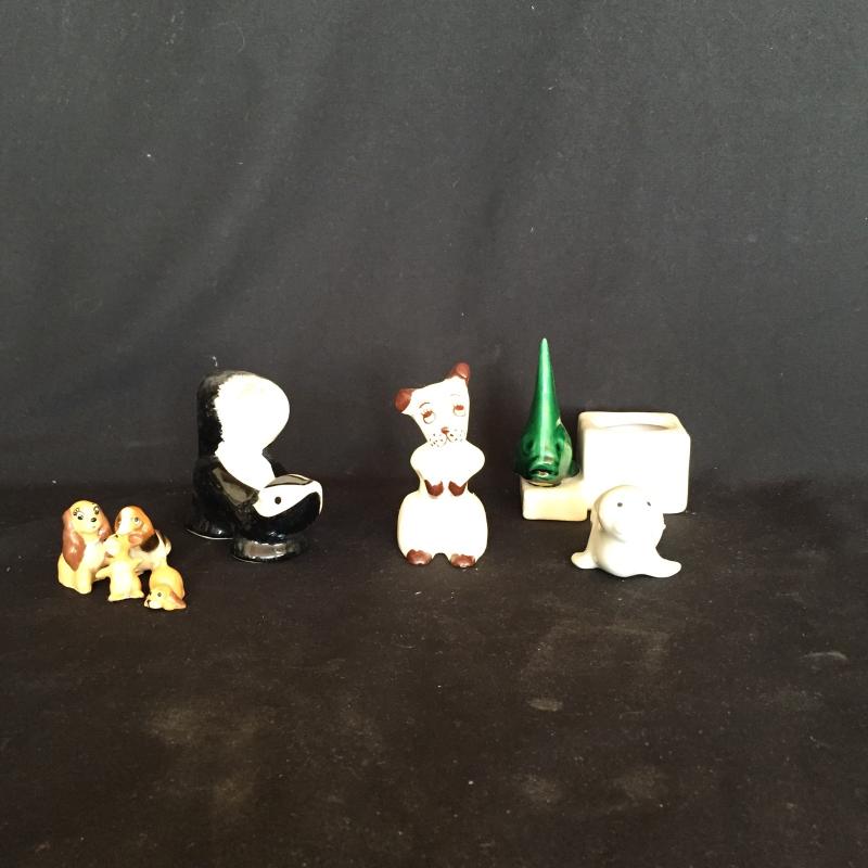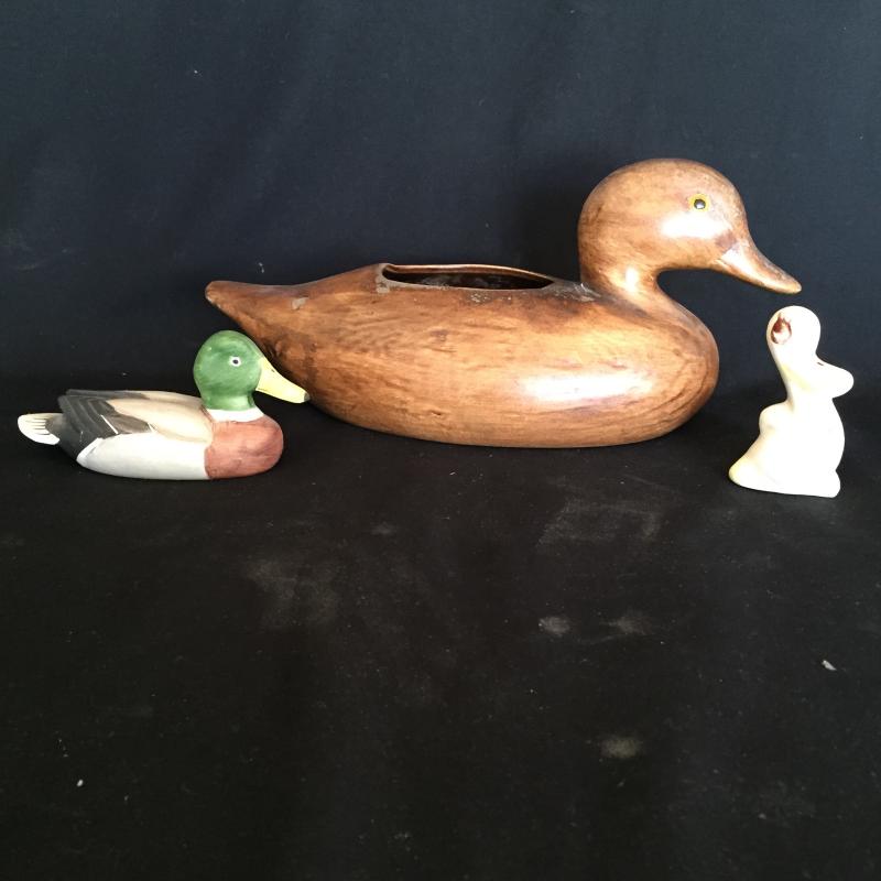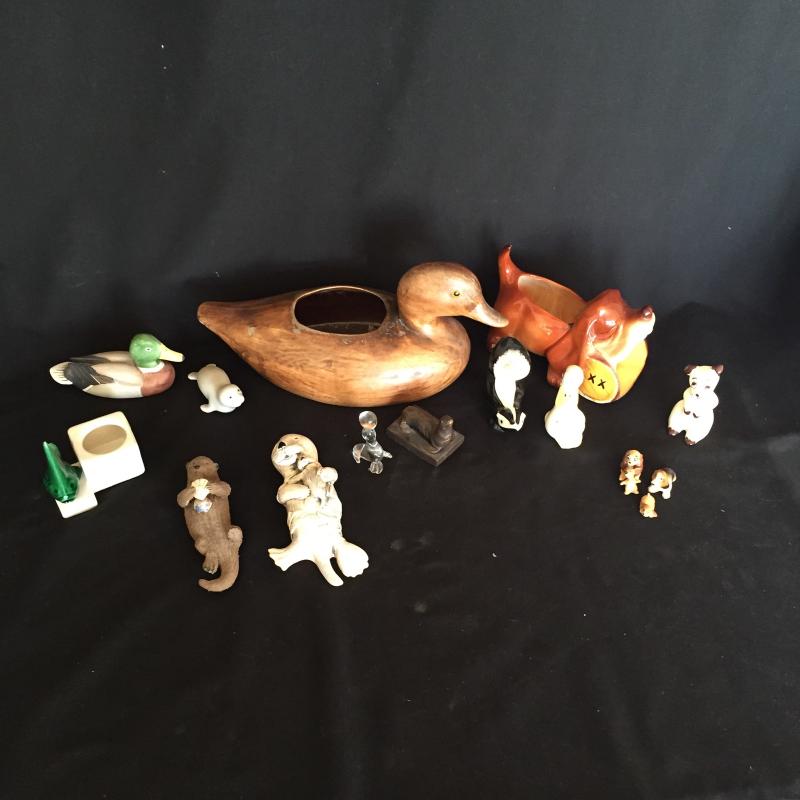 Large Array of Animal Figurines Including Ducks,Skunk,Dogs Seals and More. Large Duck Measures 12.5” x 6.5”.