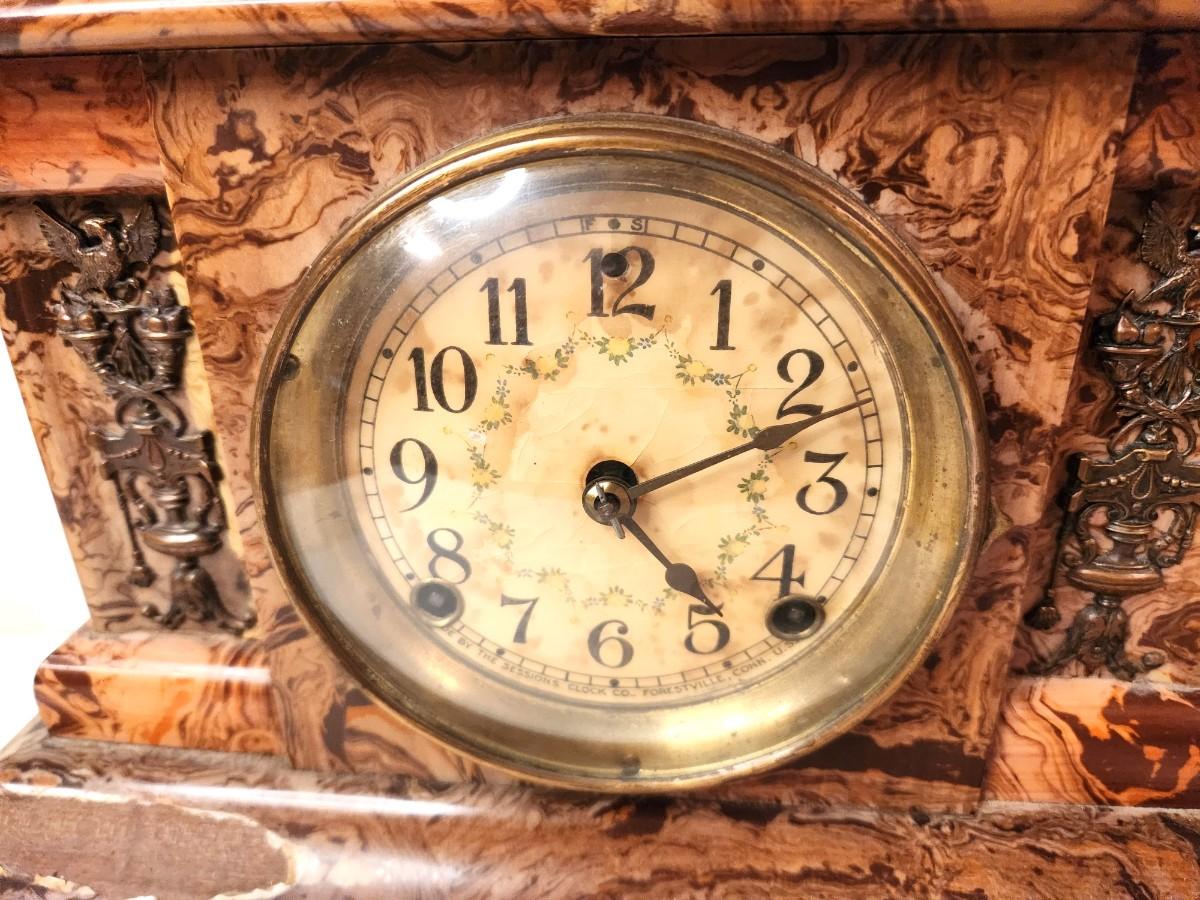 Antique Faux Marbe Mantle Clock - original label on reverse. No key (easily obtained). When we picked it up it started ticking/chiming. Will need some restoration. 15" across, 11" tall.