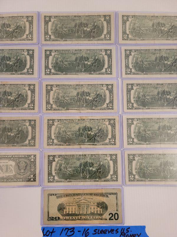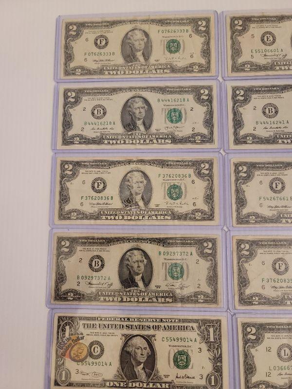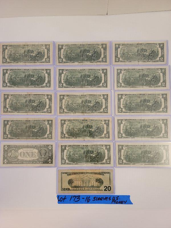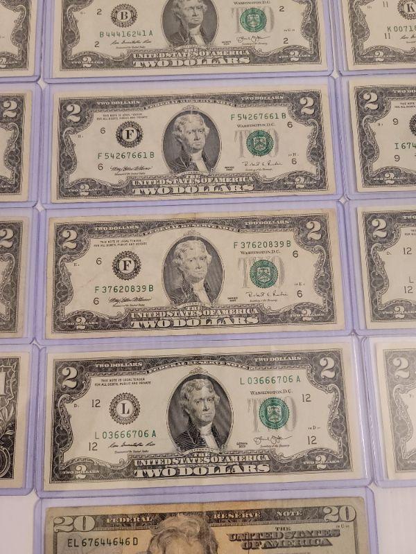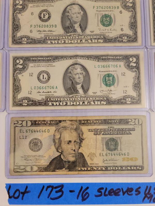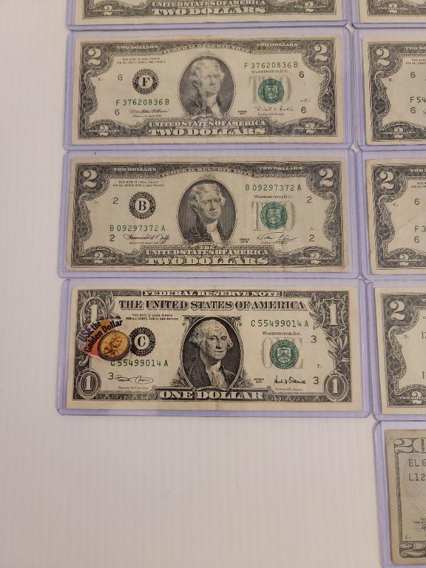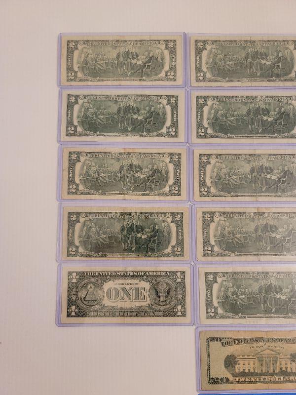 A large assortment of USA 1 dollar, two dollar and a $20 Dollar Federal Reserve Note. All are in plastic holders.
