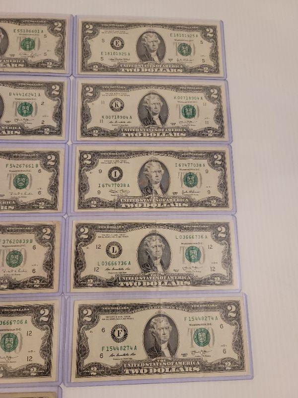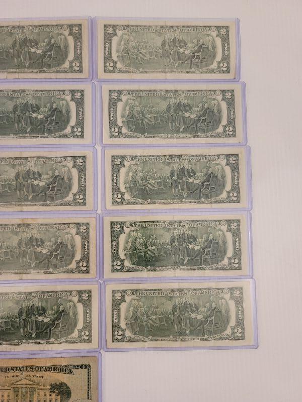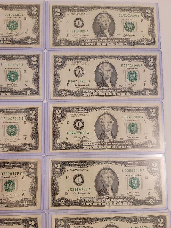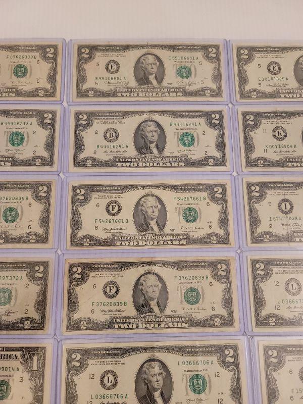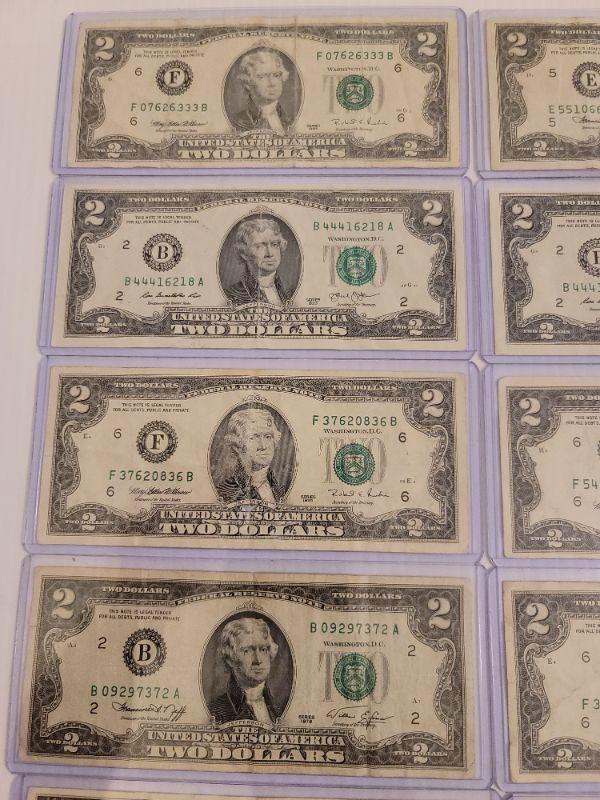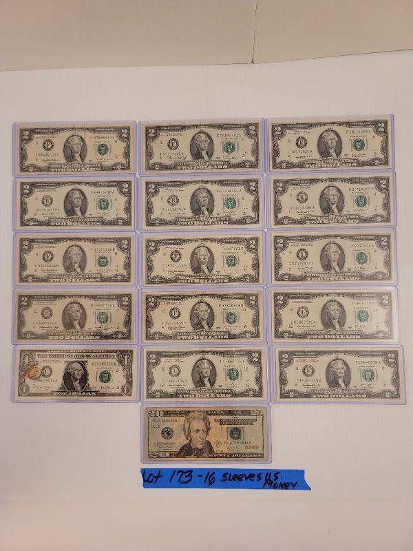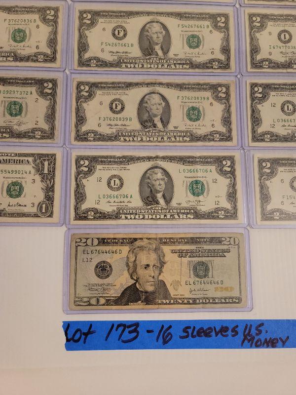 A large assortment of USA 1 dollar, two dollar and a $20 Dollar Federal Reserve Note. All are in plastic holders.