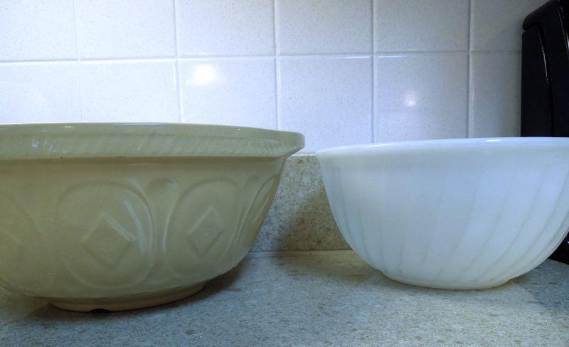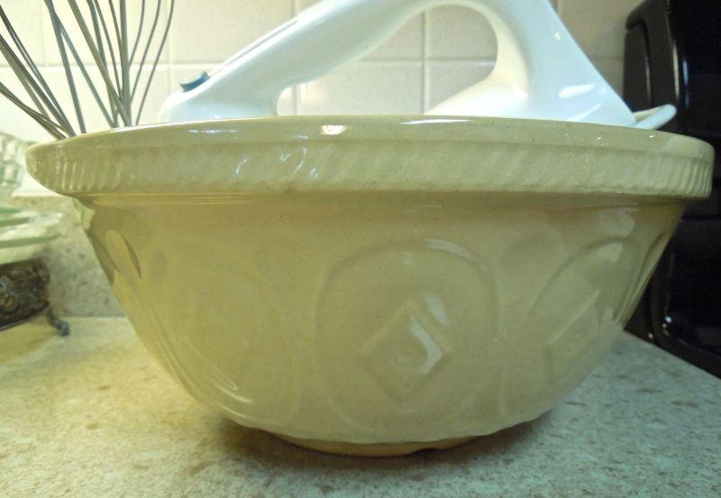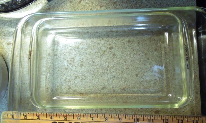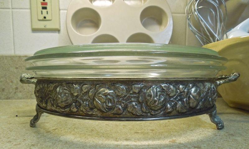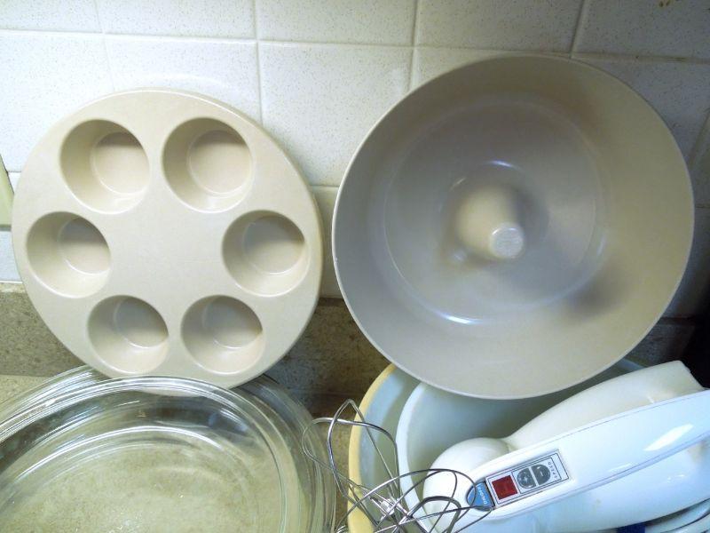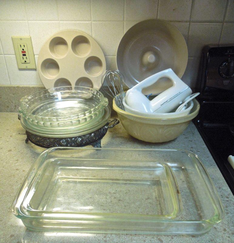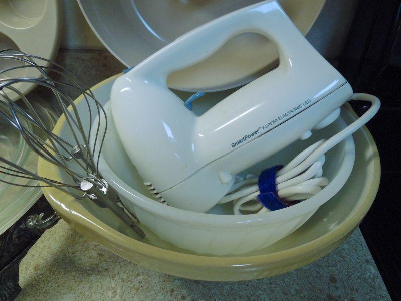 Cuisinart 7 speed hand mixer with 3 beater attachments model NTM-7L; Gripstand Englsnd yellow mixing bowl; a vintage milkglass Fire King mixing bowl; 2 clear glass pyrex pie dishes; 3 other clear glass pie dishes; 10.5" silver plated casserole stand; 2 Pyrex "Clear Advantage" rectangular baking dishes (28 x 14 and 15x 10); a stacking microwave bundt and muffin pan. No cracks or chips