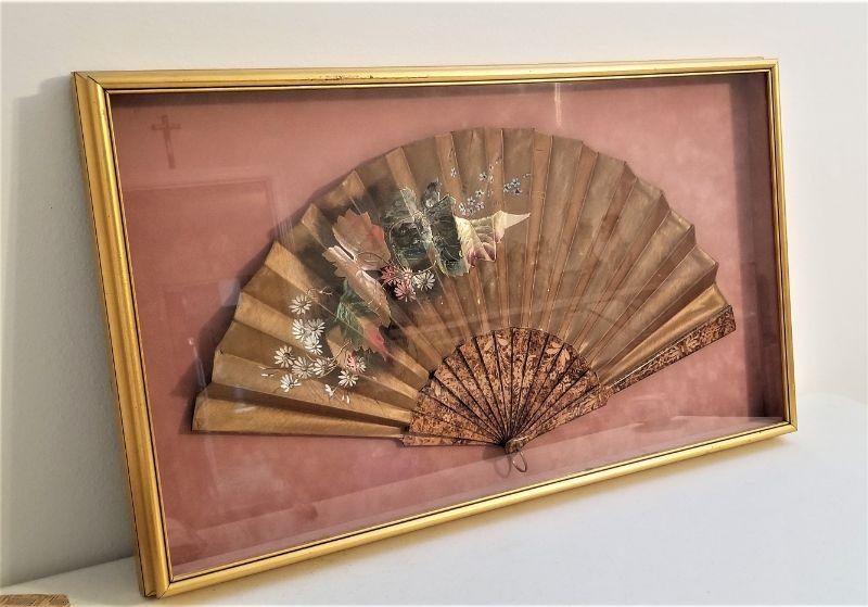 I have never seen a fan with Fernware sticks before. This one is a beauty. Fermware is a craft perfected during the Victorian era in England - fan appears to be silk, handpainted. Excellent antique condition, displayed in a shadowbox with rose velvet background. Shadow box measures 29.5" across, 18" tall.