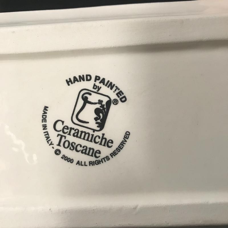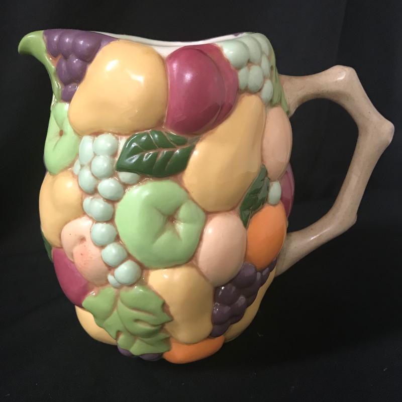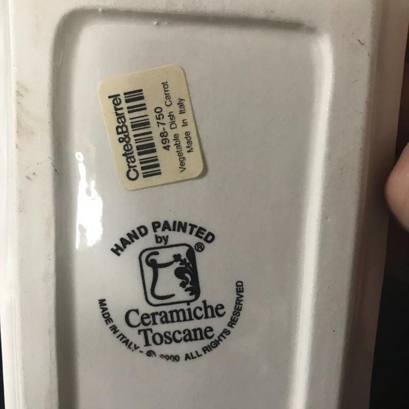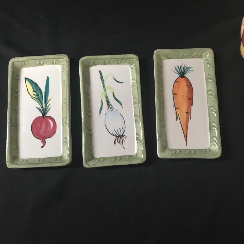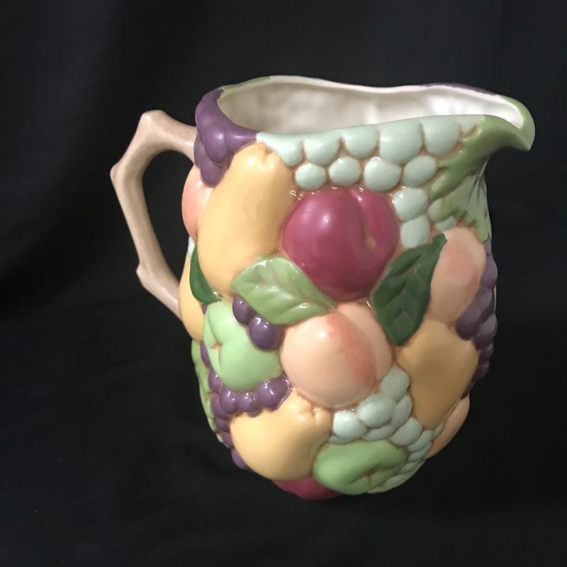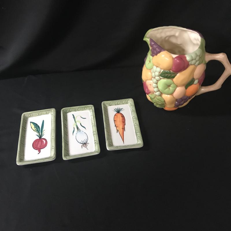 3 rectangular Italian dishes from Crate & Barrel, each measures 6.5” x 3.5”. Vintage Fruit Pitcher stands 8” tall. This lot is available for shipping or local pick up in Asheville, NC.