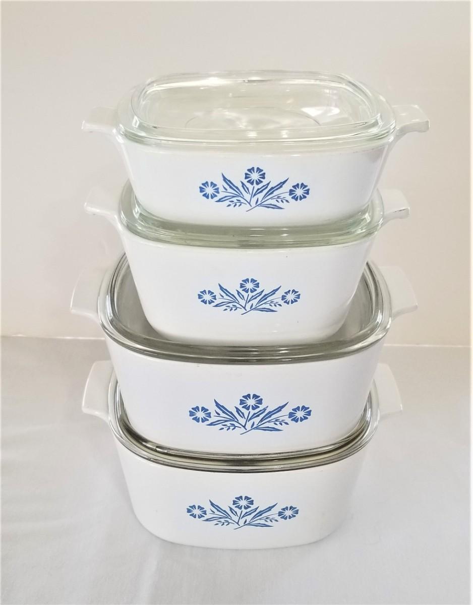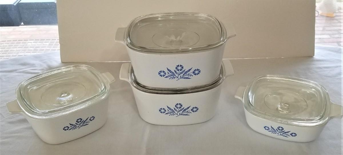 You get all you see here - 4 pieces of Corning Ware in the Cornflower pattern - all have lids. 1 Quart, 1 3/4 quart, and two 3 quart casseroles. All in good condition.