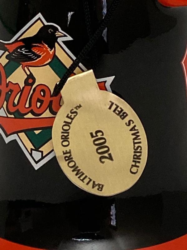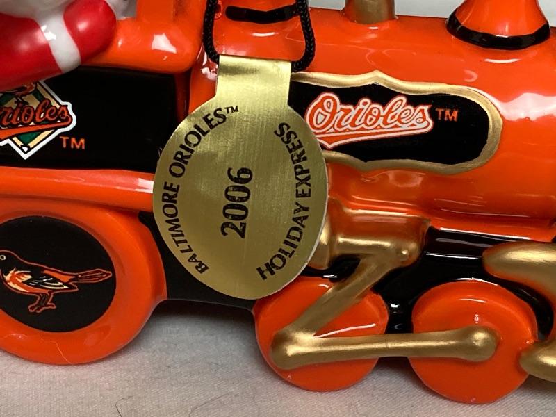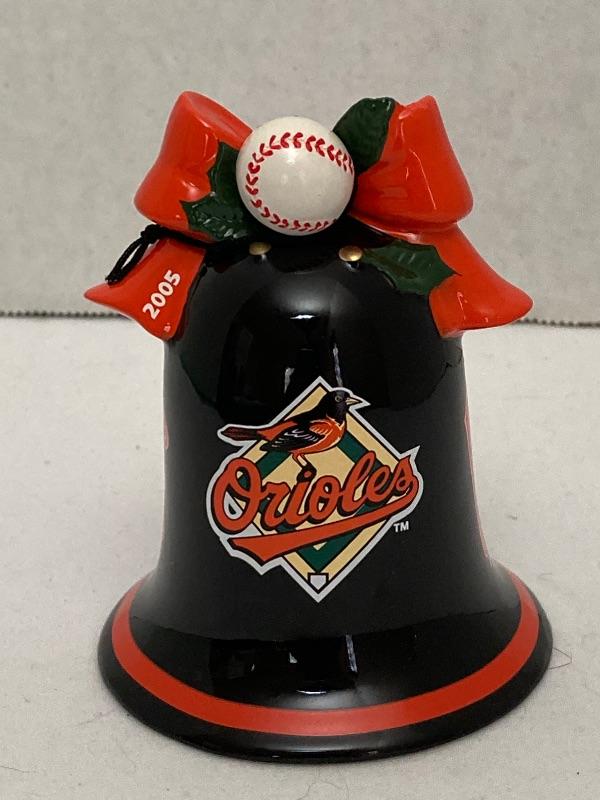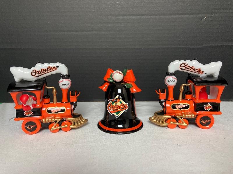 Three Baltimore Orioles Christmas ornaments from Danbury Mint. 2006 “Holiday Express” Train 4” long 3-1/2” wide and 2-1/2” tall, Two 2005 “Christmas Bell” ornaments 4-1/4” tall. All ornaments are porcelain and come in original boxes