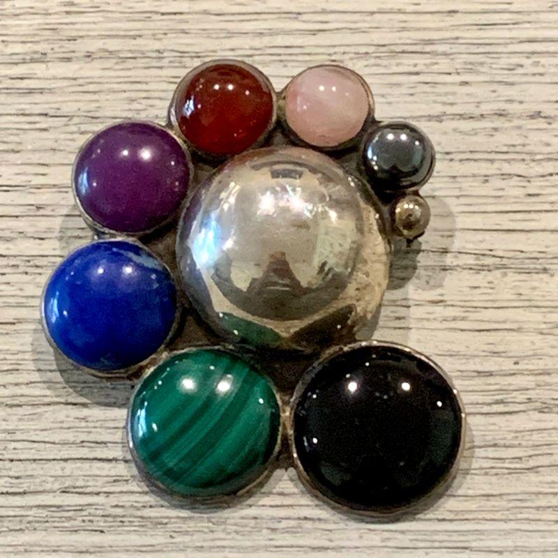 Center domed sterling ball surrounded by various cabochon stones in graduating sizes. Stamped Mexico 925 2 1/2" at widest part.