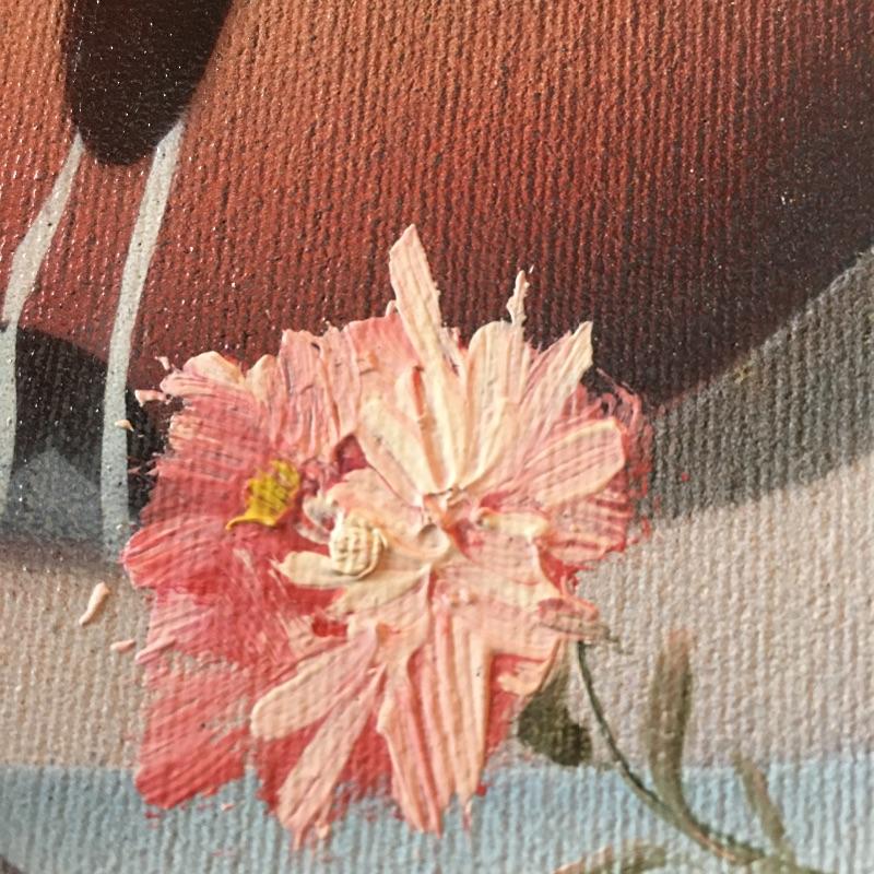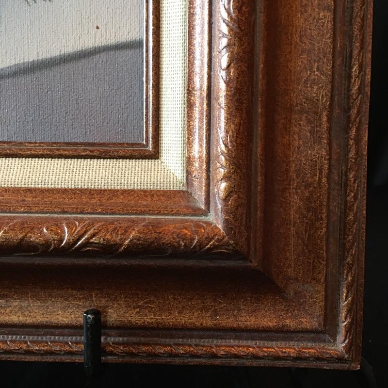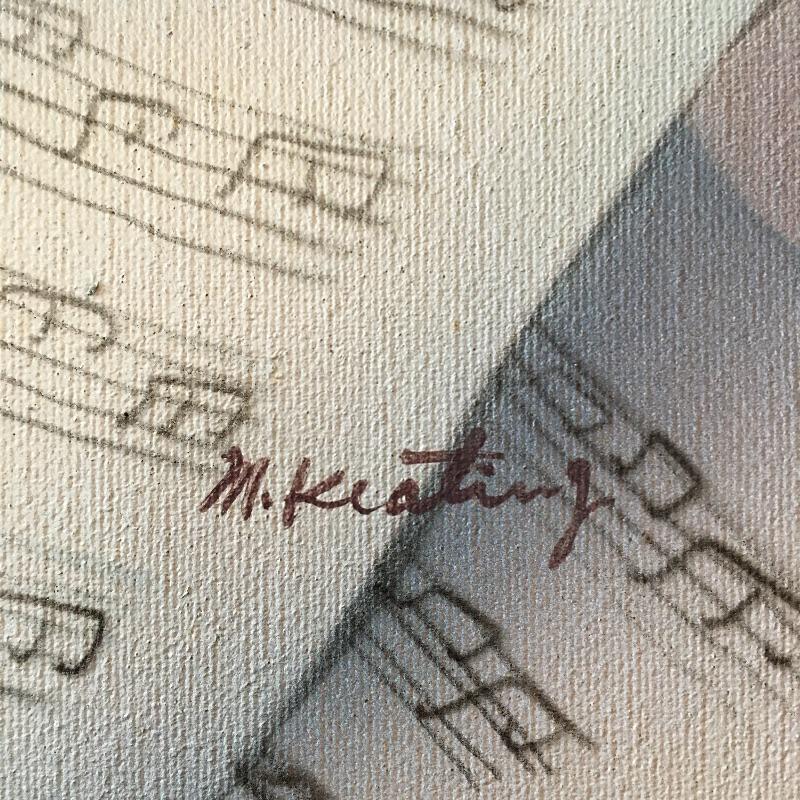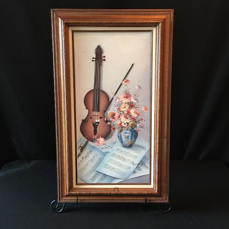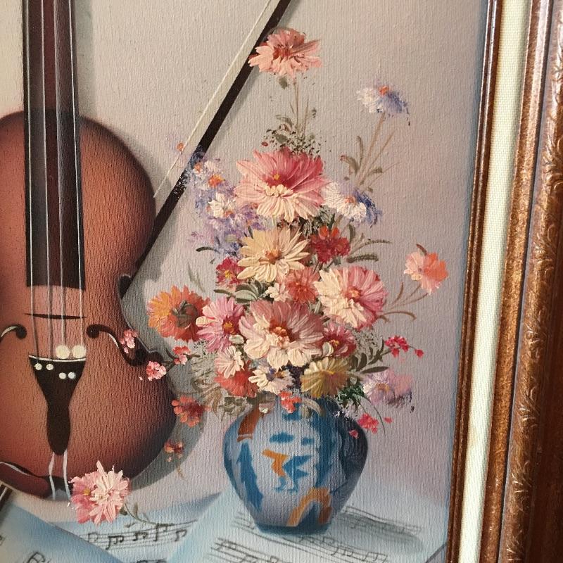 Framed and signed still life painting on canvas featuring a violin and floral arrangement by M. Keating. A great gift for the music lover in your life. Frame measures 29.75” x 17.75”.