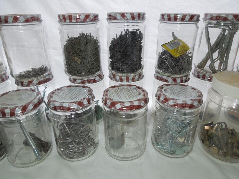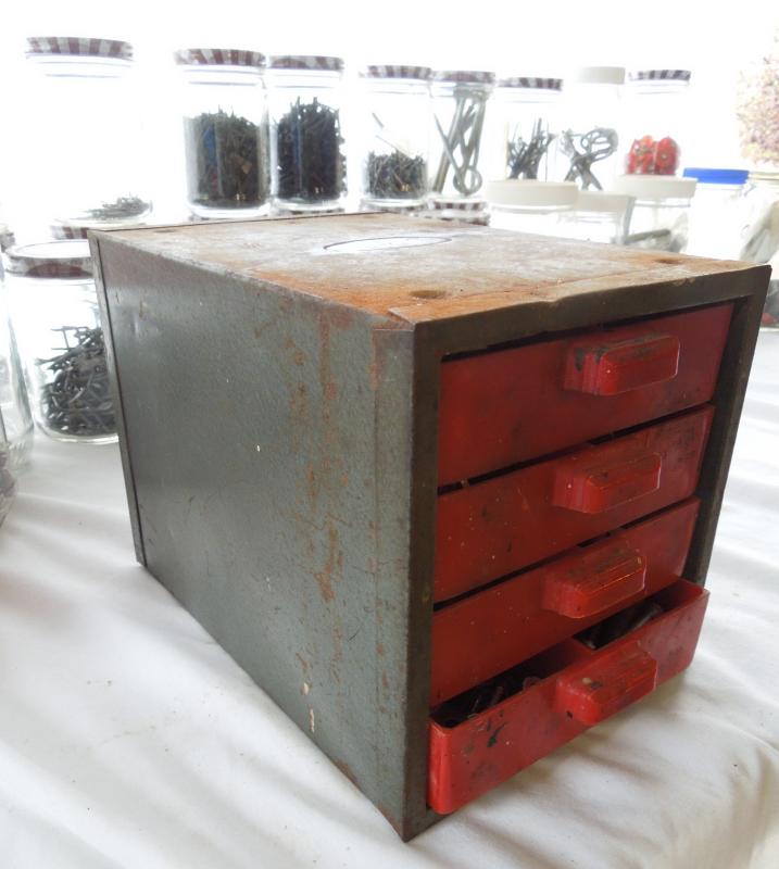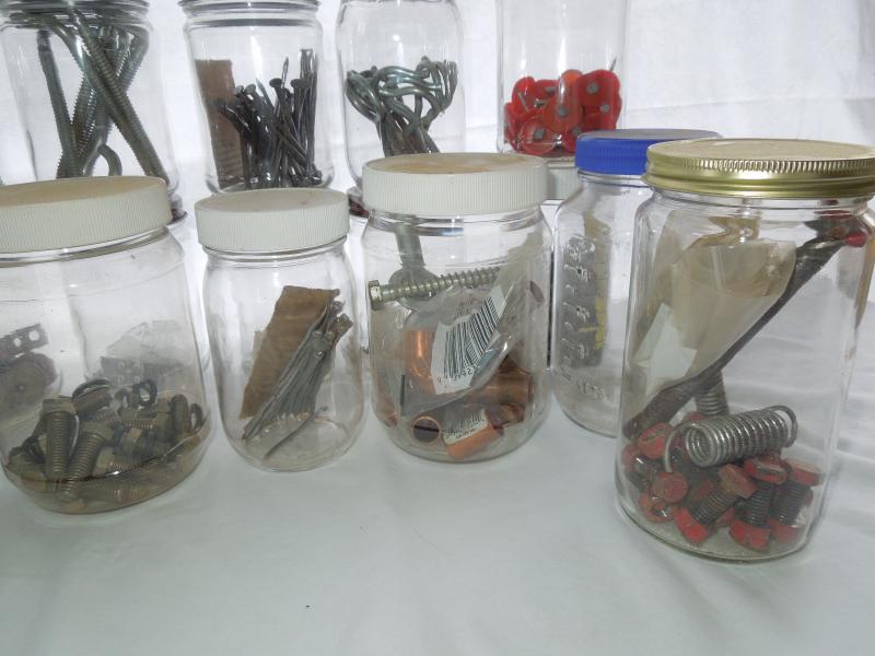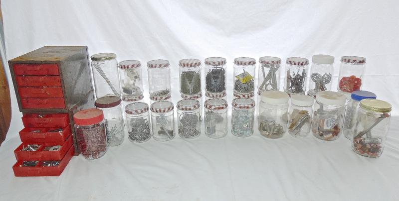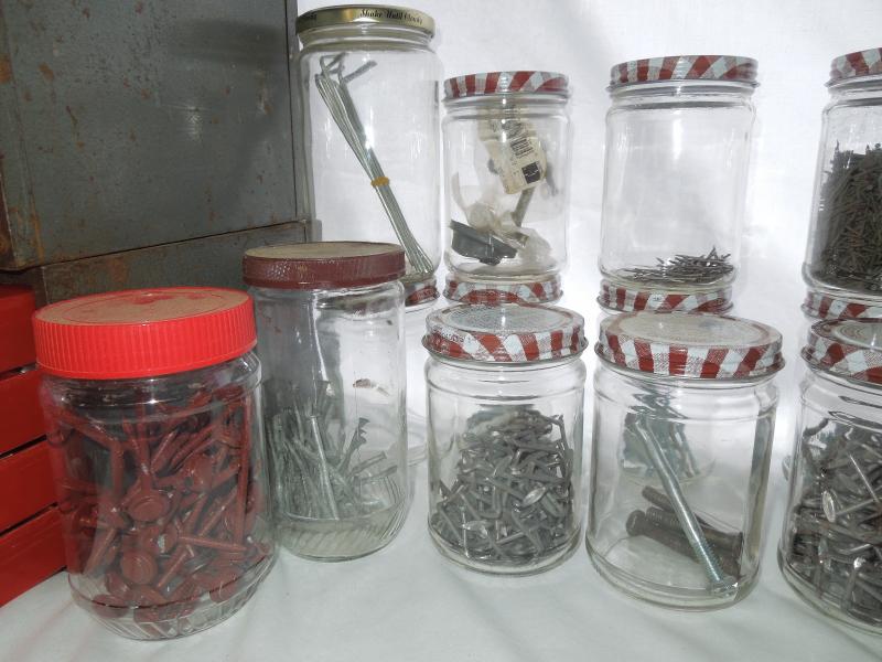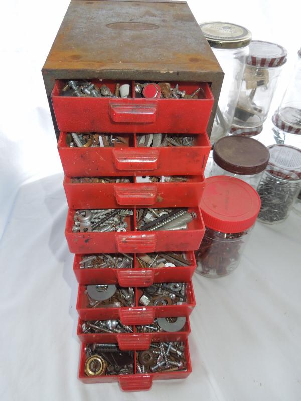 This lot includes a huge assortment of screws, nails, bolts, fasteners and other hardware. Plus two vintage 4 drawer stacking red and grey metal storage cabinets chock full. made by Dunlap. 32 matching jelly jars with lids.