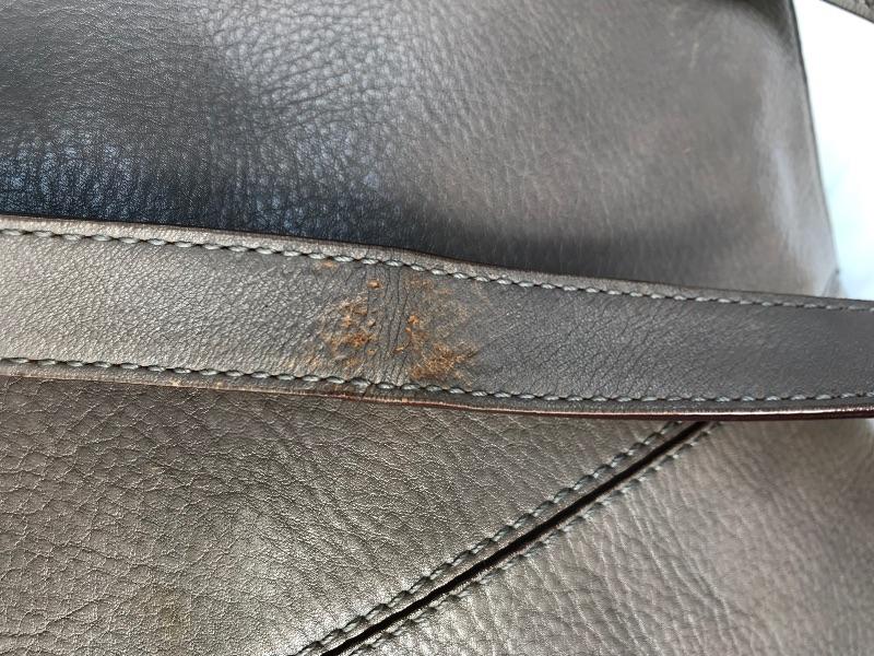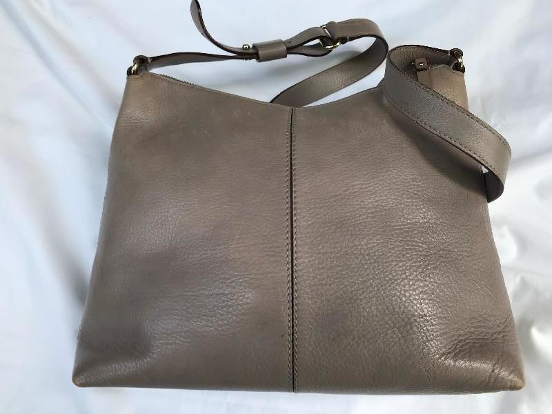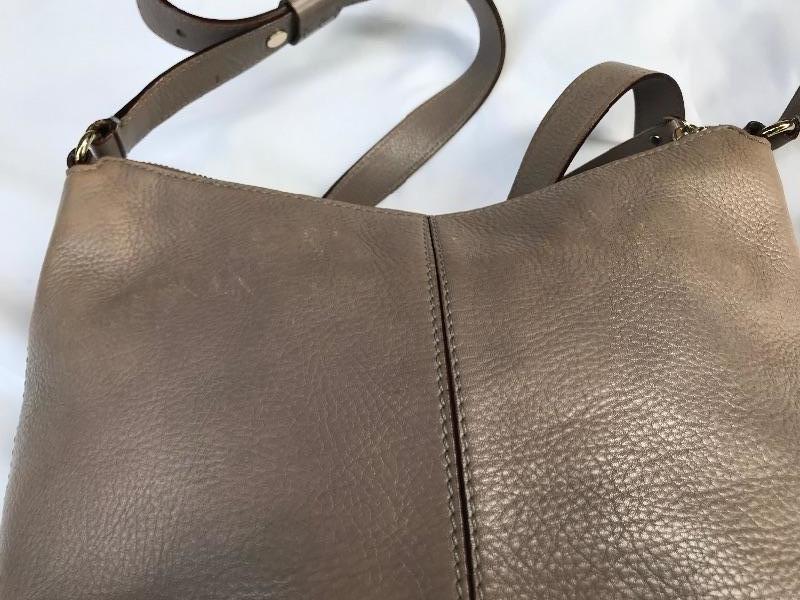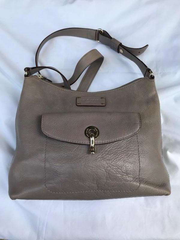 Kate Spade heather gray textured leather crossbody shoulder bag, has a couple of scratches on the strap (see photos) measures 11” long 9-1/2” tall and 4” wide . This bag is gray however lighting in some of the pictures makes it look brown. It is not brown.