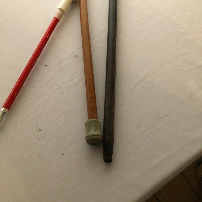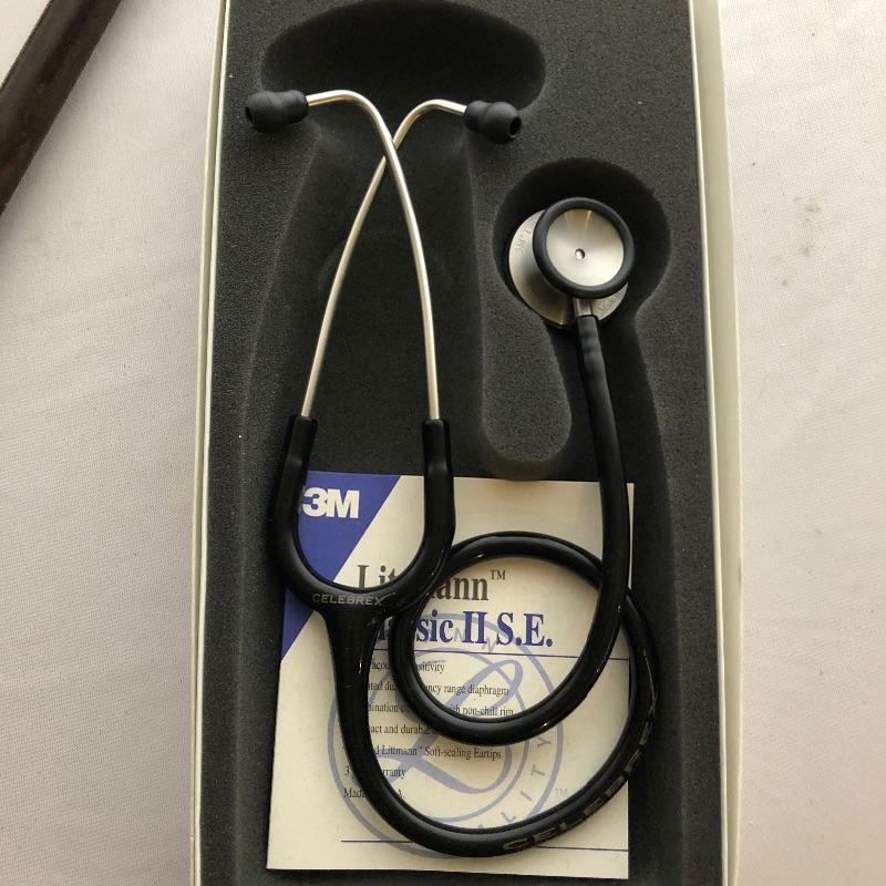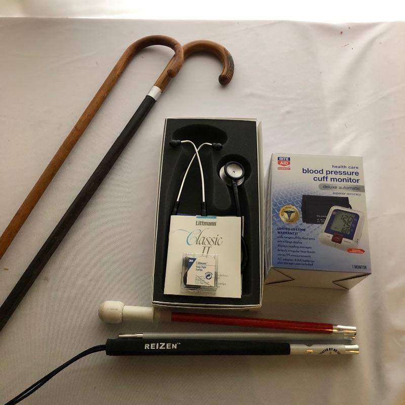 Littmann Classic II Stethoscope that comes in its box with paperwork. Also included are three walking aids which includes two wooden canes and a Reizen collapsible stick. Lastly a blood pressure cuff monitor in box.