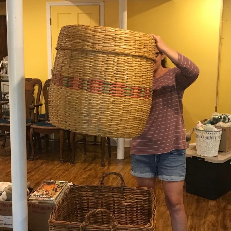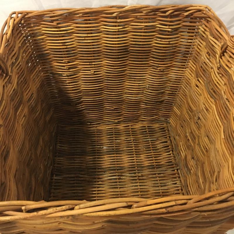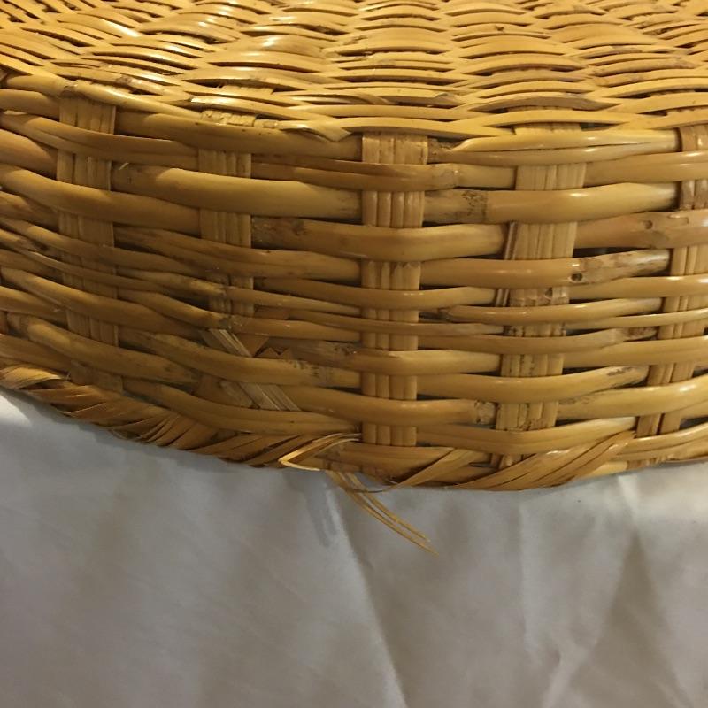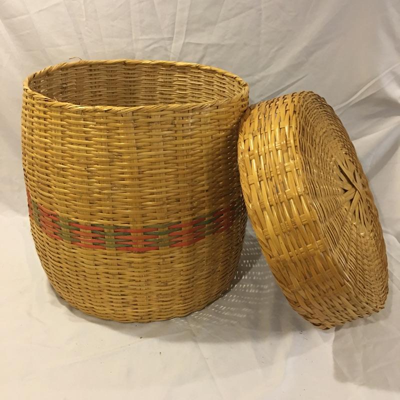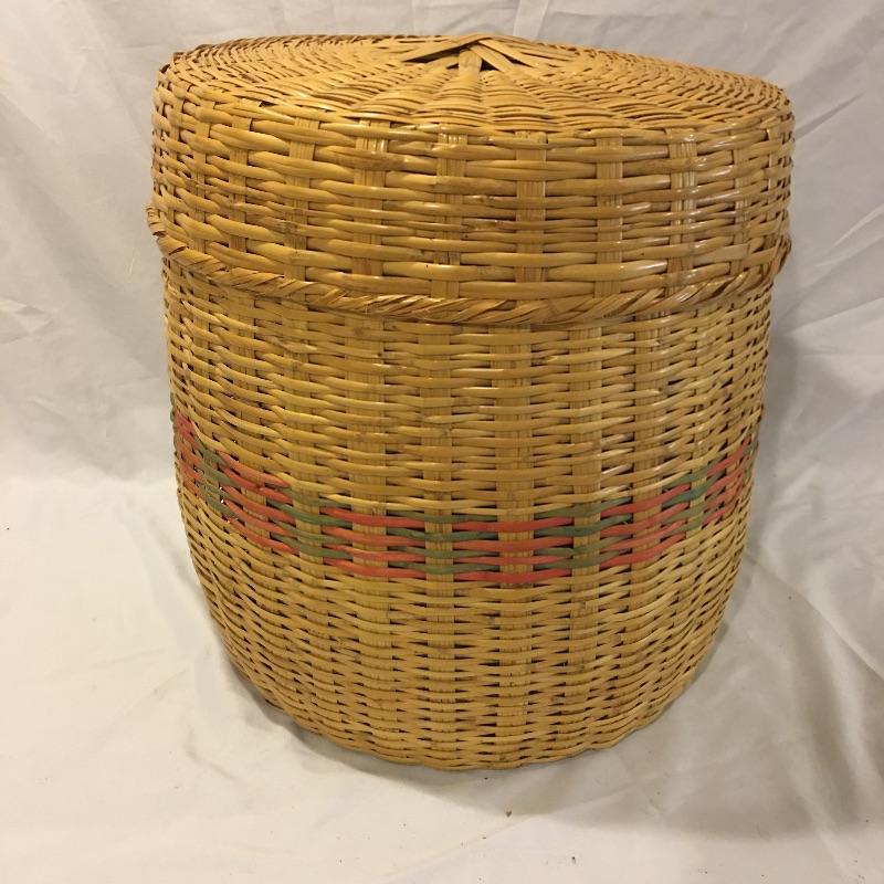 This pair of baskets will be a great place to store blankets or whatever else you can think of. Round basket has top and measures 22”D x 22” tall and the other basket has two handles with a open top. The top on round basket has some fraying, see pictures.