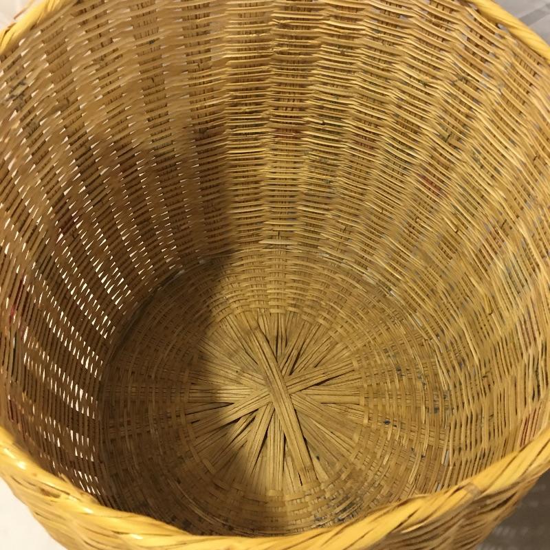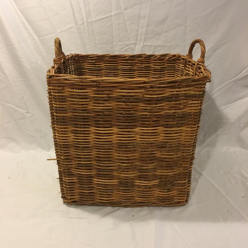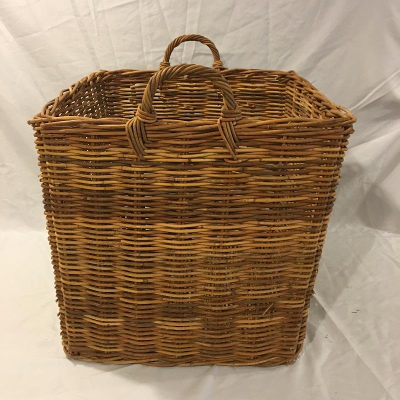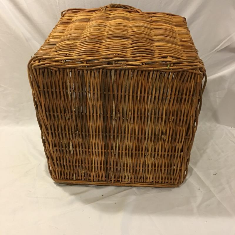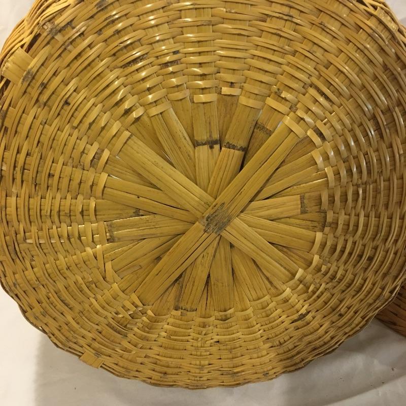 This pair of baskets will be a great place to store blankets or whatever else you can think of. Round basket has top and measures 22”D x 22” tall and the other basket has two handles with a open top. The top on round basket has some fraying, see pictures.