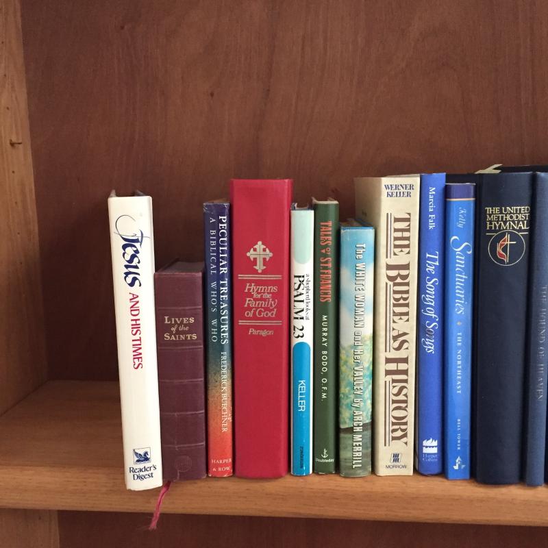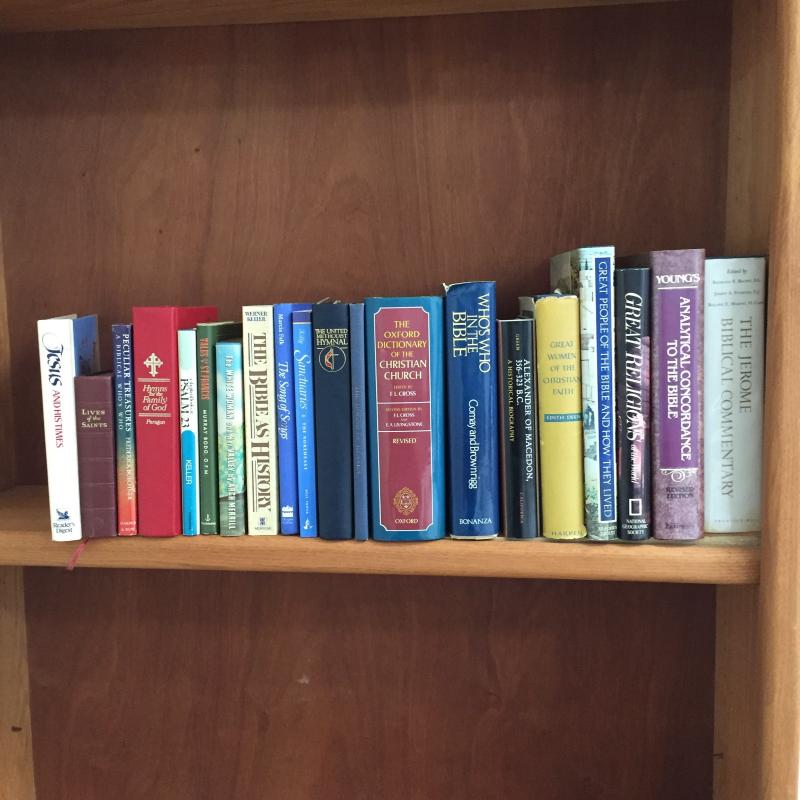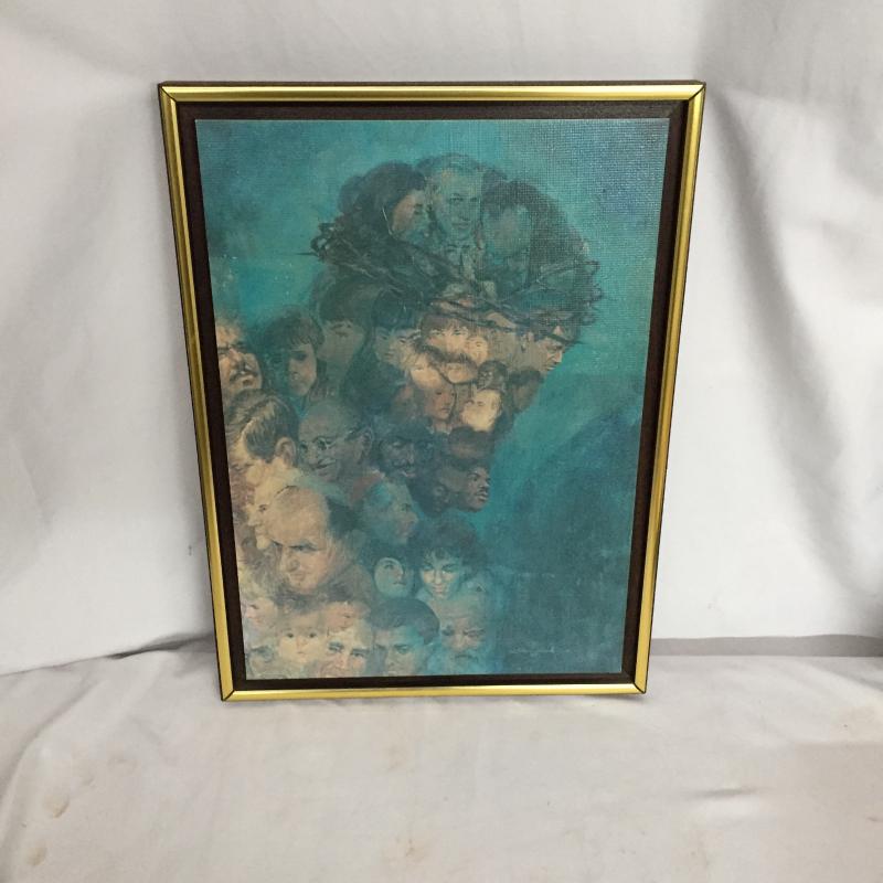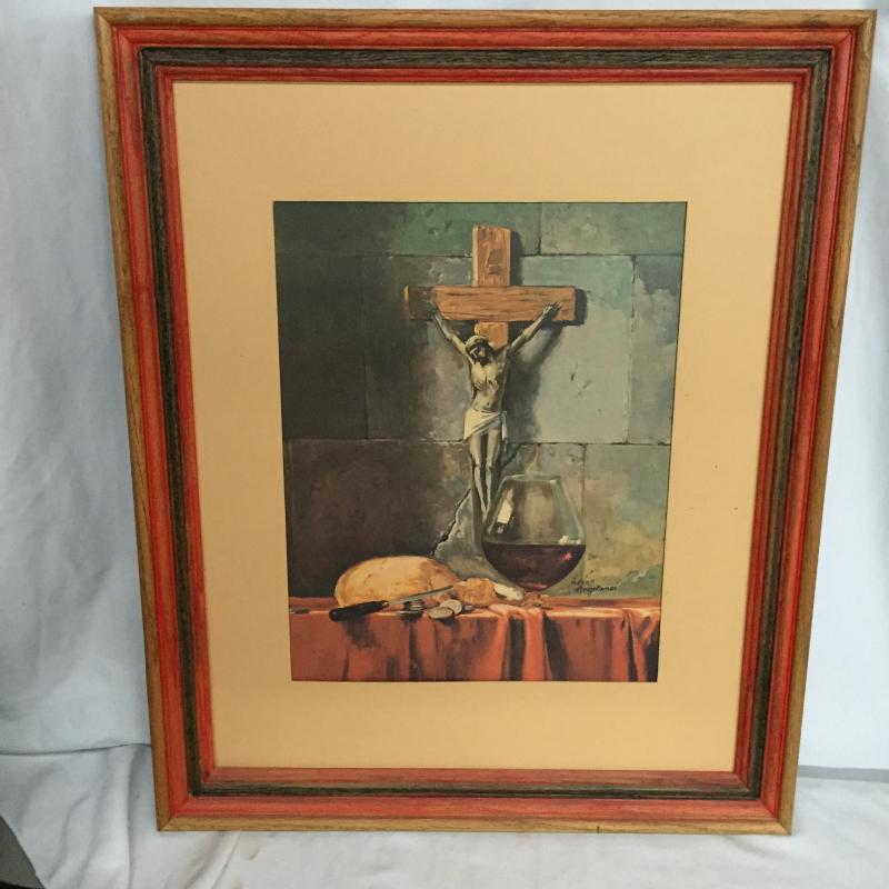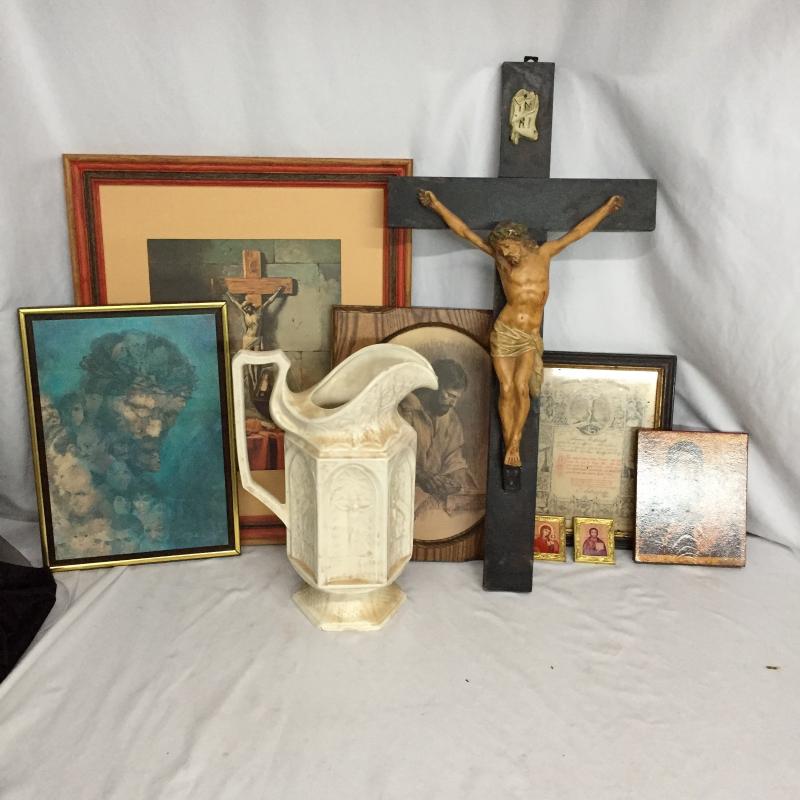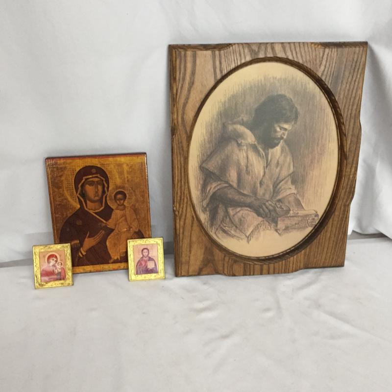 Portraits of Jesus,Pitcher,Religious Books and Jesus on the Cross. Largest Painting Measures 22.5” x 18.75”.