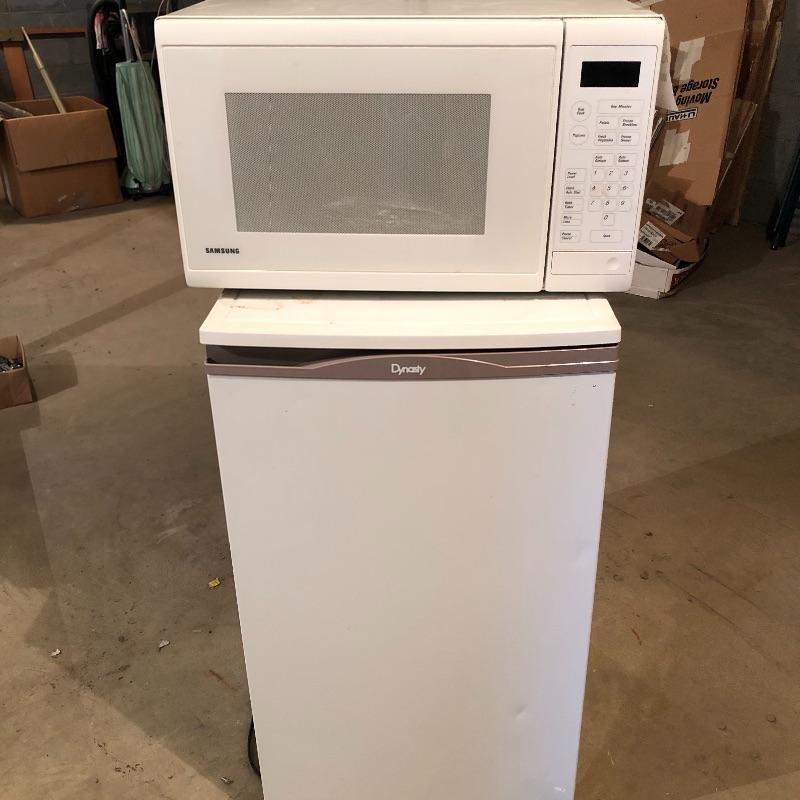 Add a Samsung microwave and dynasty mini -fridge to your home! The microwave measures 21 1/2” x 12” x 14 1/2”.The dynasty fridge measures 19” x 32 1/2” x 21”. It has a freezer inside of it and comes with three shelves. Local pick up only.