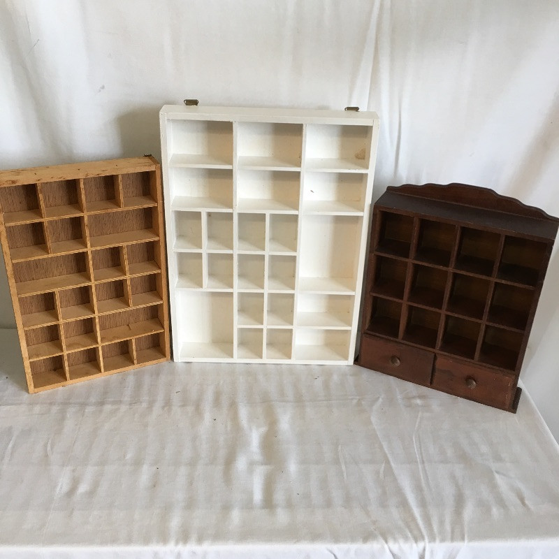 A nice variety of three shadow boxes. A great way to display your small treasures. The largest shadow box measures 12” x 16” x 2”.