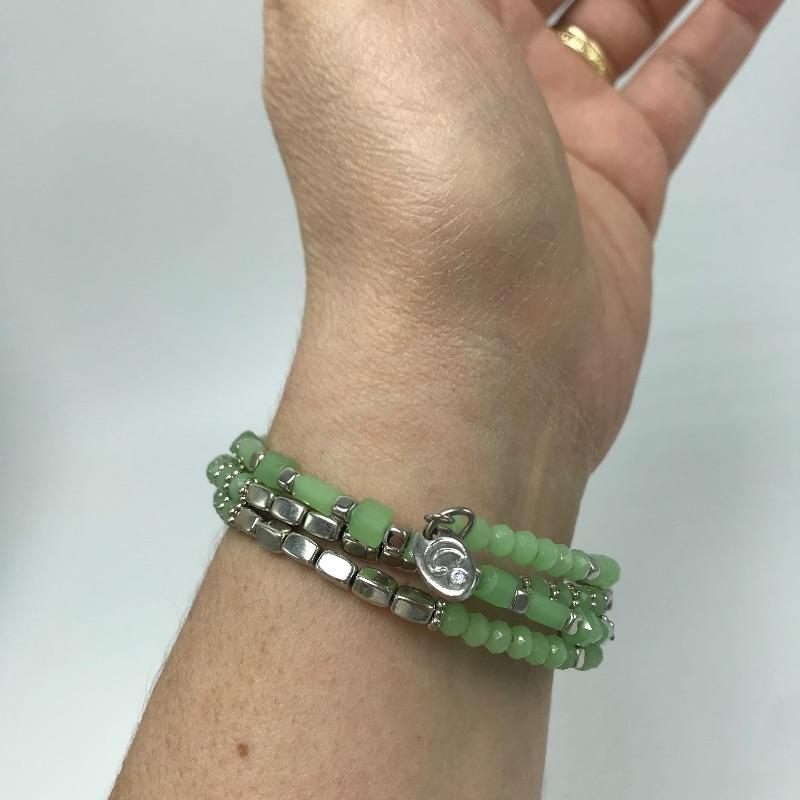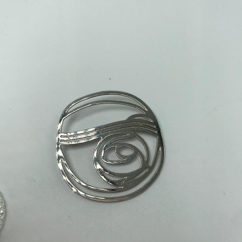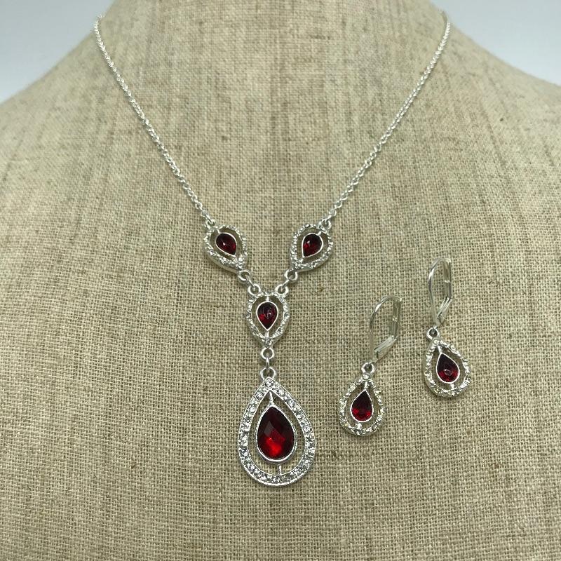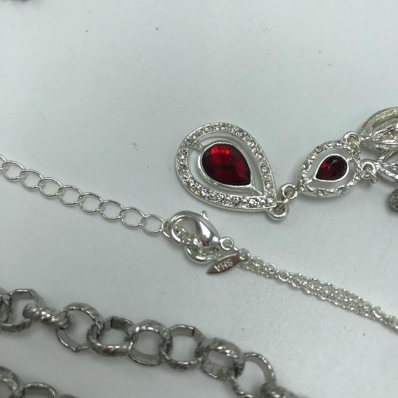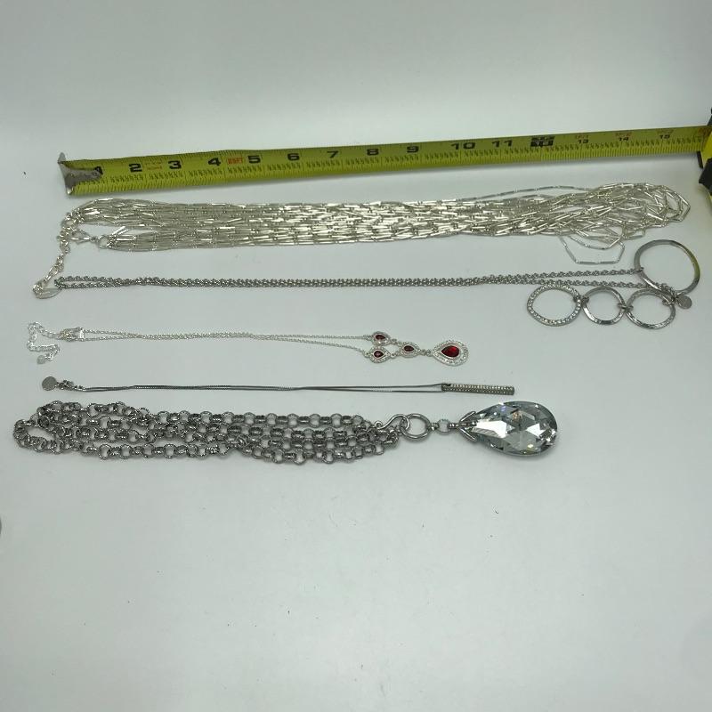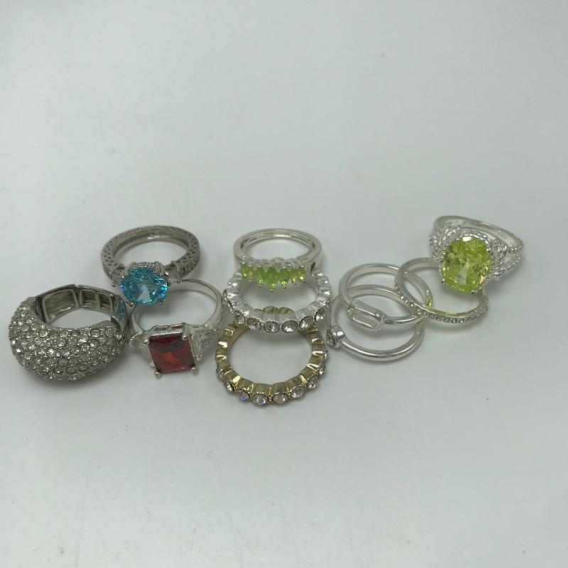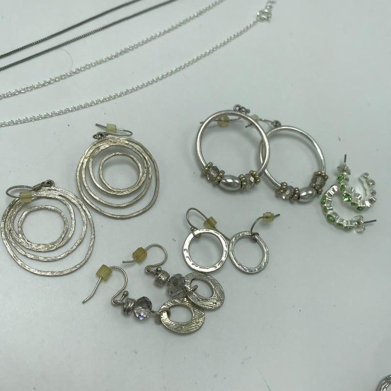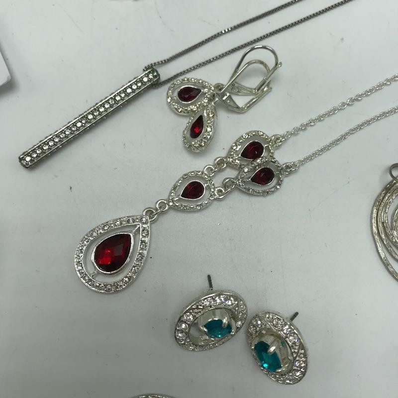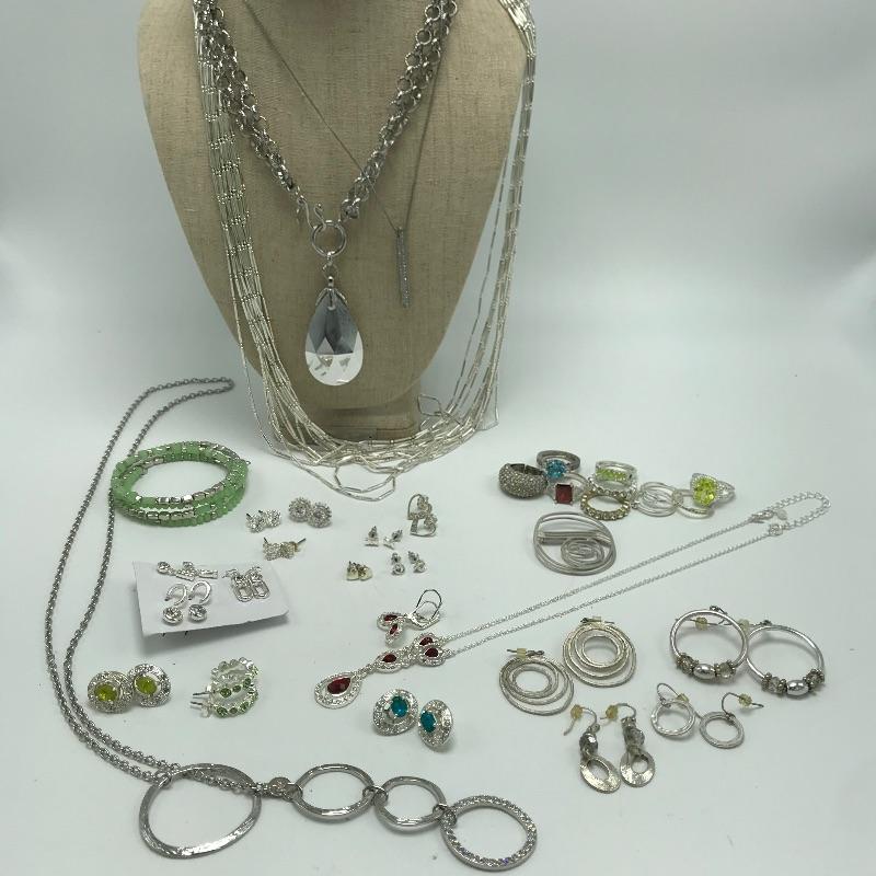 Large lot of mostly silver colored fashion jewelry with sparkly gems. Lot includes rings, necklaces, earrings for pierced ears and one pin. The nice variety of rings sized between 7.5 and 8.5 and one expandable ring. One stunning crimson colored jeweled set by SHA is sure to add dazzle and the multiple strand chain is by Coldwater Creek. Most others are by Chico’s or are not marked. Lot also includes a fun “swatch” like earring collection where mix and match is possible. One jade colored beaded wrap bracelet is also included.