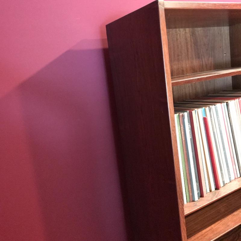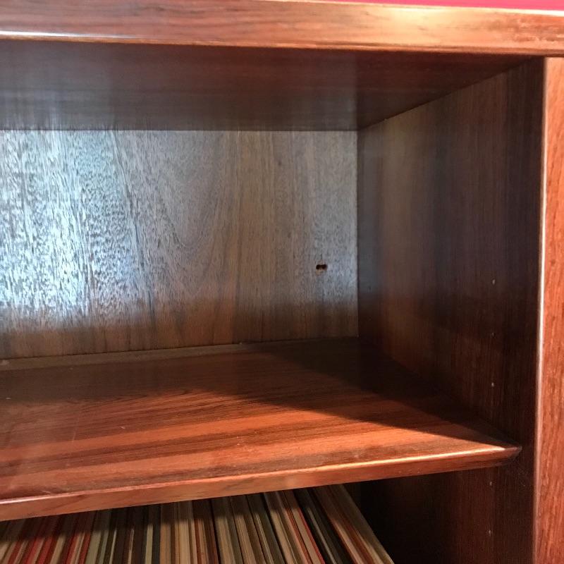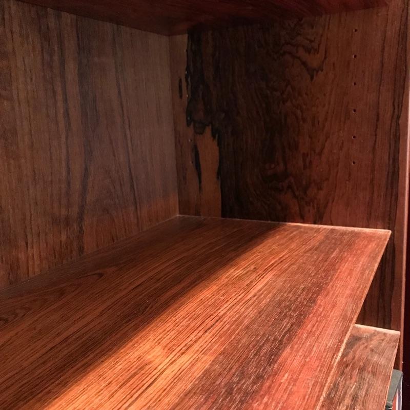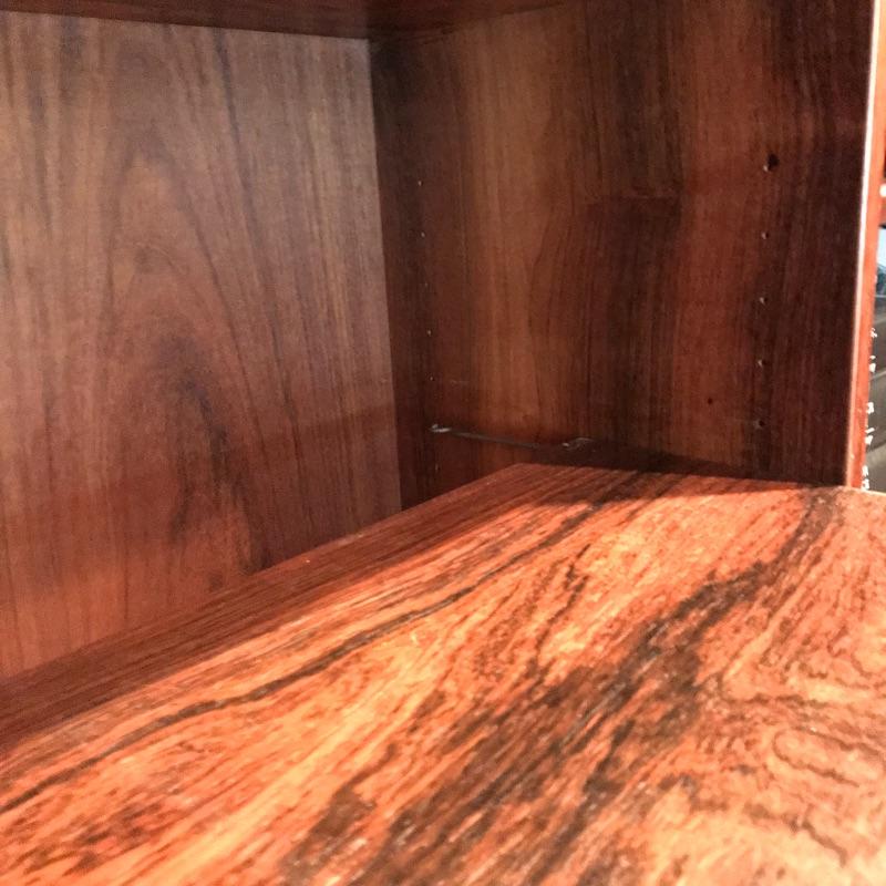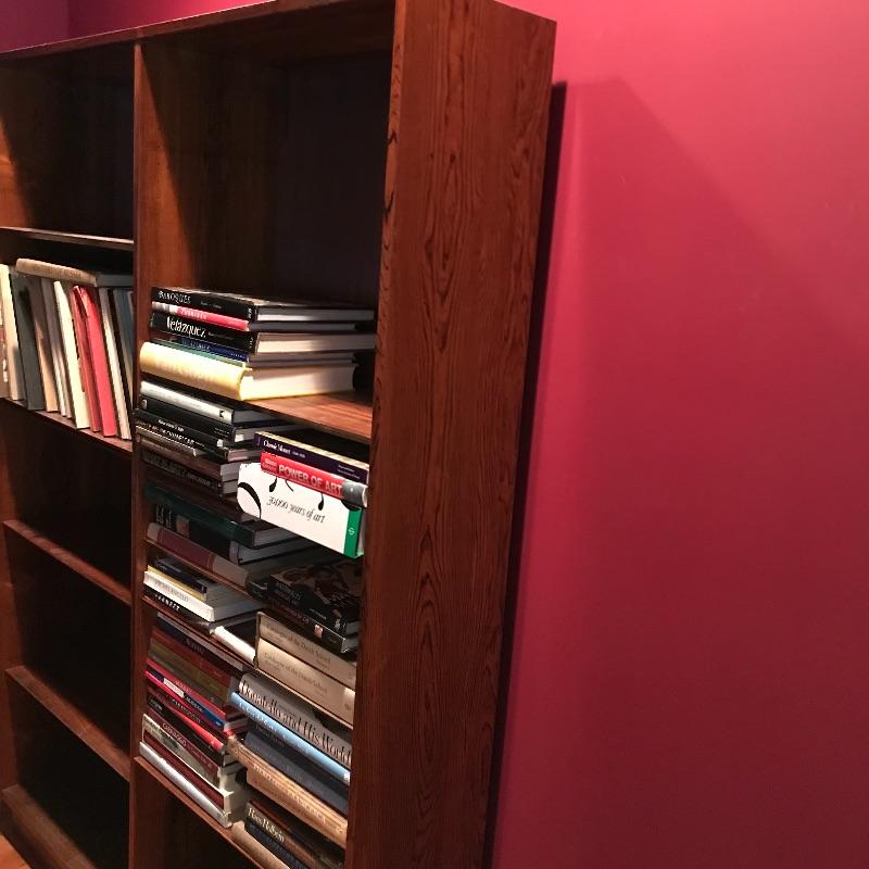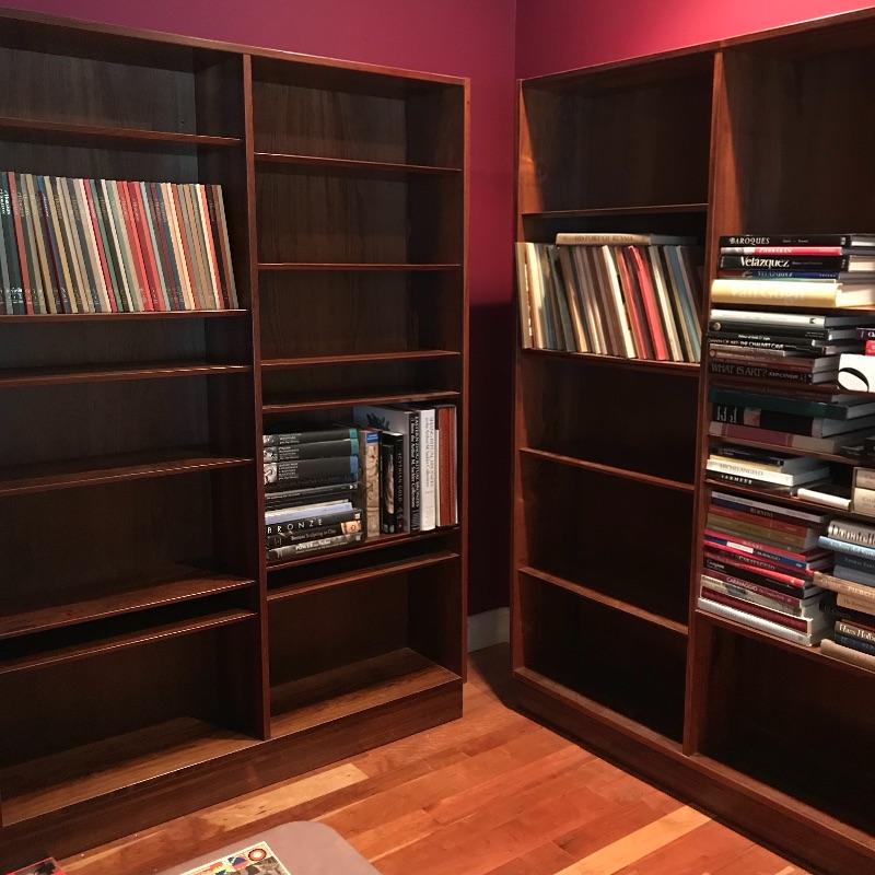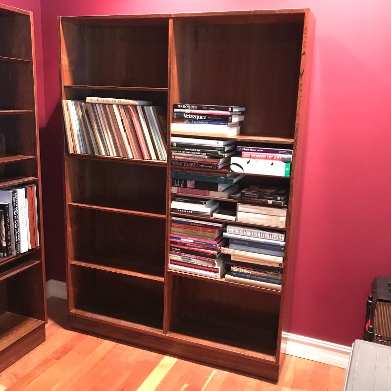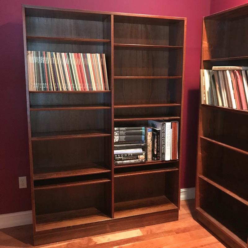 Two handsome tall matching bookshelves. Both have beautiful wood grain and a nice cherry finish. Shelves measure approximately 54.5” x 12” x 77” and have one fixed shelf in the middle of each compartment. All other shelves are adjustable. Bookshelves appear to be of high quality plywood with laminate. Books in photos are not included, but can be found in lots 164, 172 and 174. No shipping.