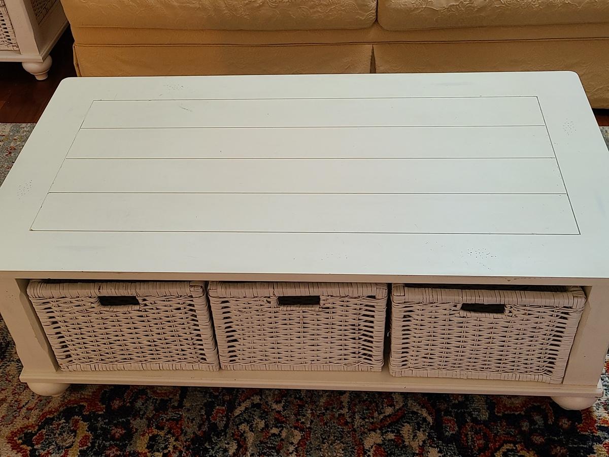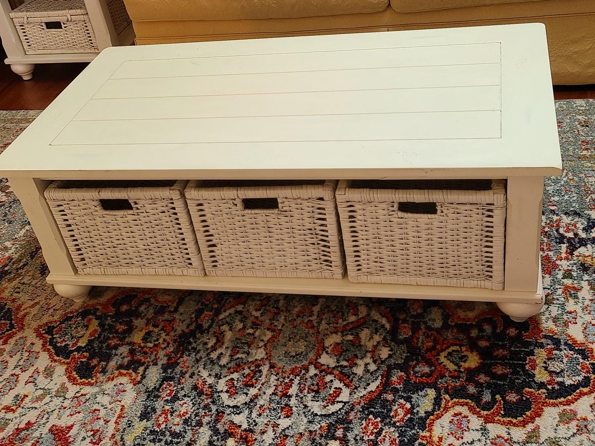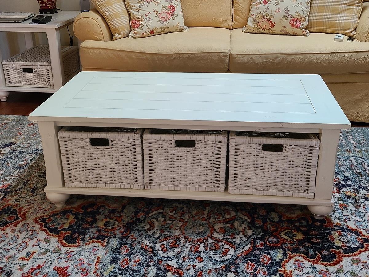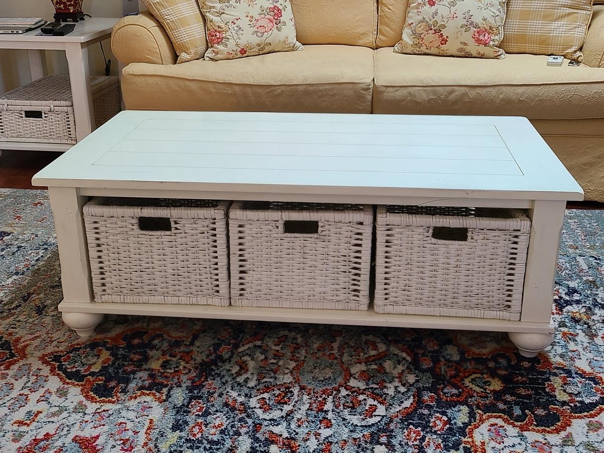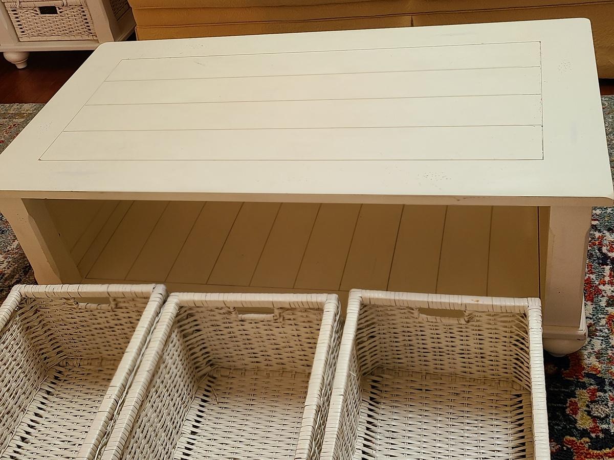 Lot 174: Shabby Chic/Farmhouse Design White Coffee Table with Basket Storage