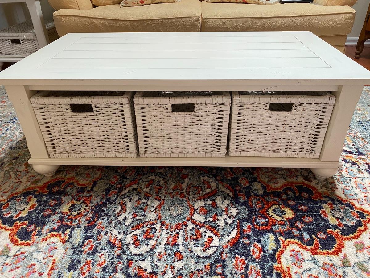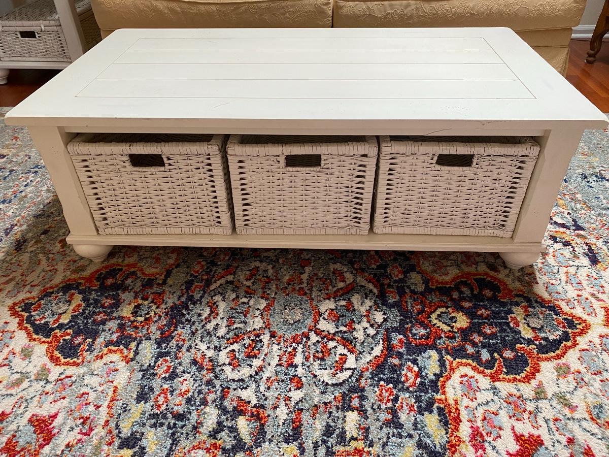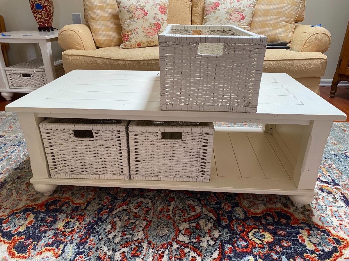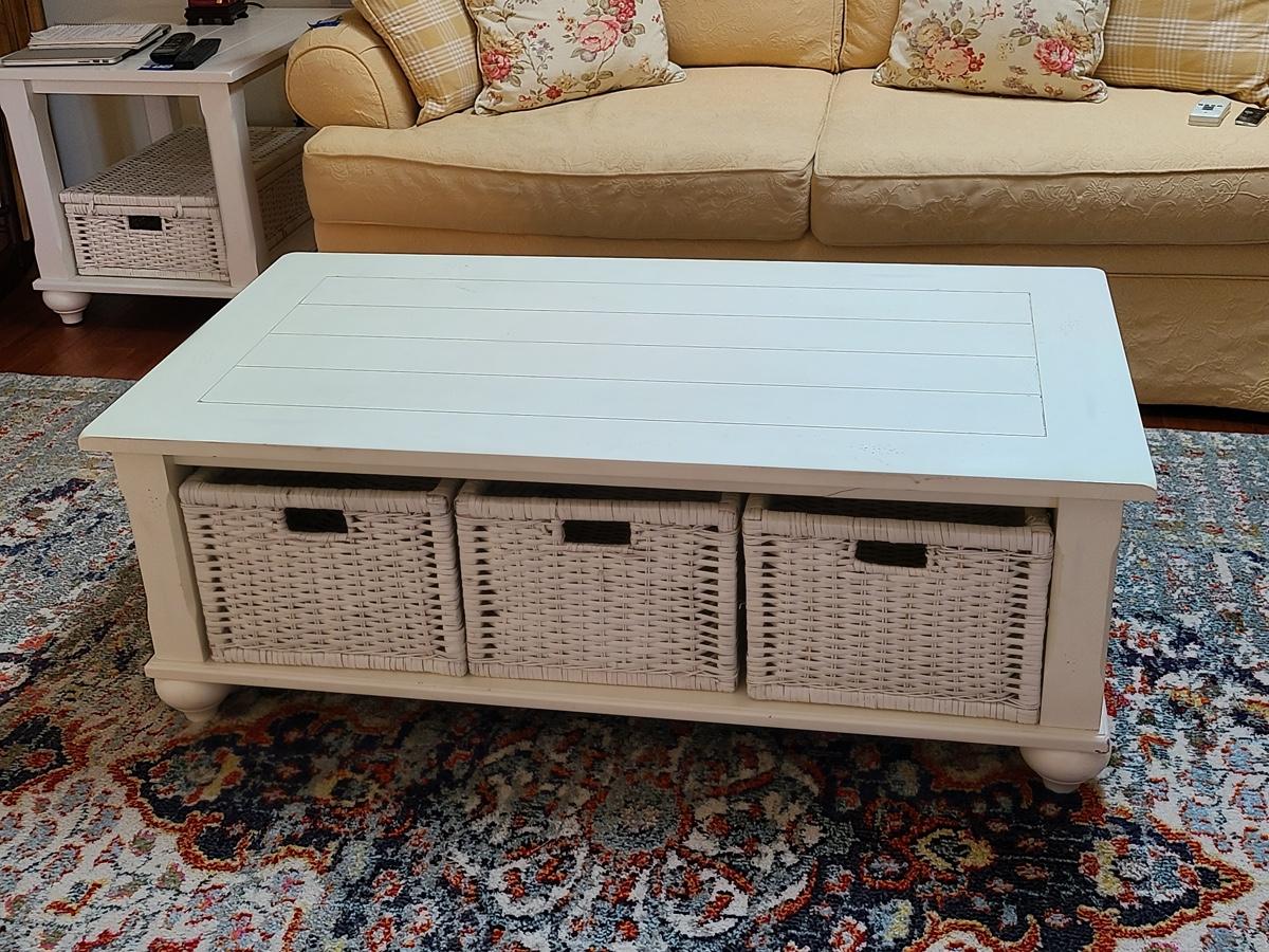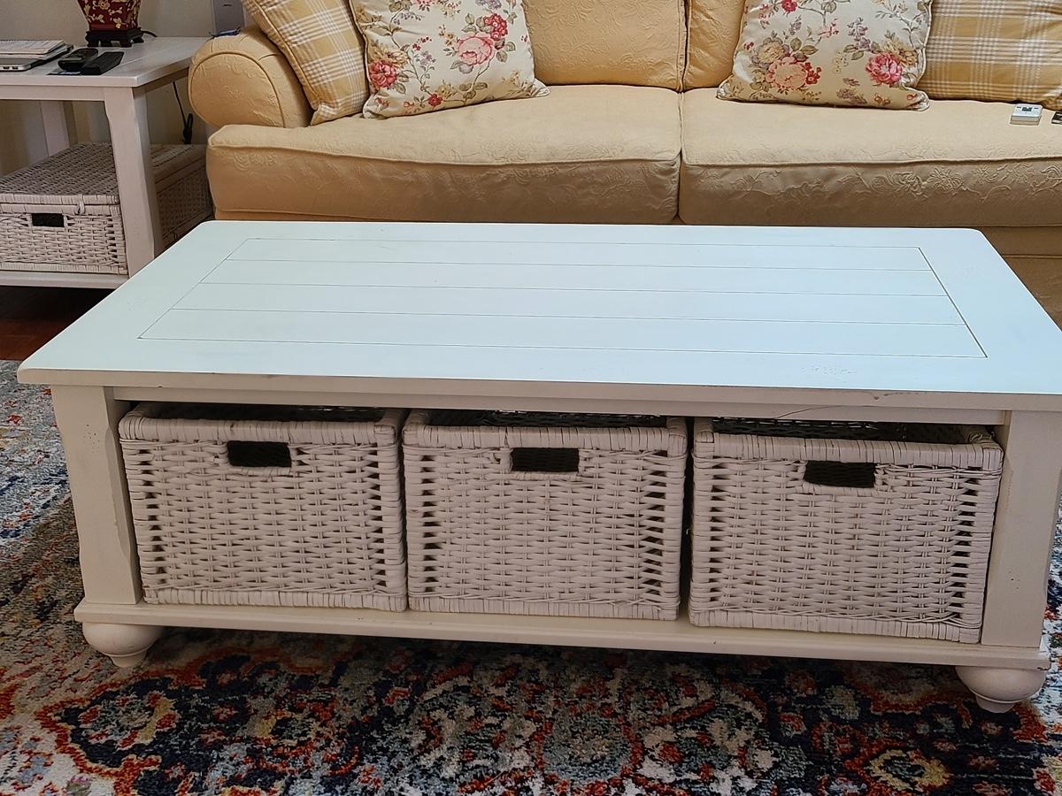 Lot 174: Shabby Chic/Farmhouse Design White Coffee Table with Basket Storage