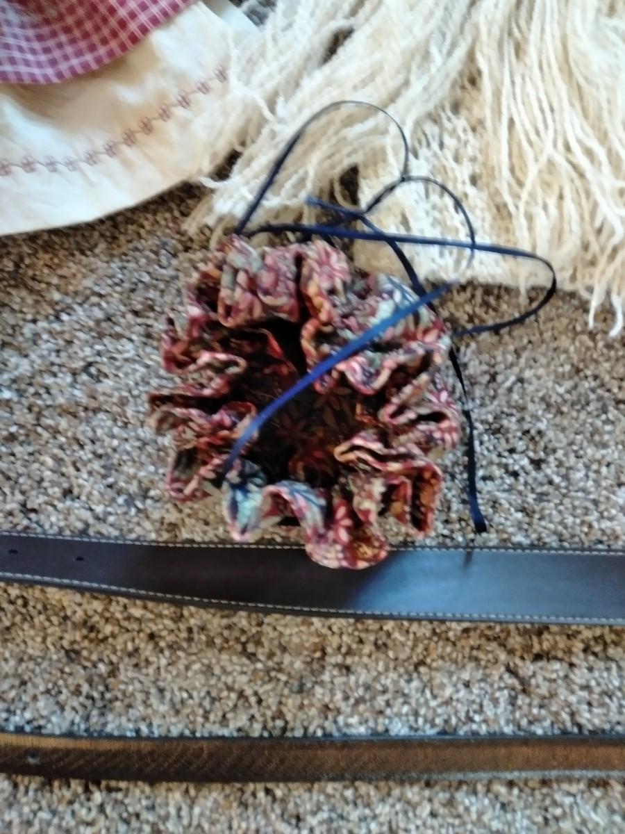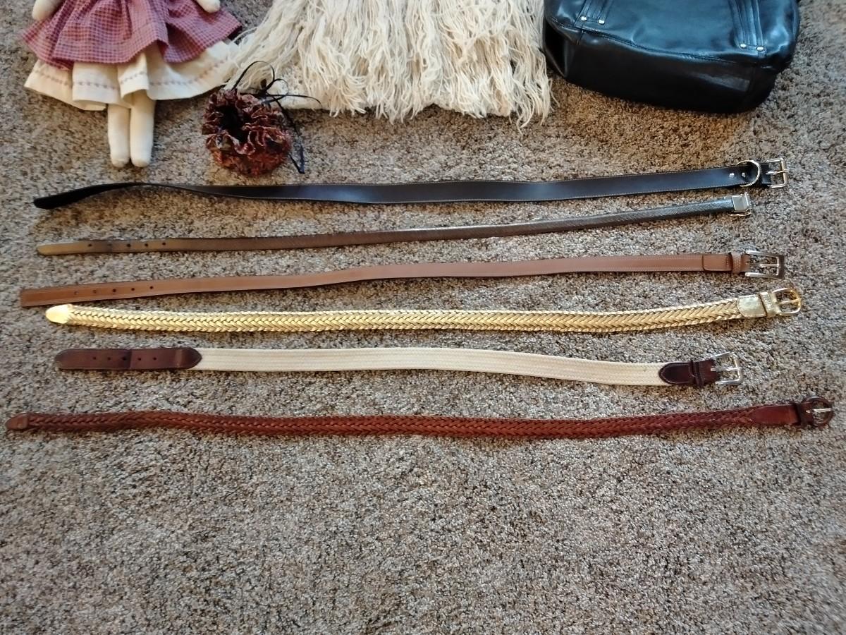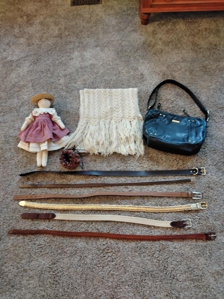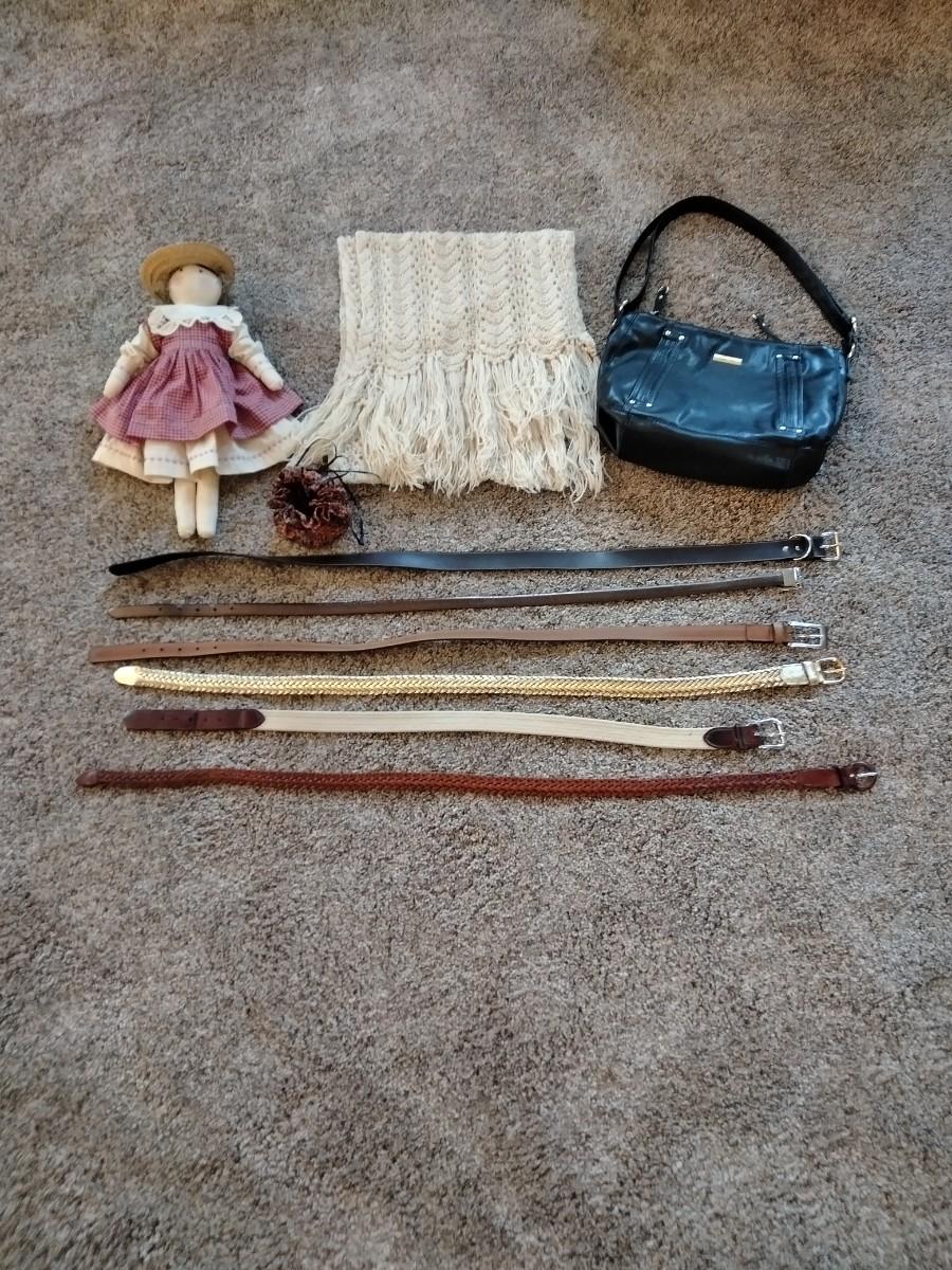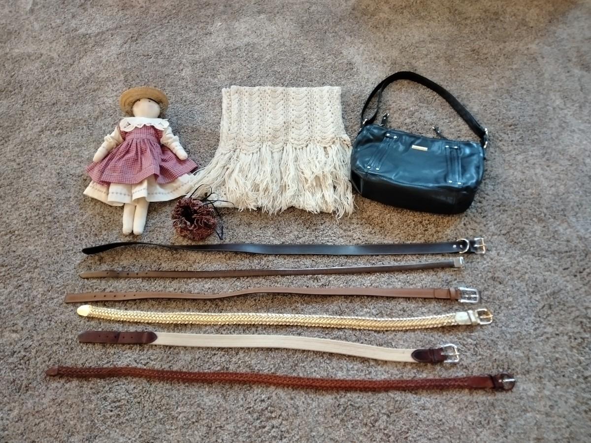 MARC FISHER PURSE, CLOTH DOLL, SMALL POUCH BAG, WHITE KNIT SCARF, AND SIX DIFFERENT BELTS.