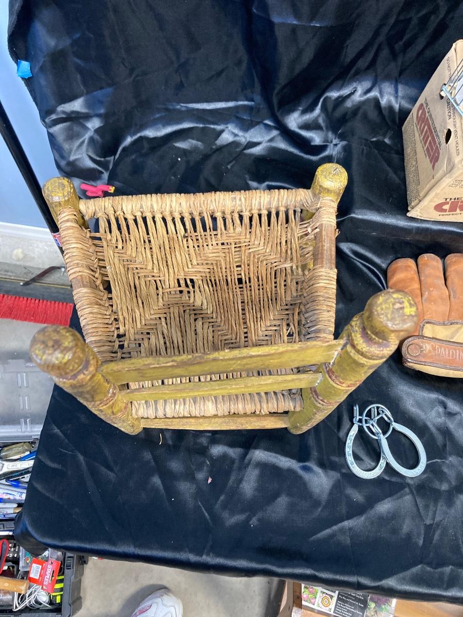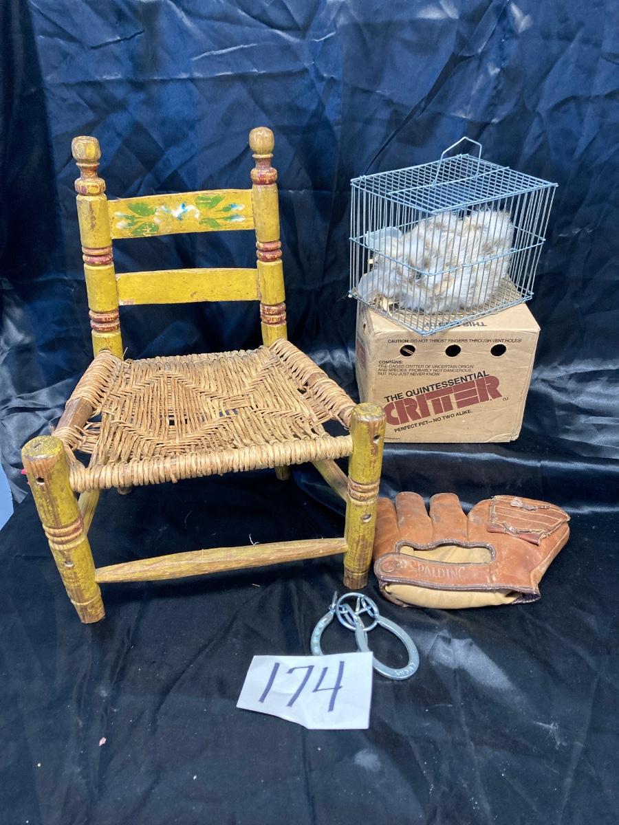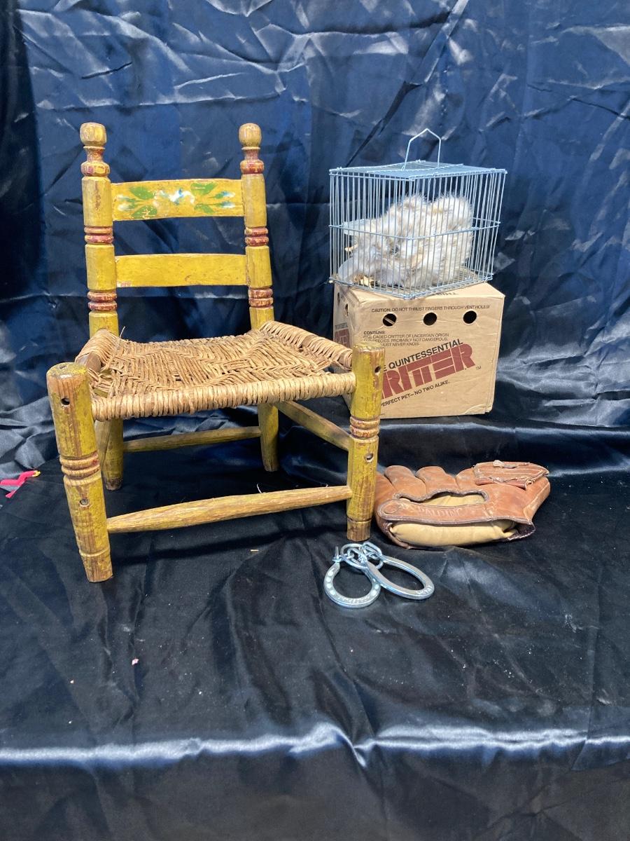 THE CHILD SIZED BASE BALL GLOVE IS AN ADORABLE LITTLE SMALL THING. THIS CUTE LITTLE CHAIR IS IN NEED OF SOME TLC BUT DEFINITELY COOL AND WORTH IT!