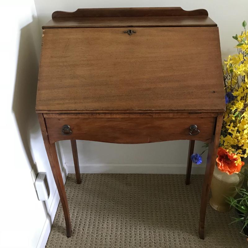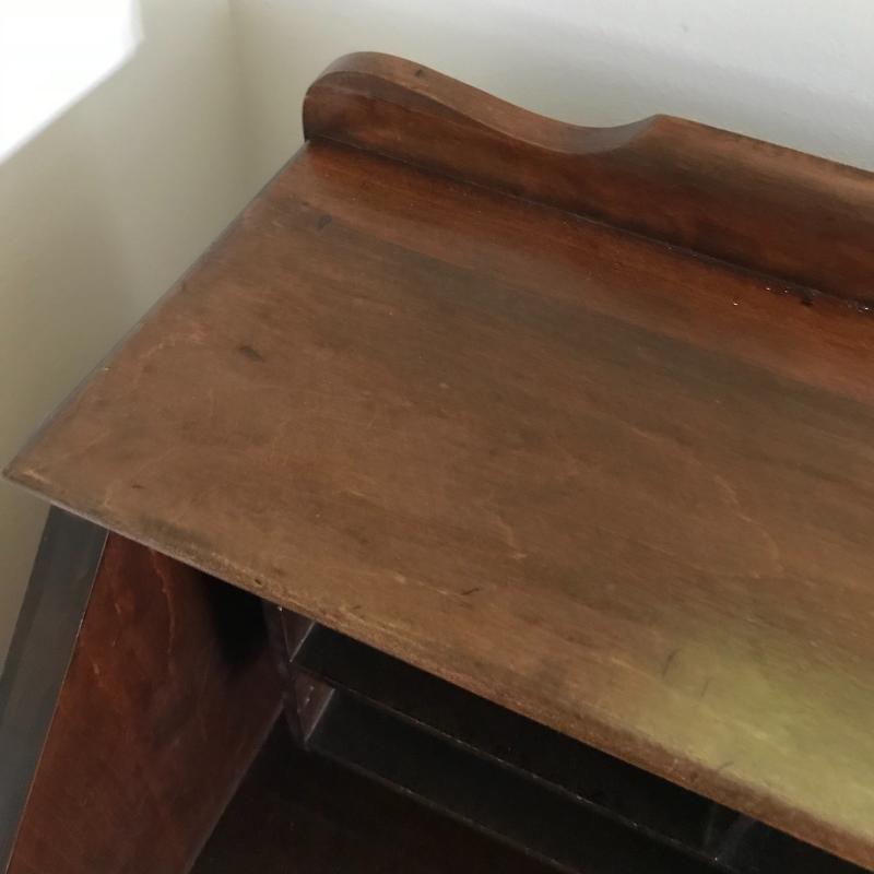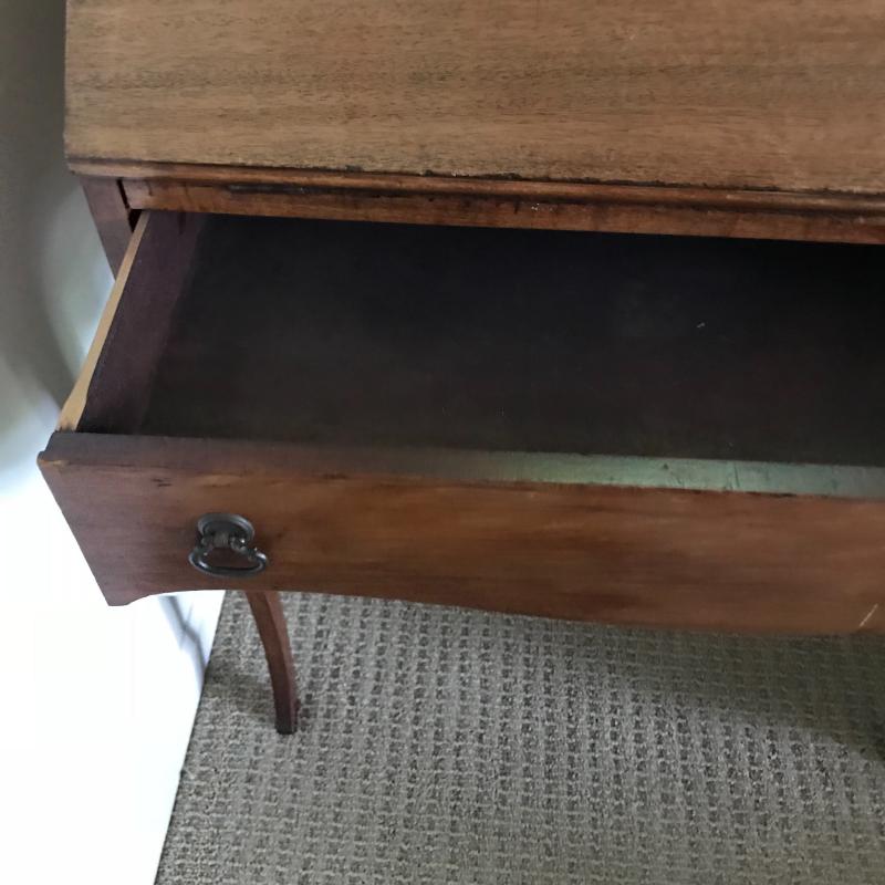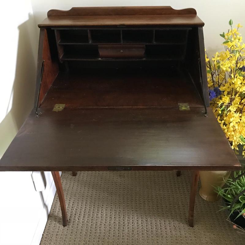 This antique secretary is the perfect size for a small space. In good condition. The small drawer inside has some parts that are molding that need reattachment but drawer works without them. Approx. 27” x 16.5” x 40” h. No shipping available. Local pickup only in Arden, NC.