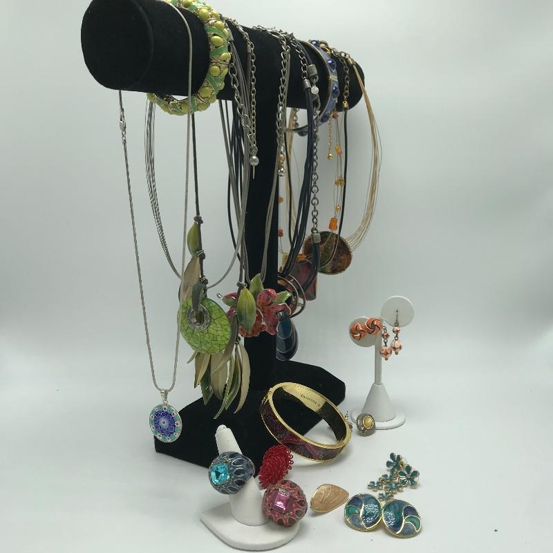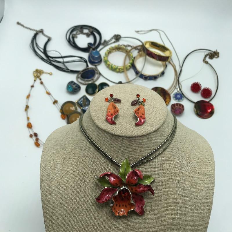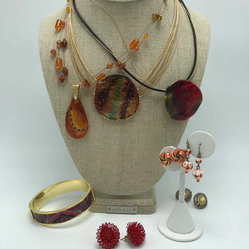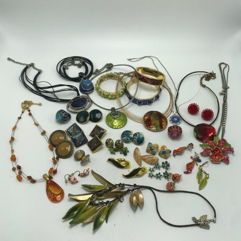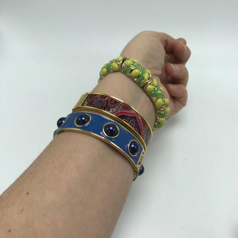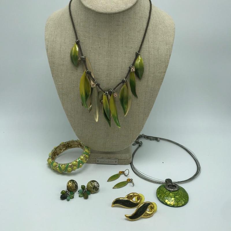 Sweet bold collection from places like Chico’s, Talbots and more. Large painted-like pendants and other statement pieces. Some pieces appear like enamel, some have swirled paint like features and others are more traditional styles. The green and yellow bracelet is stretch style while the other two bracelets are hinged.