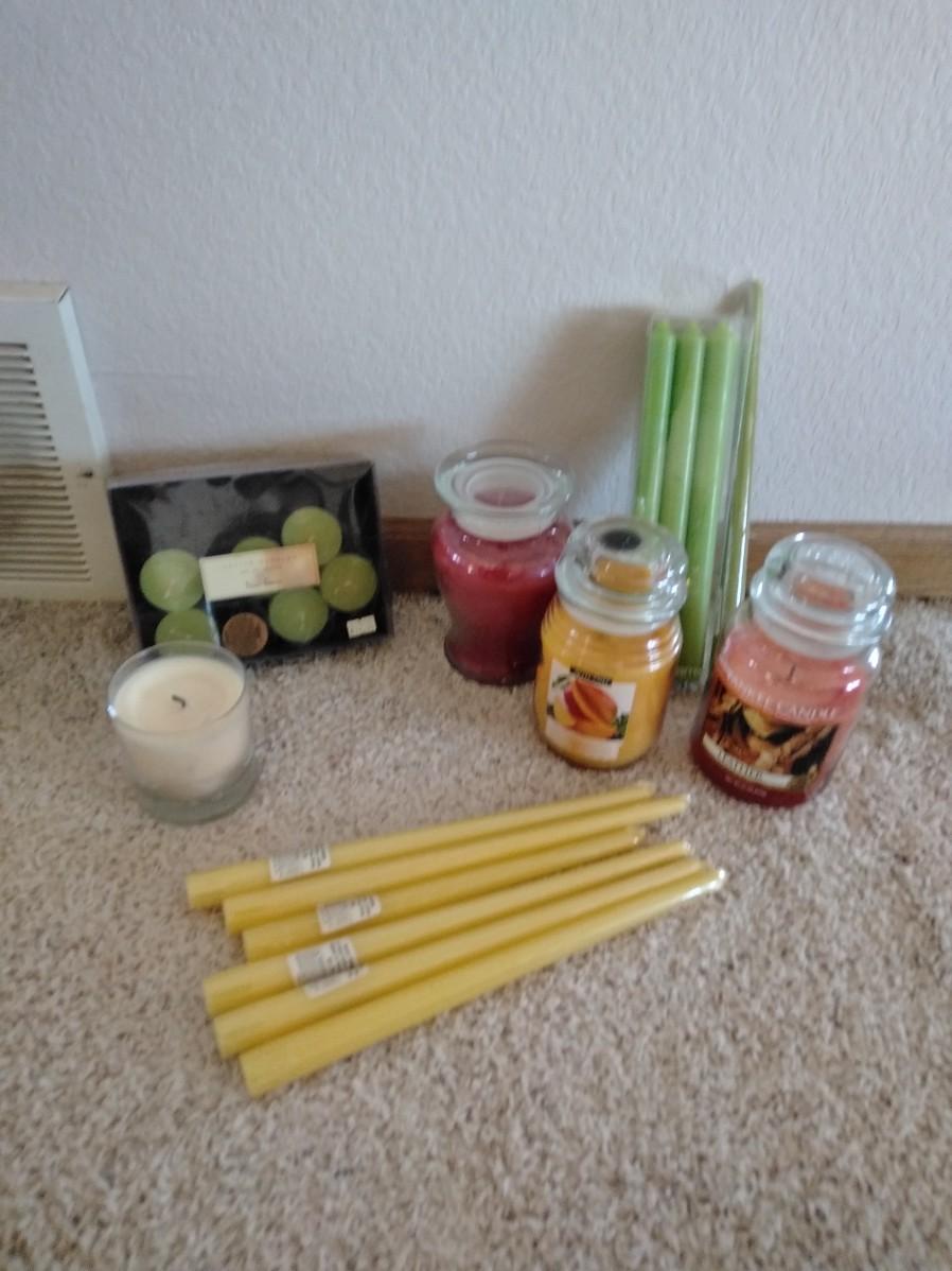 CANDLE STICKS, TEA CANDLES AND CANDLES IN A JAR.