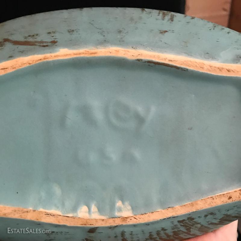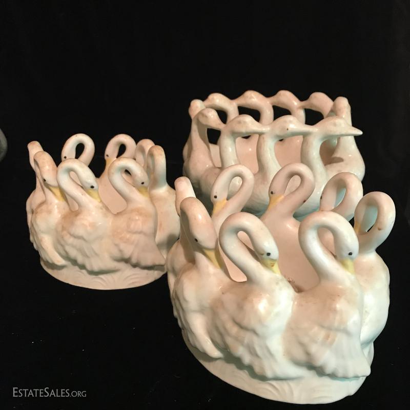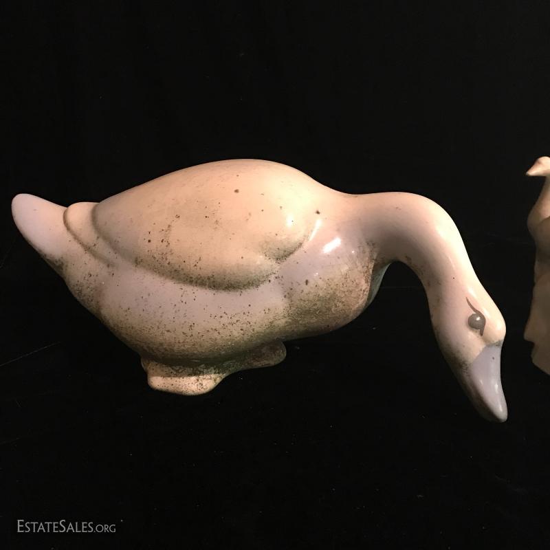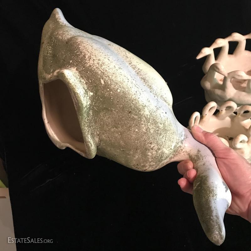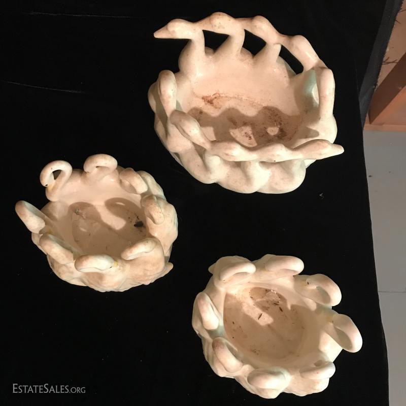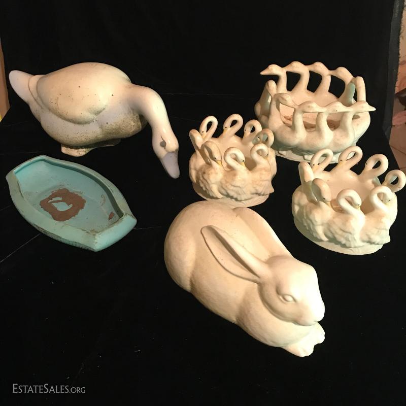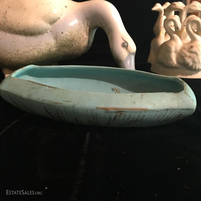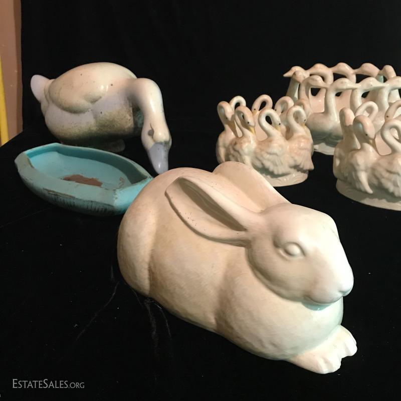 Ceramic swan measures 16" x 6" x 7" and is a bit grungy from outside use. Rabbit measures 12" x 6" x 6" and the 2 matching swan planters or vases measure 6.5" x 5" x 5.5". Teal colored low McCoy dish has some gold accents. This lot is available for shipping or local pick up in Flat Rock, NC.