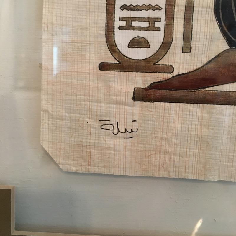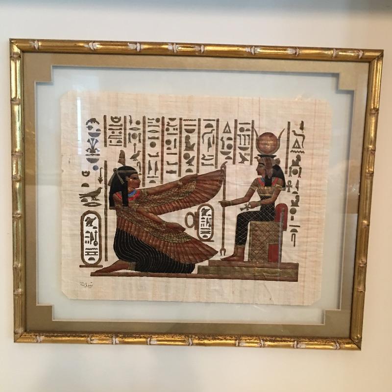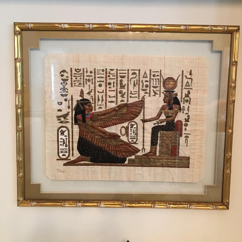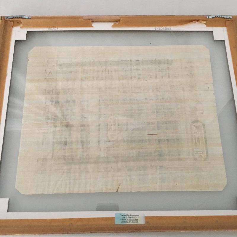 A stunning piece here that is an Egyptian Papyrus artwork framed and behind glass. Marvel at how the papyrus is taken from the inside of the triangular stalk and cut or peeled into long strips to make a writing material or artist canvas. Frame measures 17” x 20”.