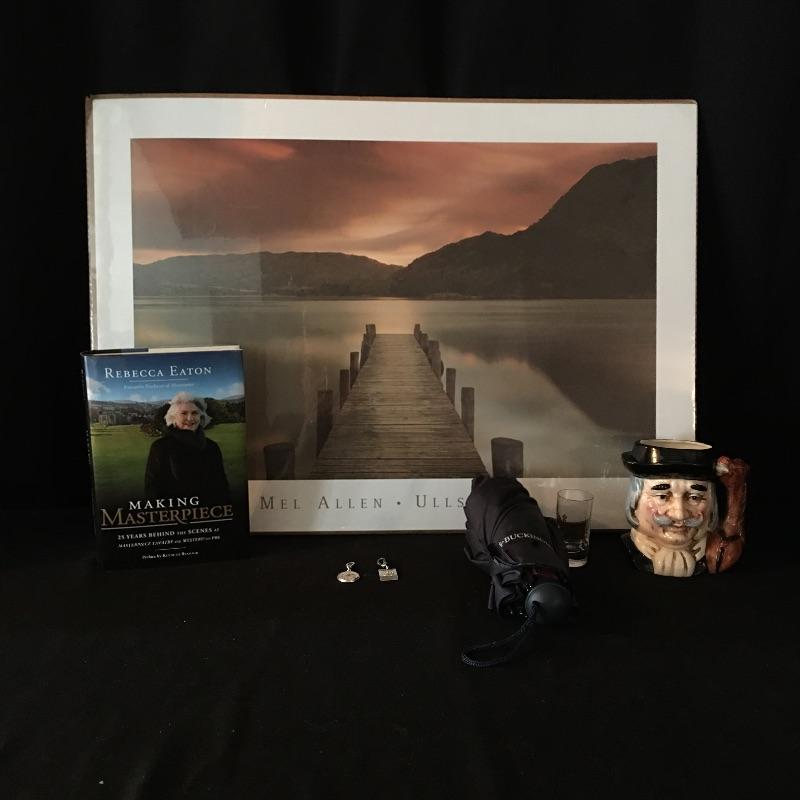 This array of England includes print of Lake Ullswater, Buckingham Palace umbrella and shot glass, Toby Mug of Shakespeare, two charms, The Great Bear print and a book titled “Making Masterpiece “.