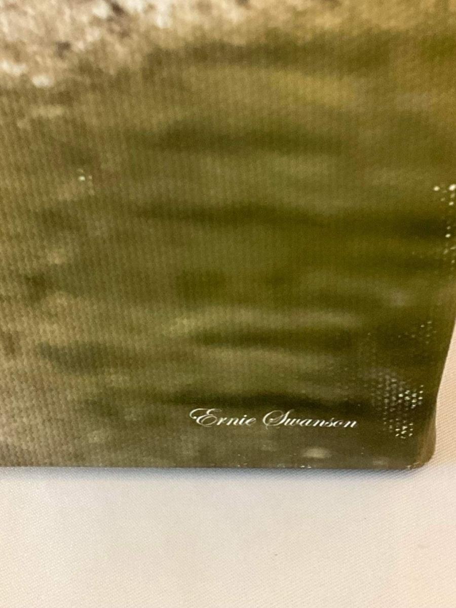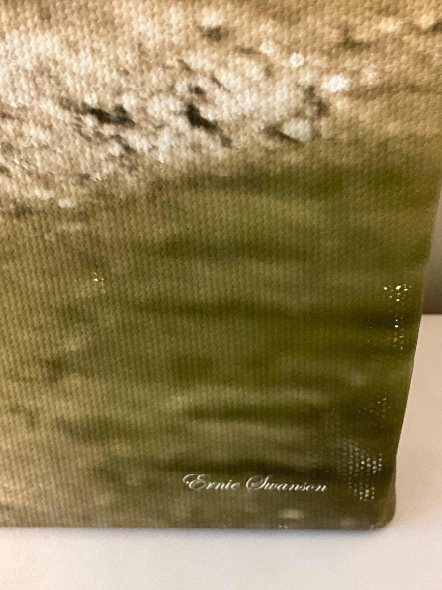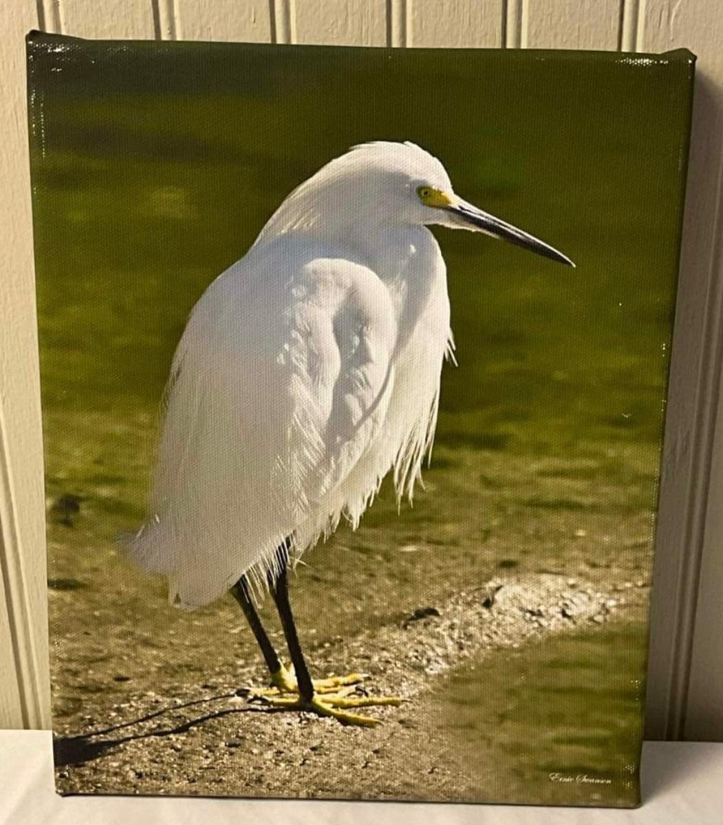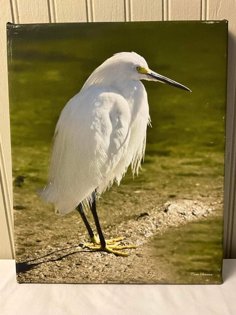 Egret photograph on canvas. Stamped Ernie Swanson. Measures 11 inches tall and 9 inches wide