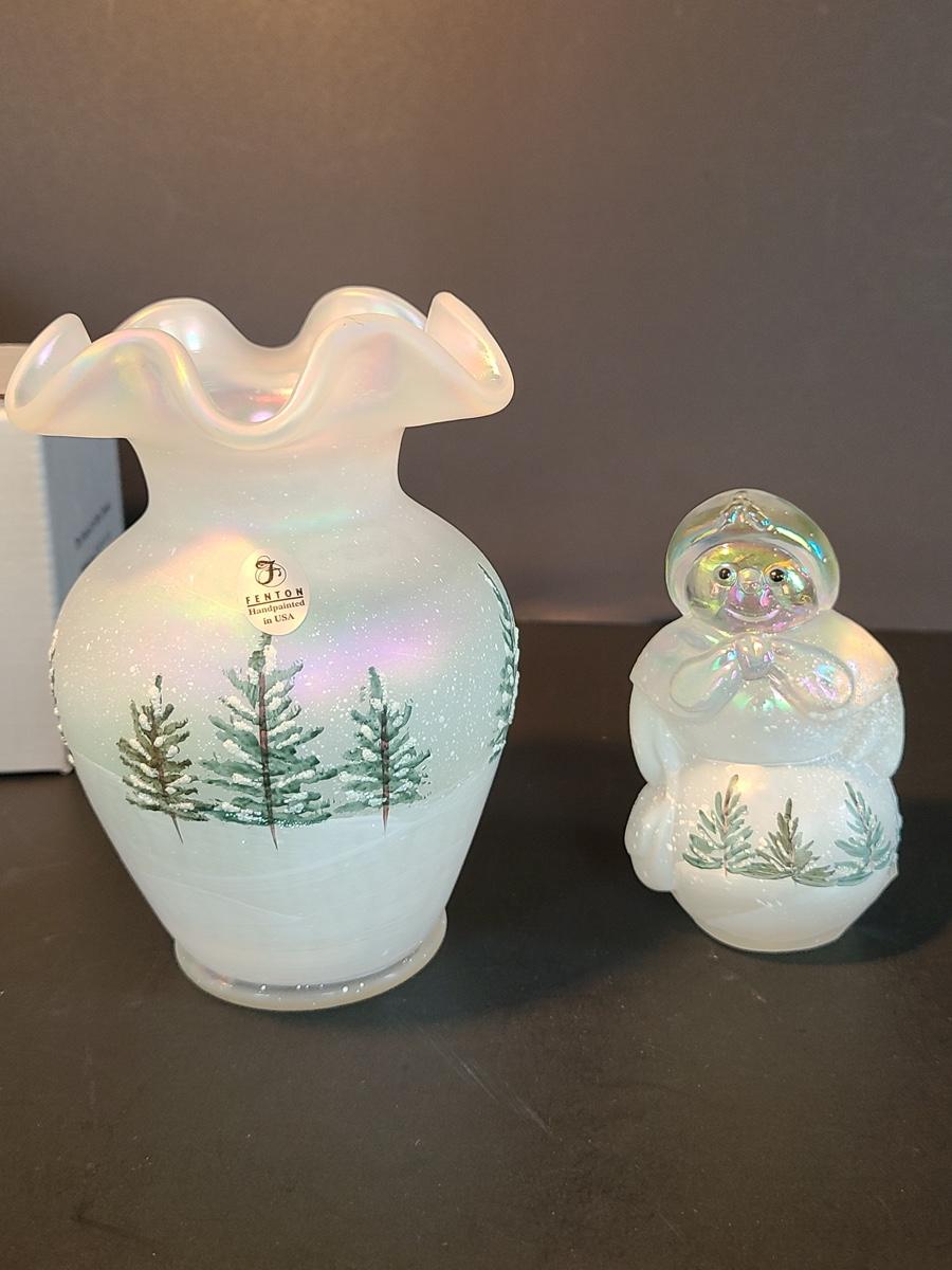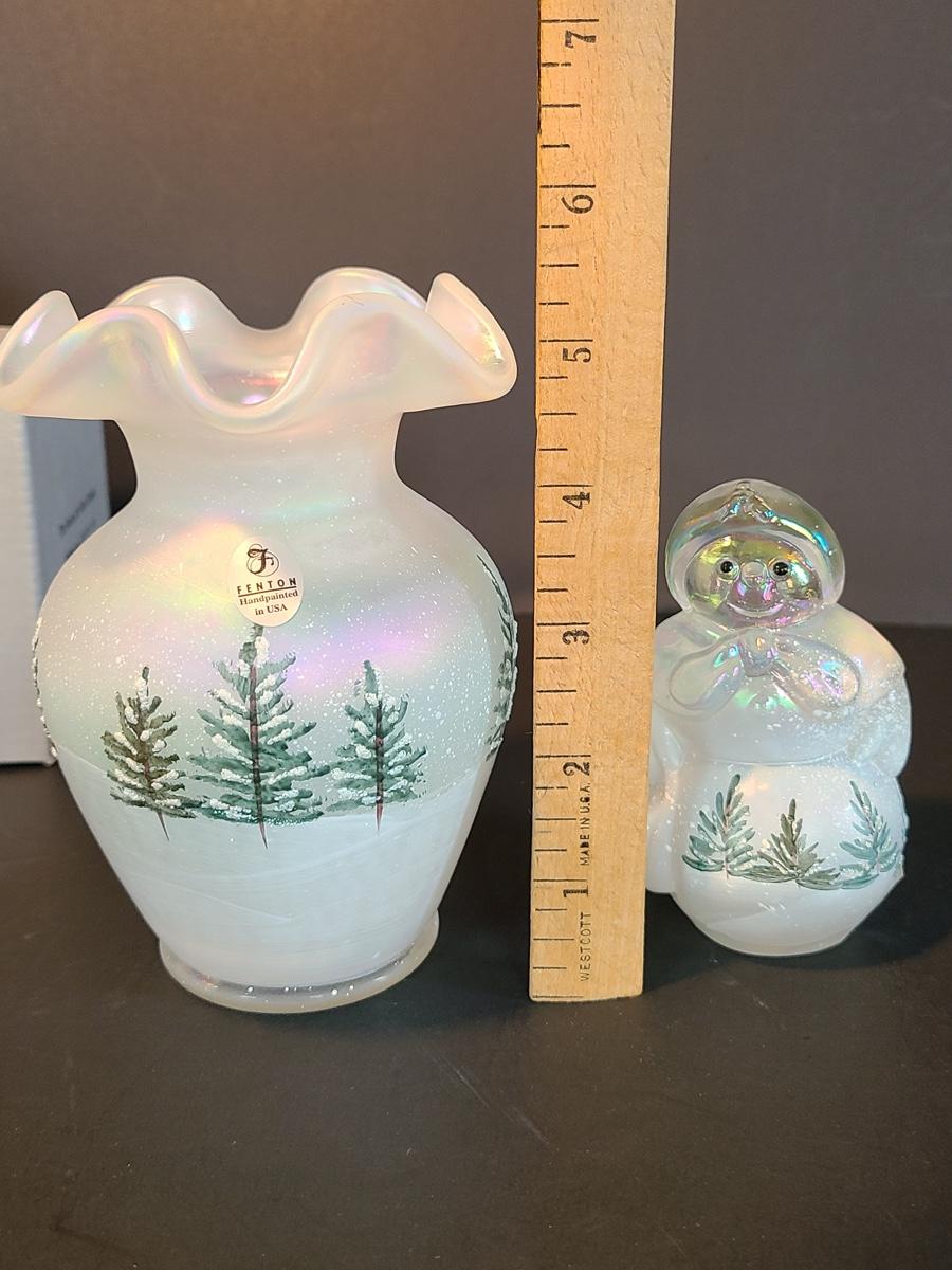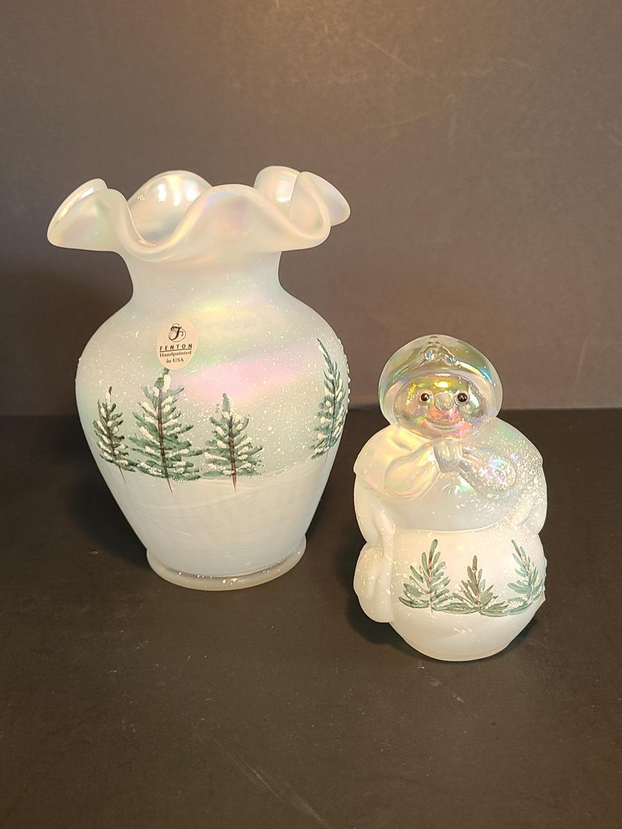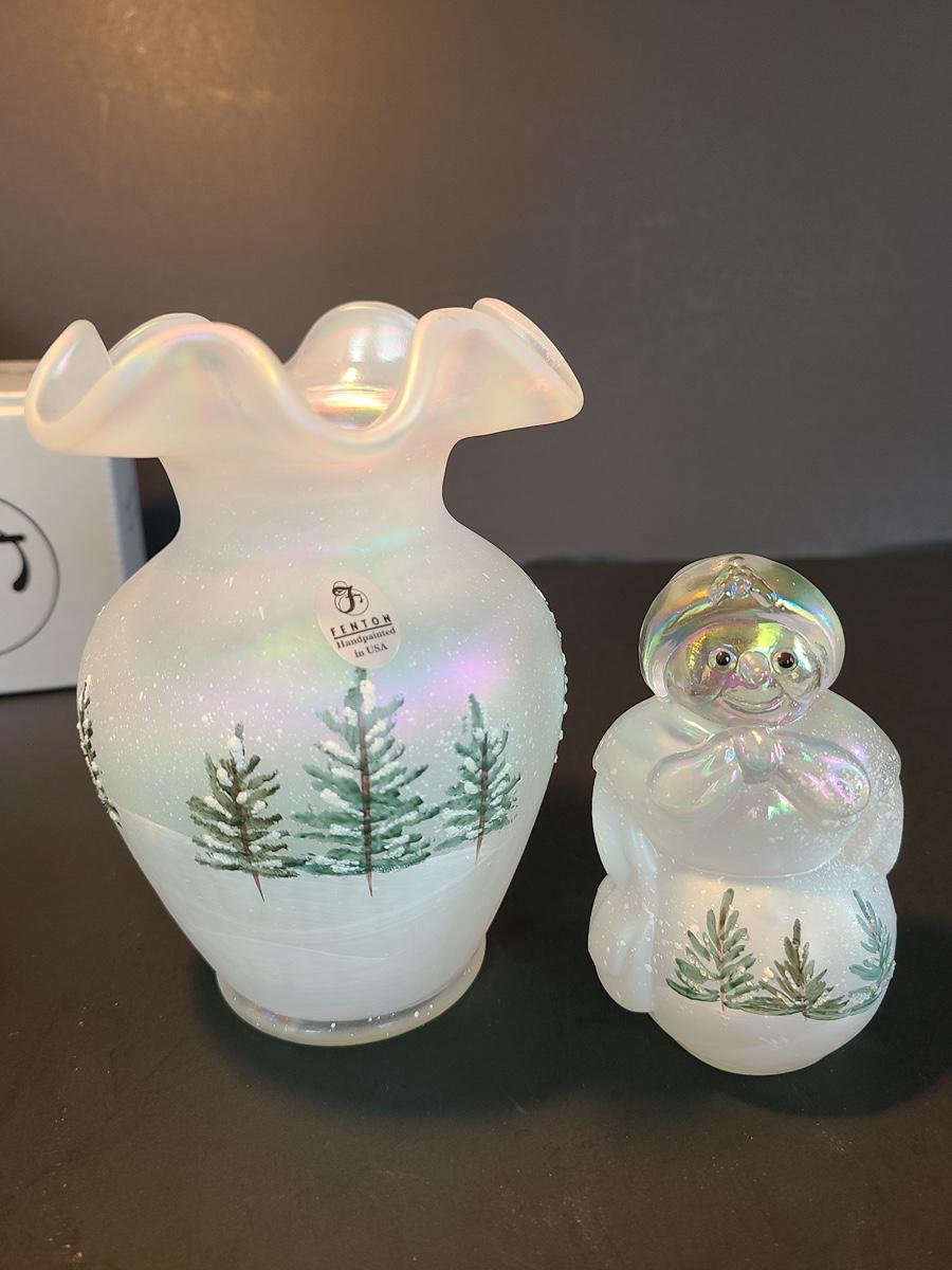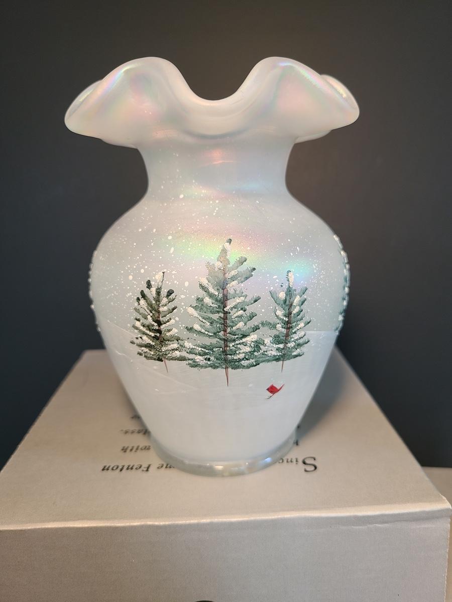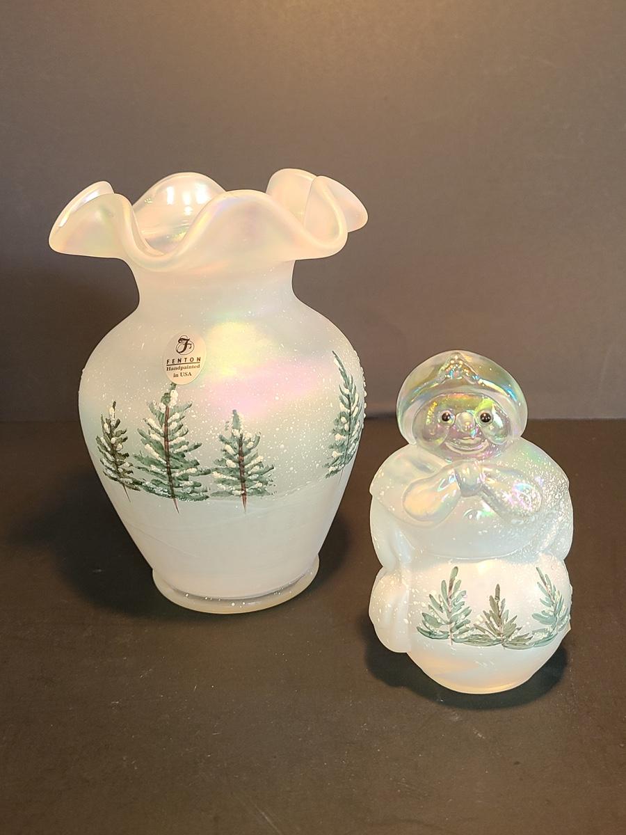 Lot 174: Fenton Woodland Frost Holiday Vase and Snowlady (Evergreens/Cardinals)