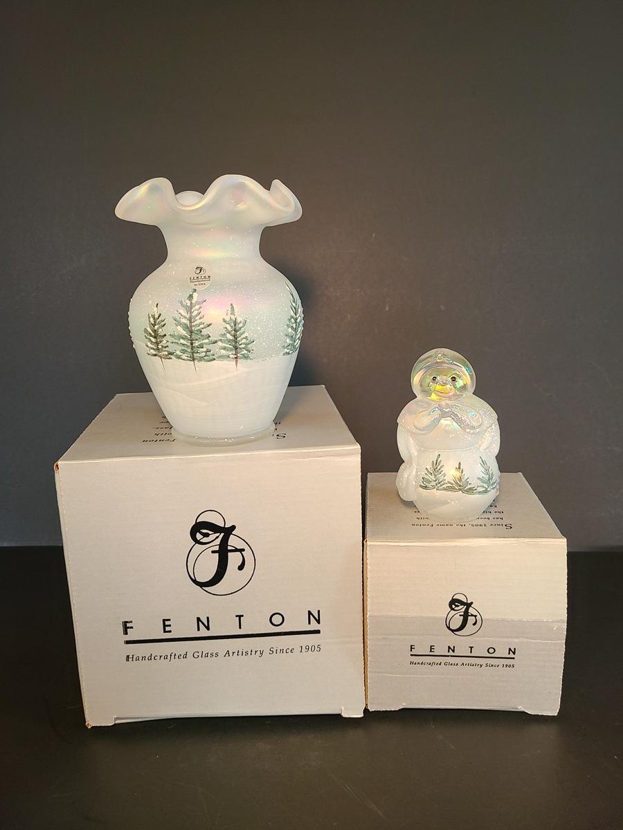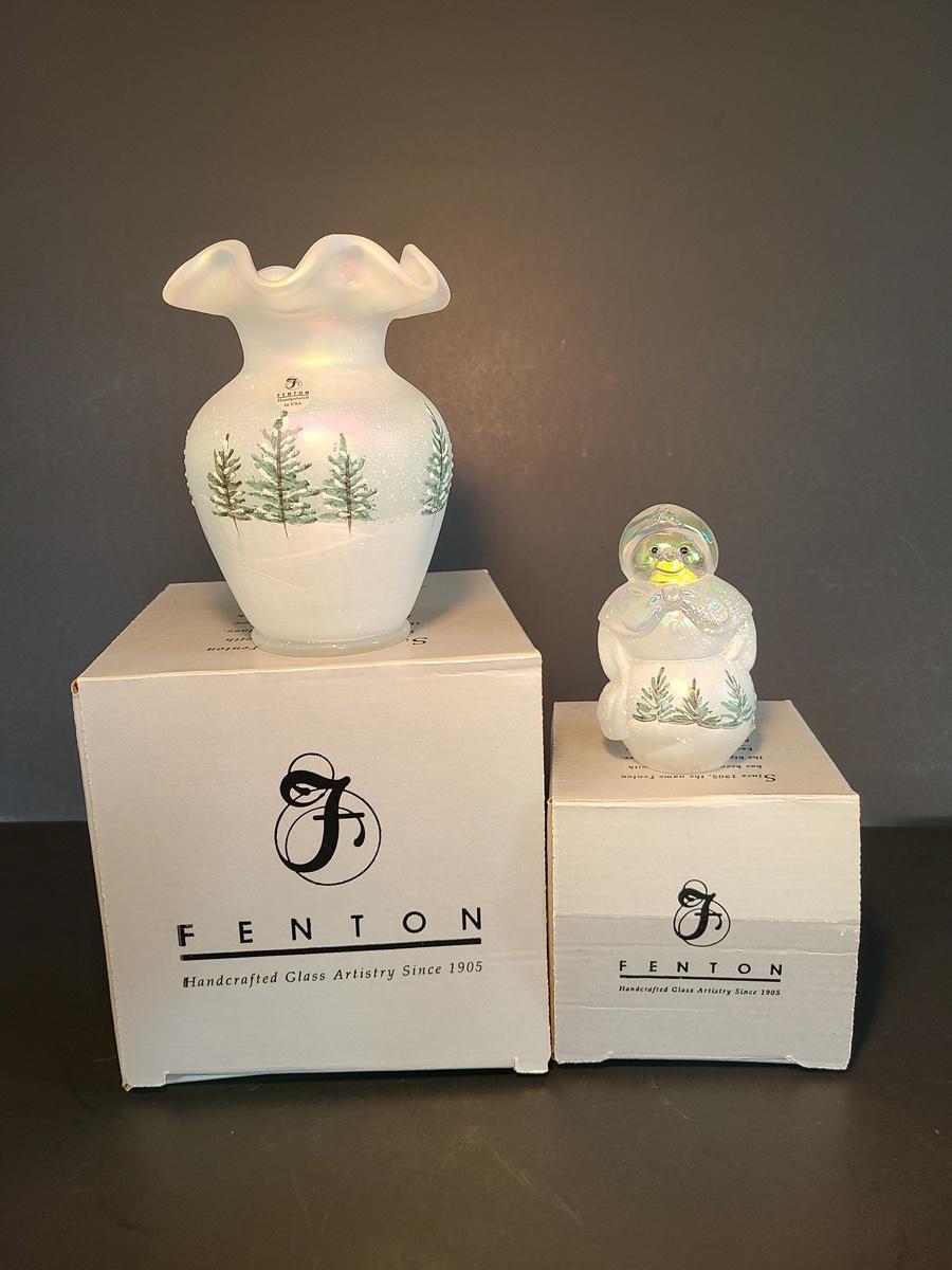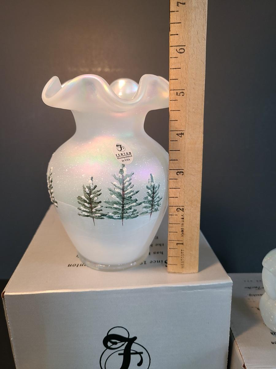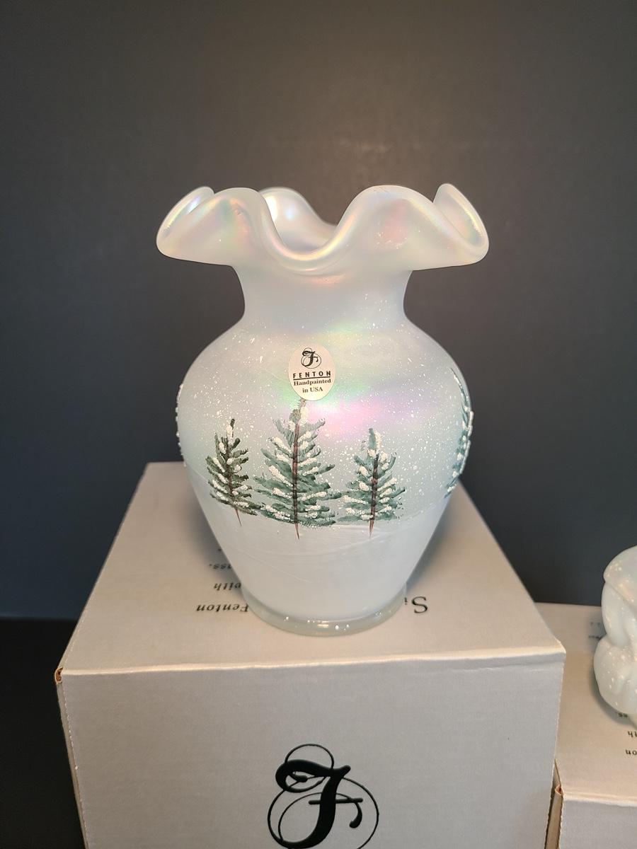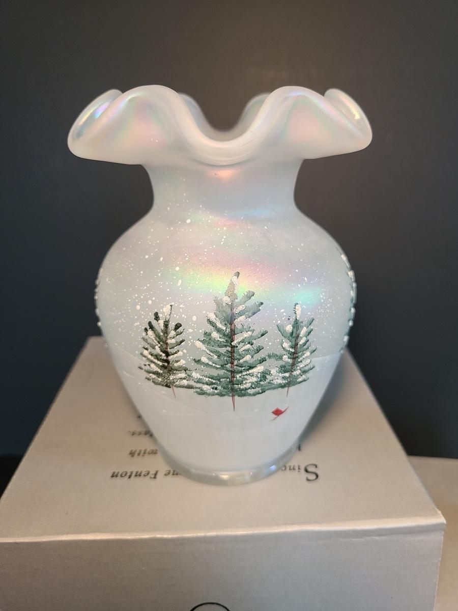 Lot 174: Fenton Woodland Frost Holiday Vase and Snowlady (Evergreens/Cardinals)